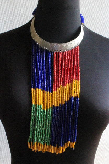 This remarkable piece showcases unparalleled craftsmanship, featuring an aluminum neckpiece adorned with delicate seed beads. The intricate design is further enhanced with the addition of captivating blue beads, exuding an aura of elegance and sophistication. To ensure a perfect fit, this masterpiece is thoughtfully equipped with an extender chain, allowing for effortless adjustment.
