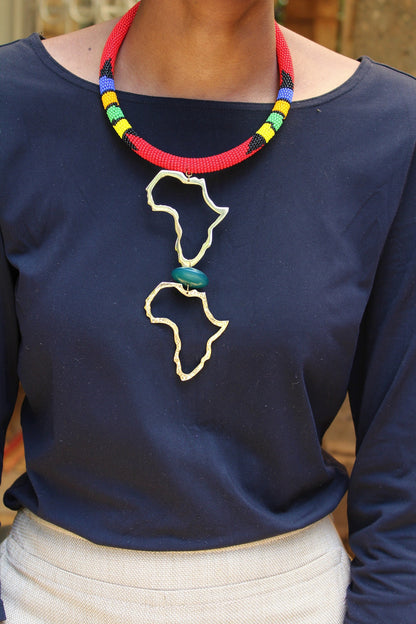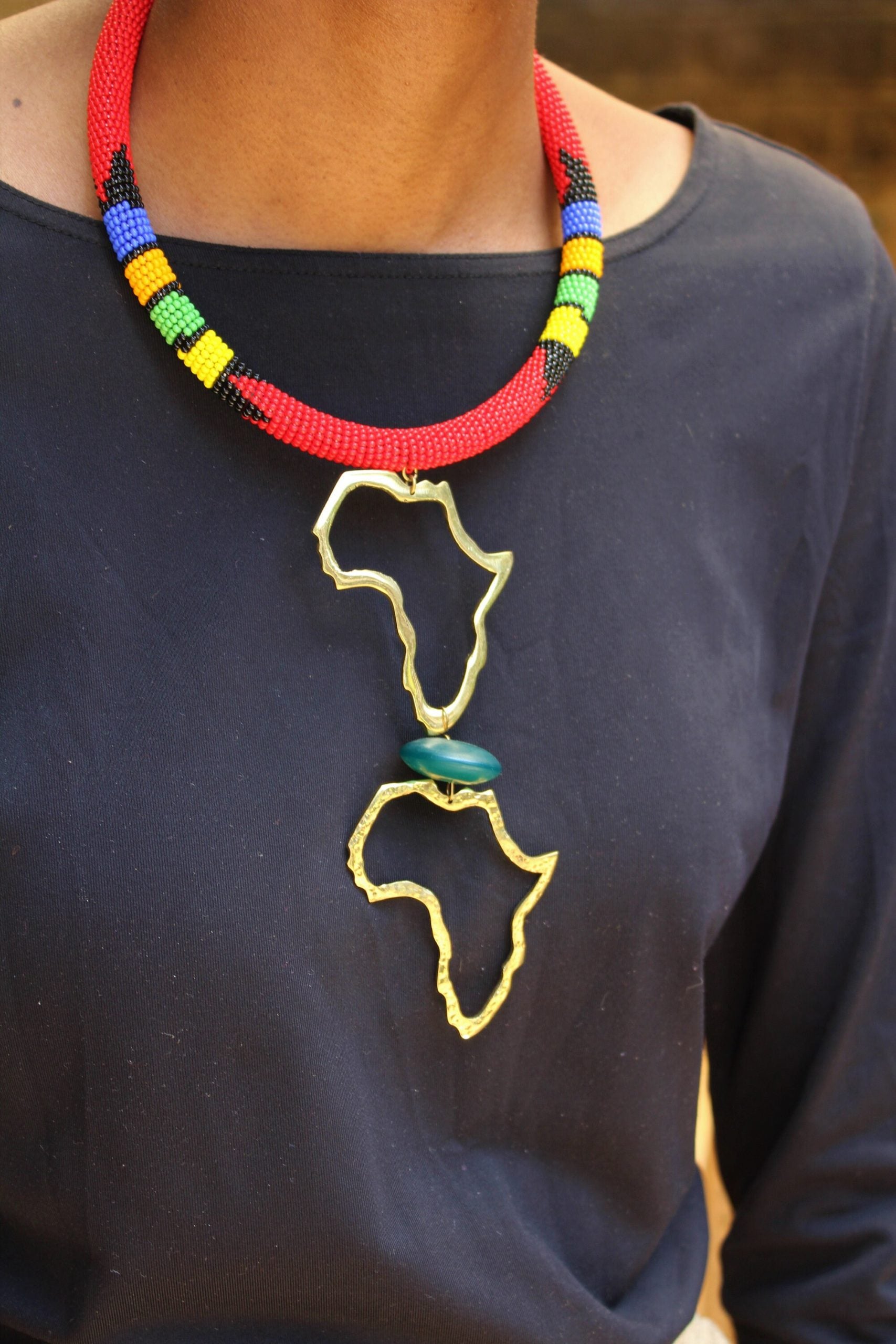 This stunning necklace showcases exceptional craftsmanship, with its meticulous creation using red seed beads and Africa brass pendants. The intricate design and attention to detail truly make it a masterpiece.