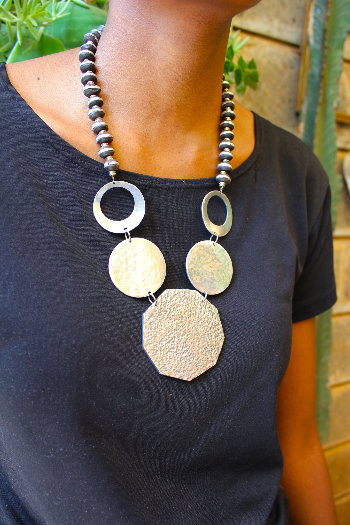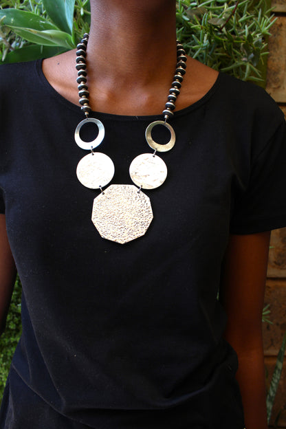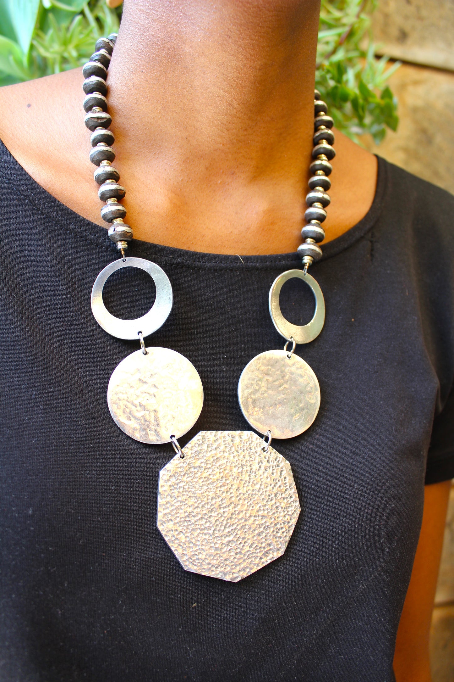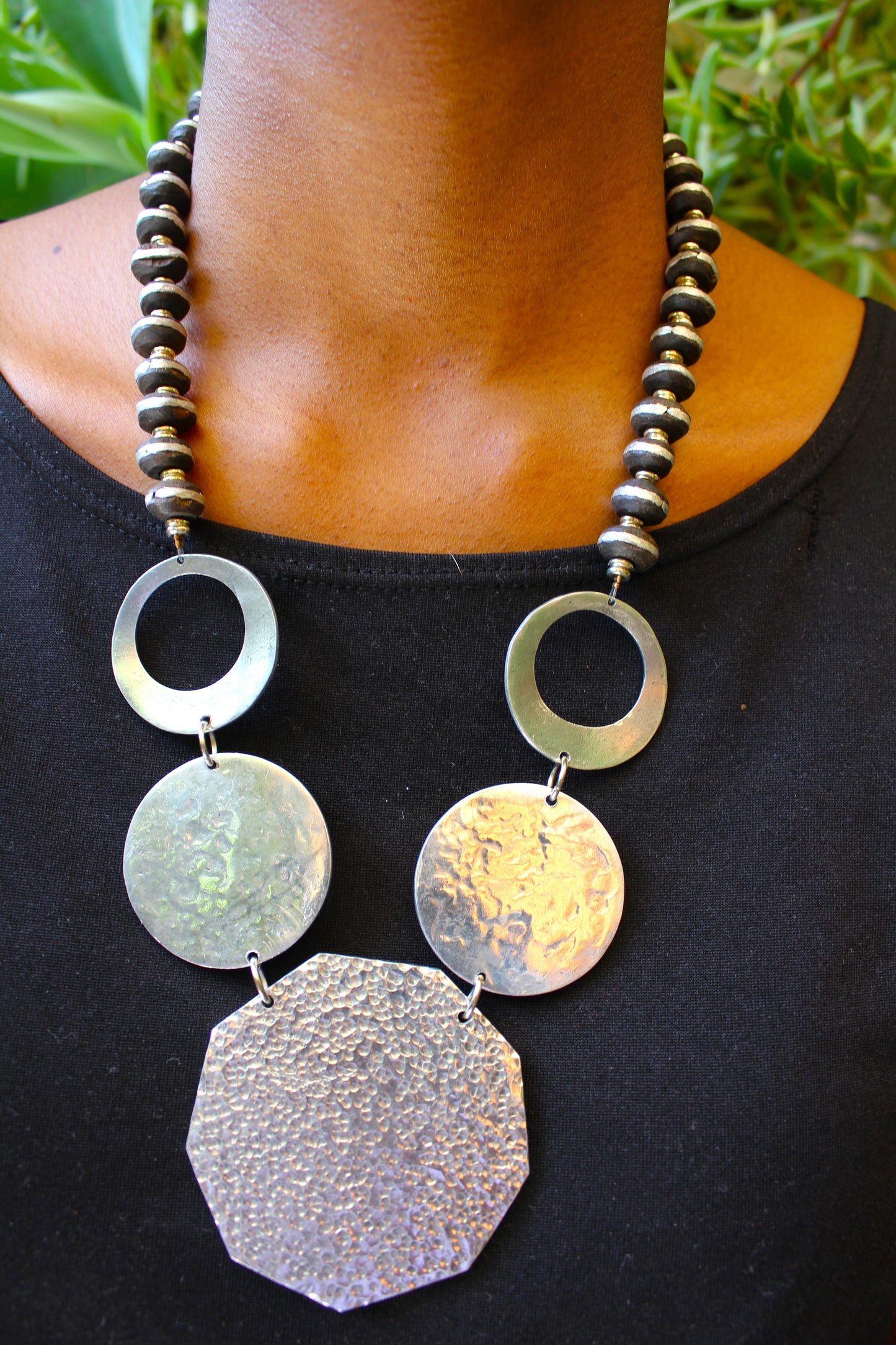 Crafted with handmade African beads, aluminum pendants and finished with an aluminum clasp and chain.