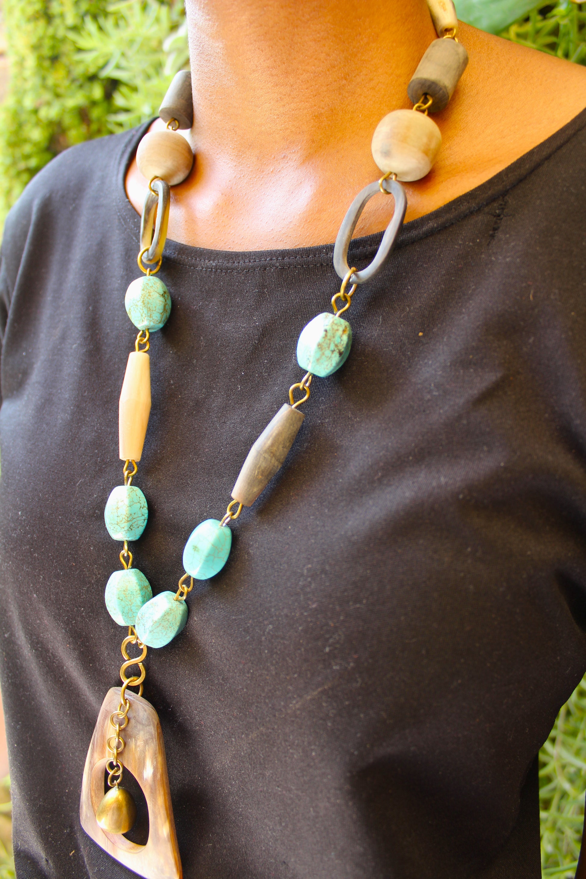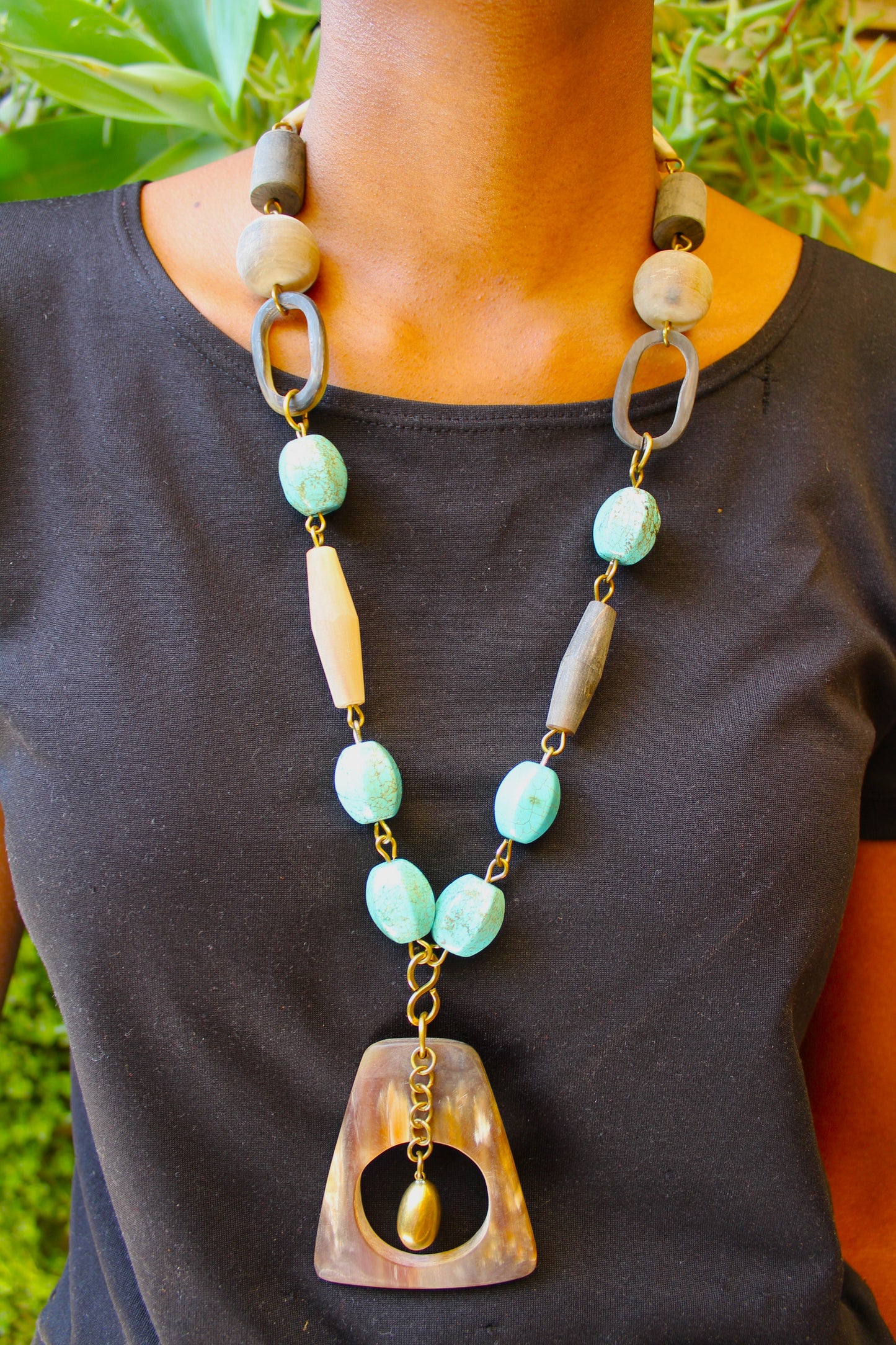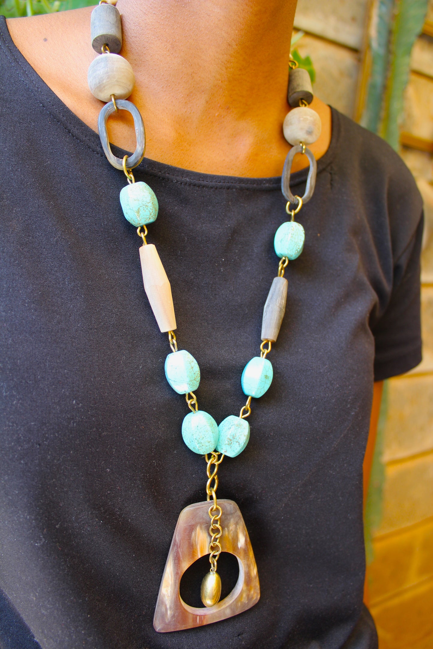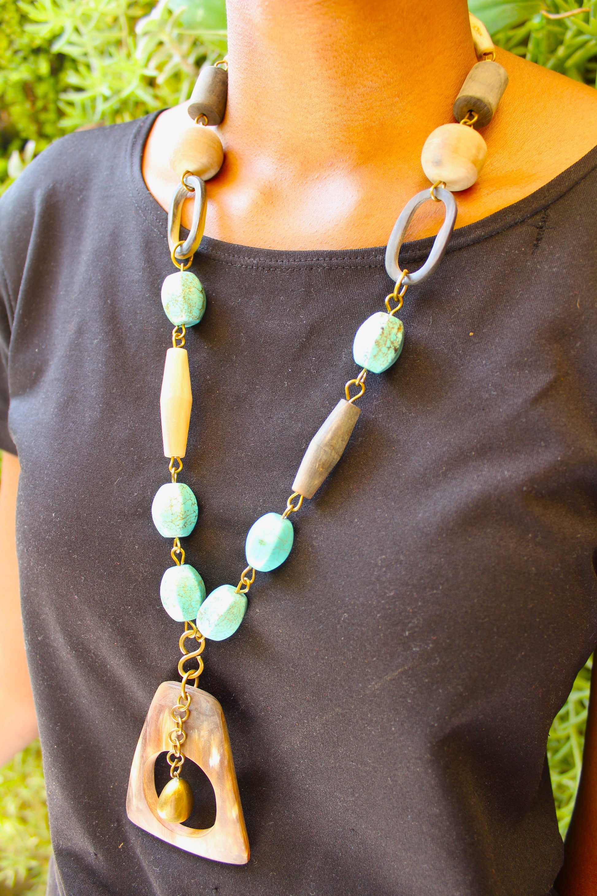 Handcrafted with a mix of vibrant turquoise and earthy horn beads, twisted together with sturdy brass wire. Complete with a brass clasp and whimsically adorned with a charming horn and brass pendant.