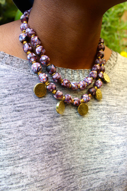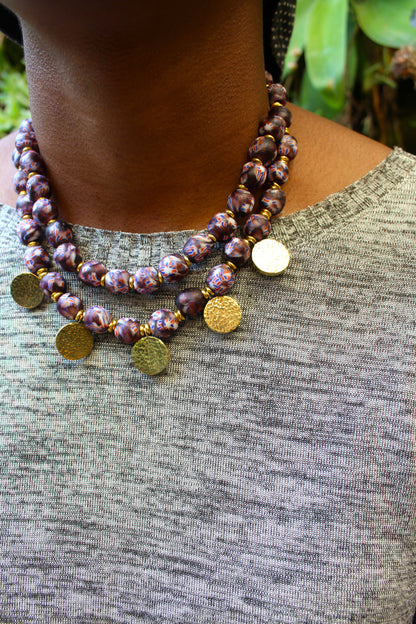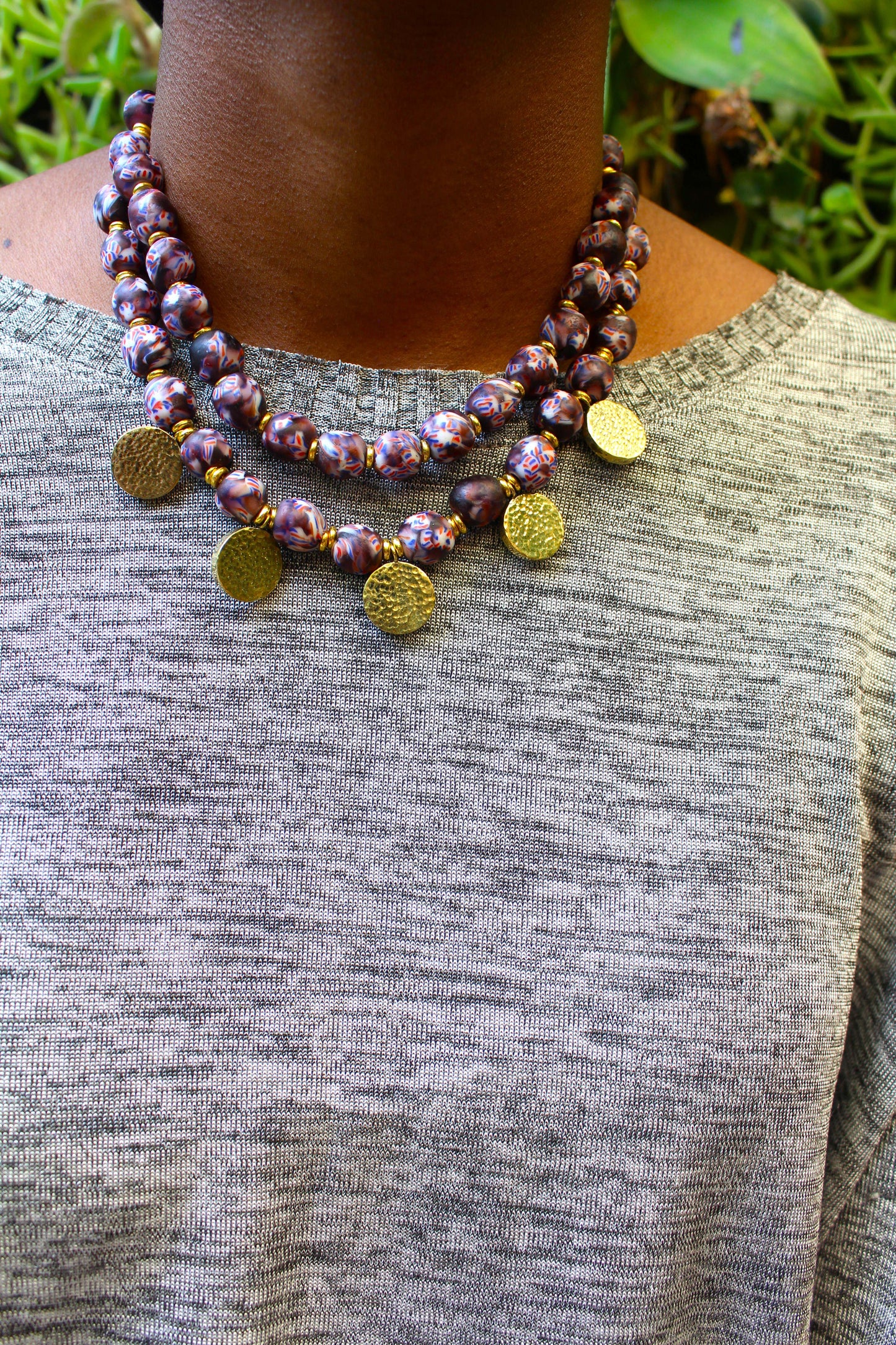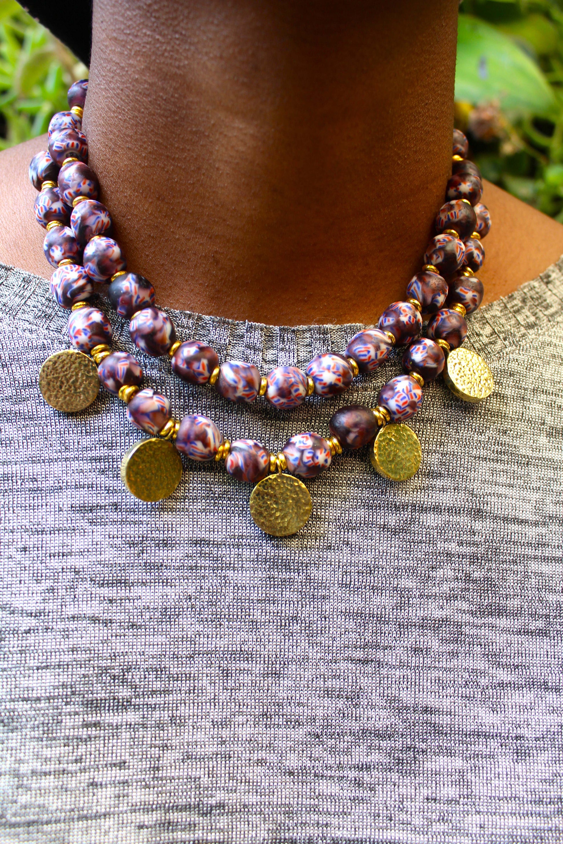 This necklace is handmade with West African beads and handcasted brass pendants. The beads are strung on a cord and finished with a brass clasp.