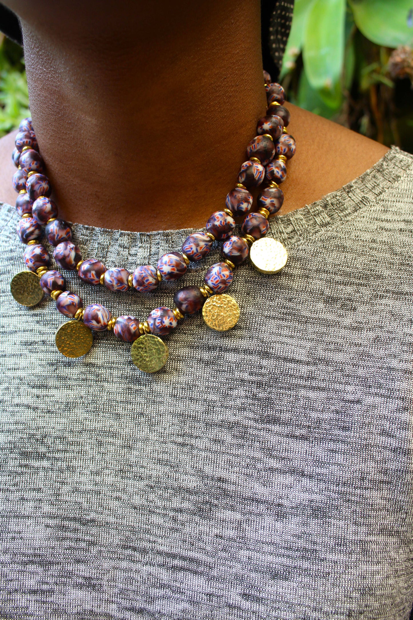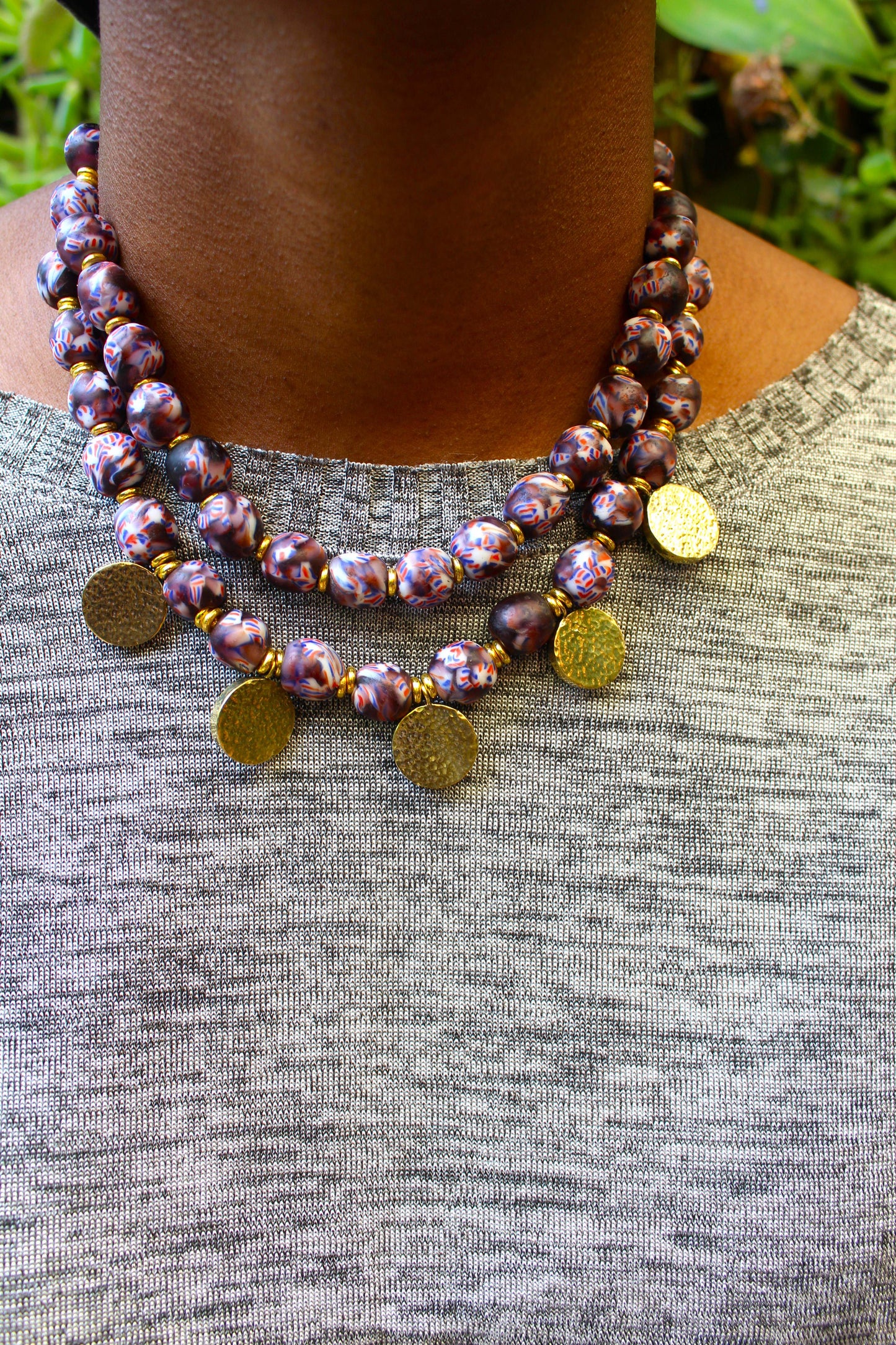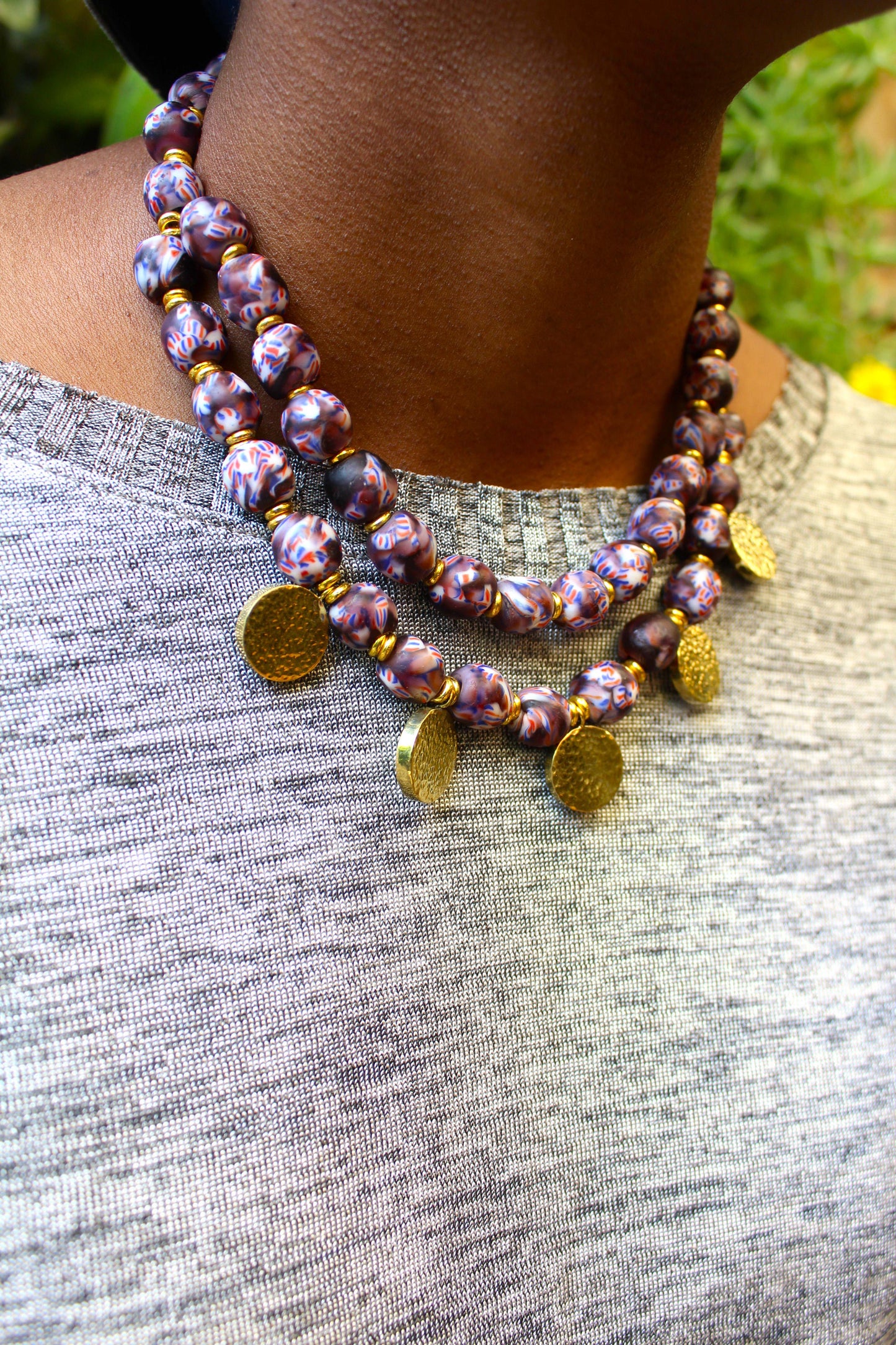 This necklace is handmade with West African beads and handcasted brass pendants. The beads are strung on a cord and finished with a brass clasp.