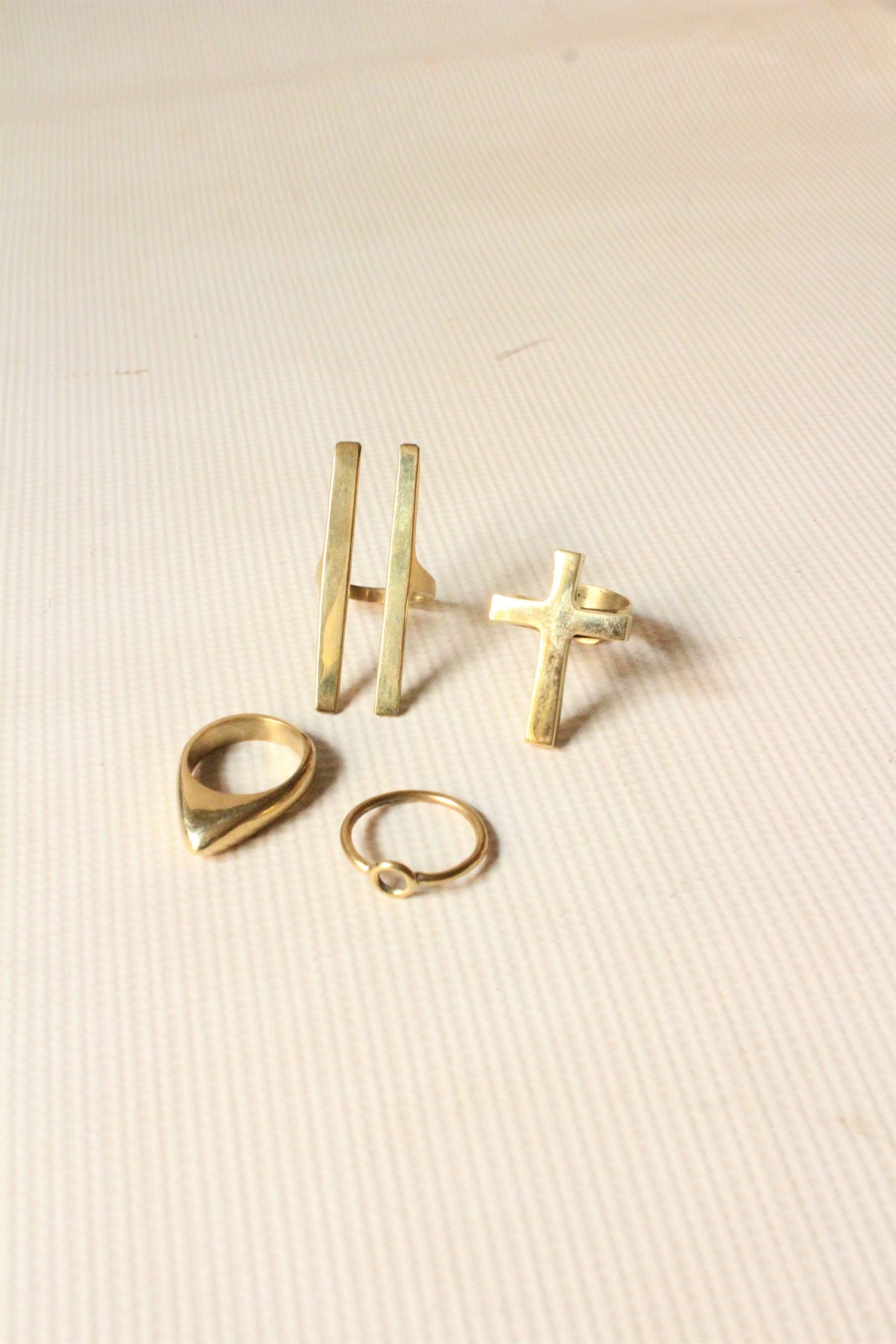This Chikodi Set is an effortlessly stylish addition to any wardrobe. Handcrafted in Kenya with pure brass, this four-ring set features a cross ring (7 US, adjustable), a pointy ring (7 US), a simple circle ring (7 3/4 US), and an open bar ring (7 US, adjustable).