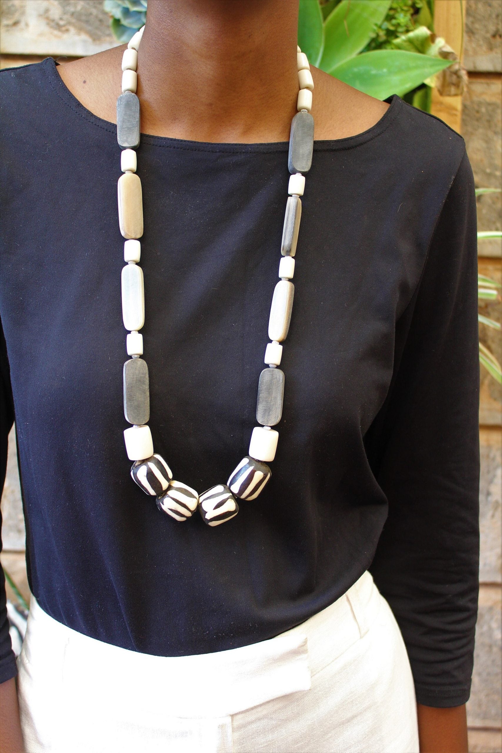 Indulge in the exquisite beauty of this handmade necklace, crafted with utmost precision and care in Nairobi, Kenya. The necklace boasts a unique design that is sure to turn heads and make a statement. The mix of horn beads used in the creation of this masterpiece is ethically sourced, ensuring that you not only look good but also feel good about your purchase.