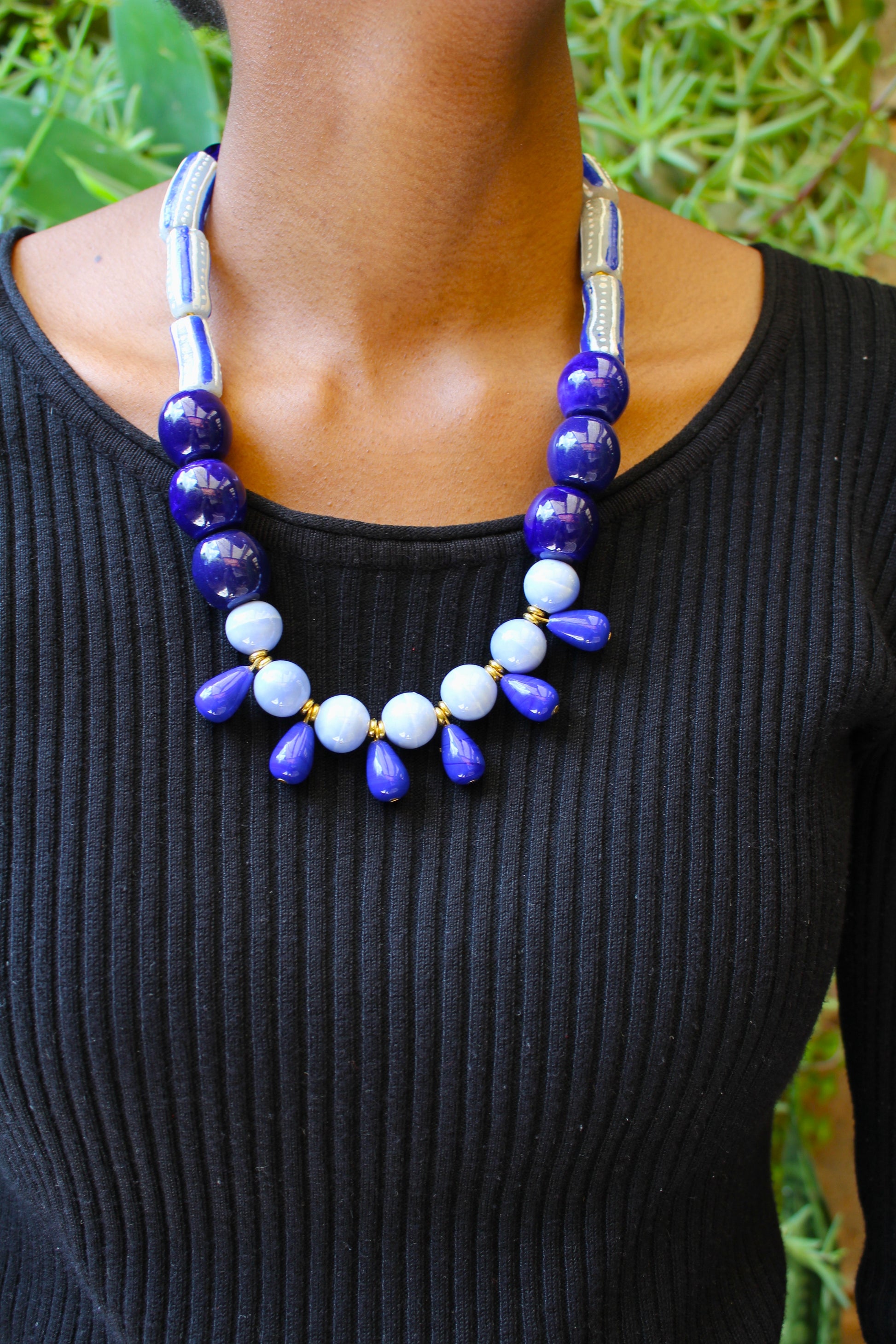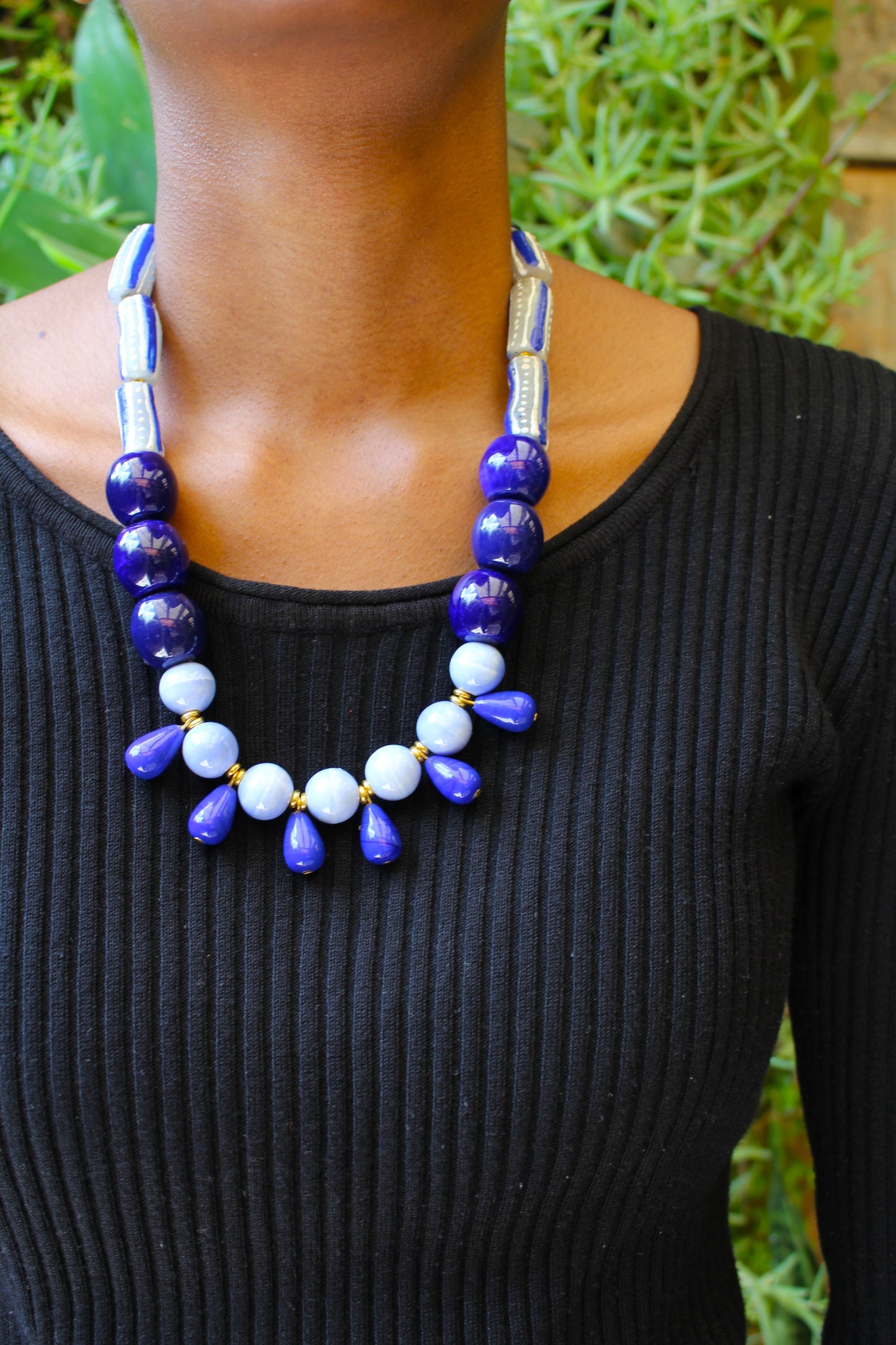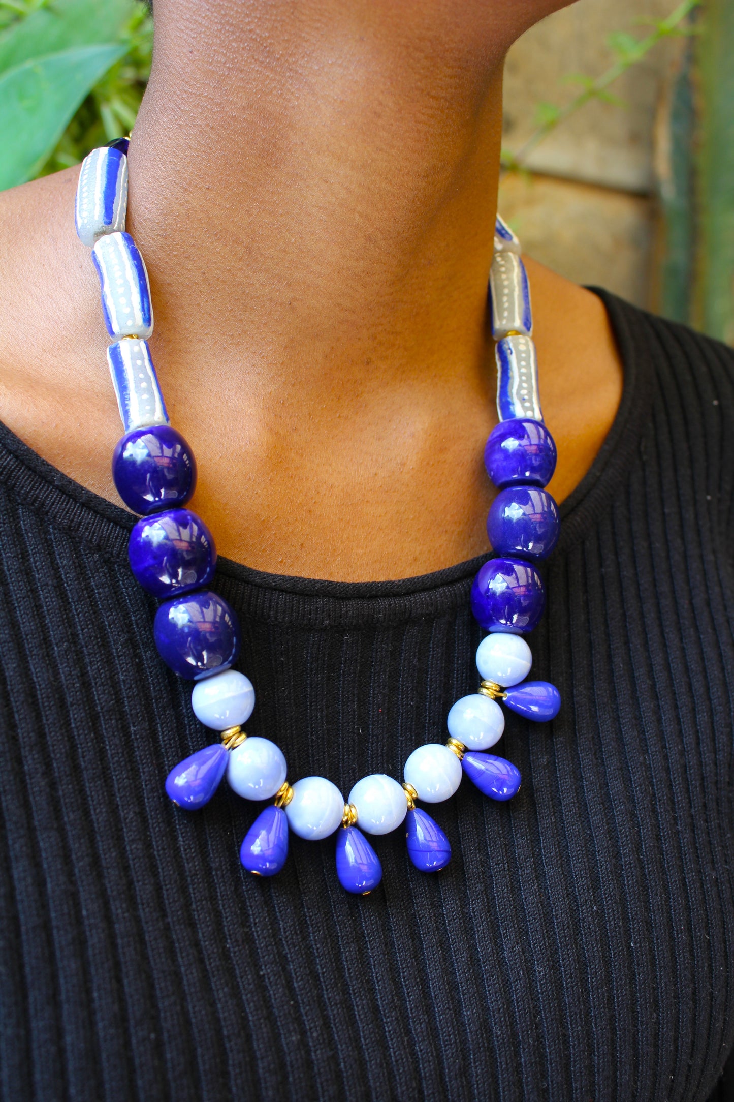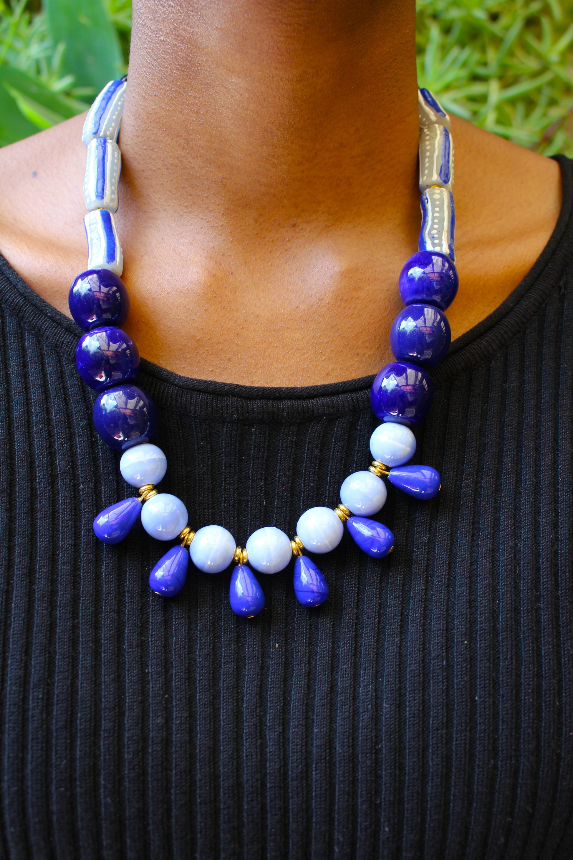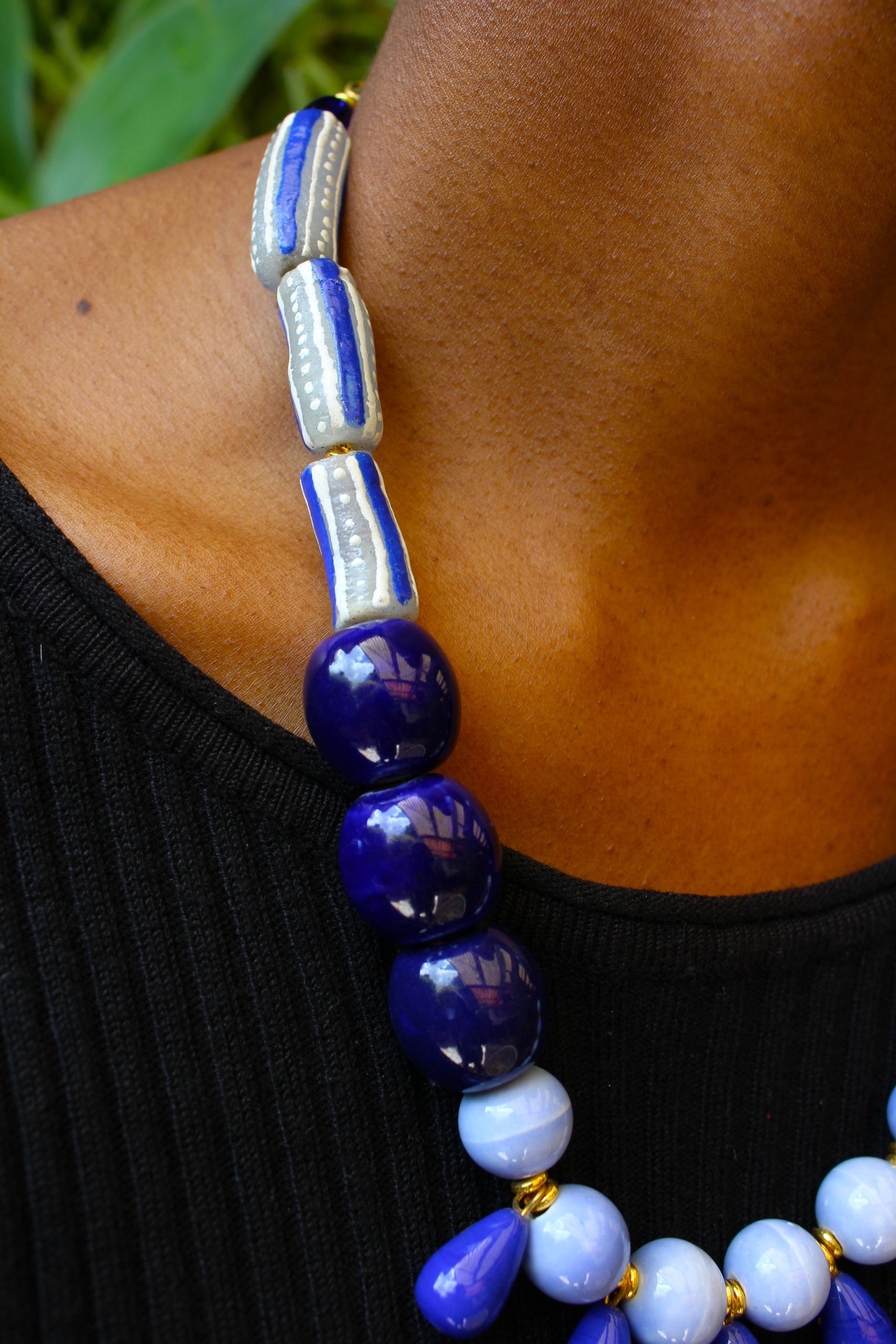 Add a pop of color to your outfit with our hand-crafted blue bead mix necklace.
