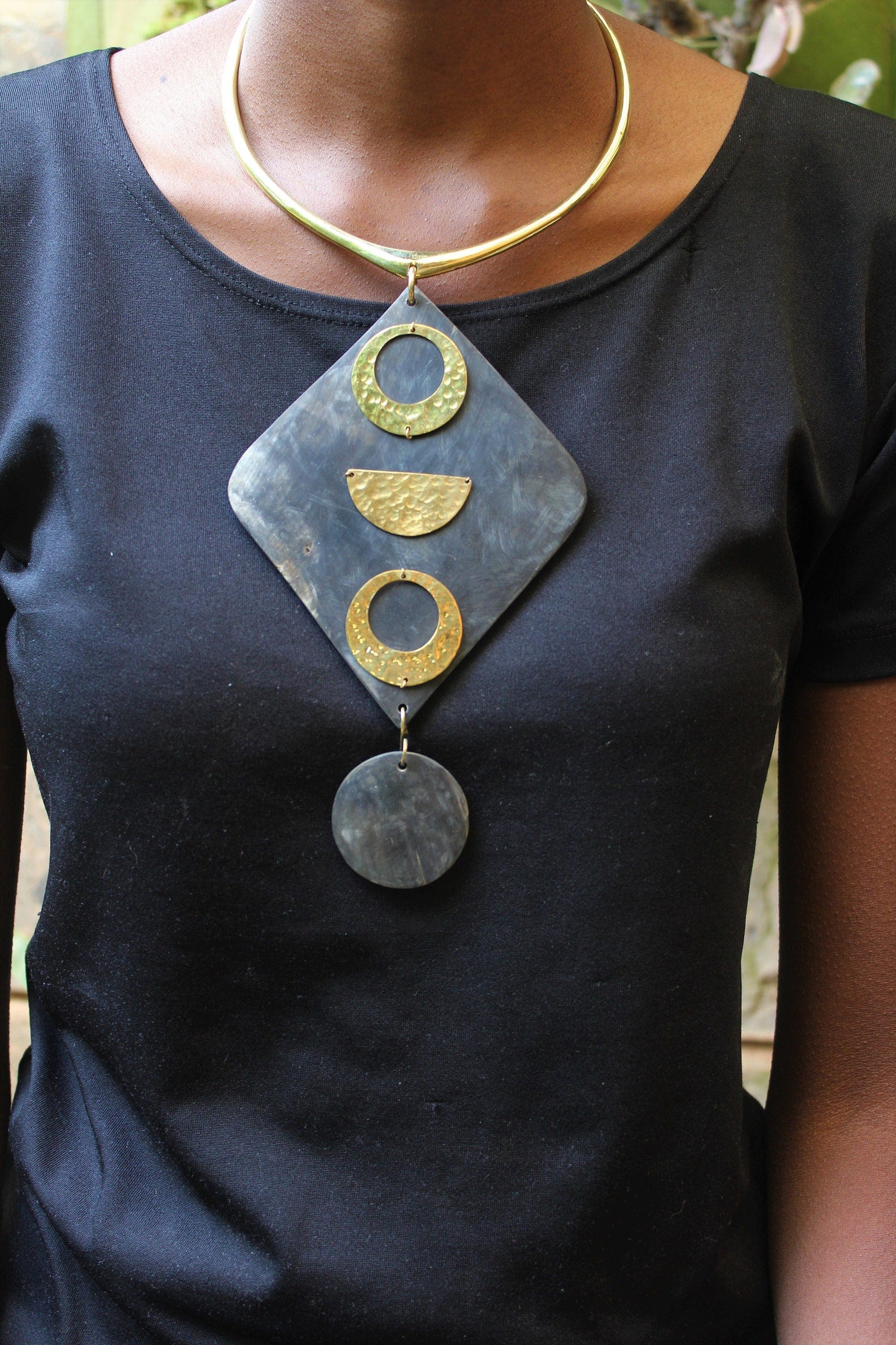 Made with artistry in Kenya, this necklace features a sumptuous horn pendant that is carefully fastened with gleaming brass wire to a complementary brass pendant, visible at the back. Necklace length: 32.5 Centimeters