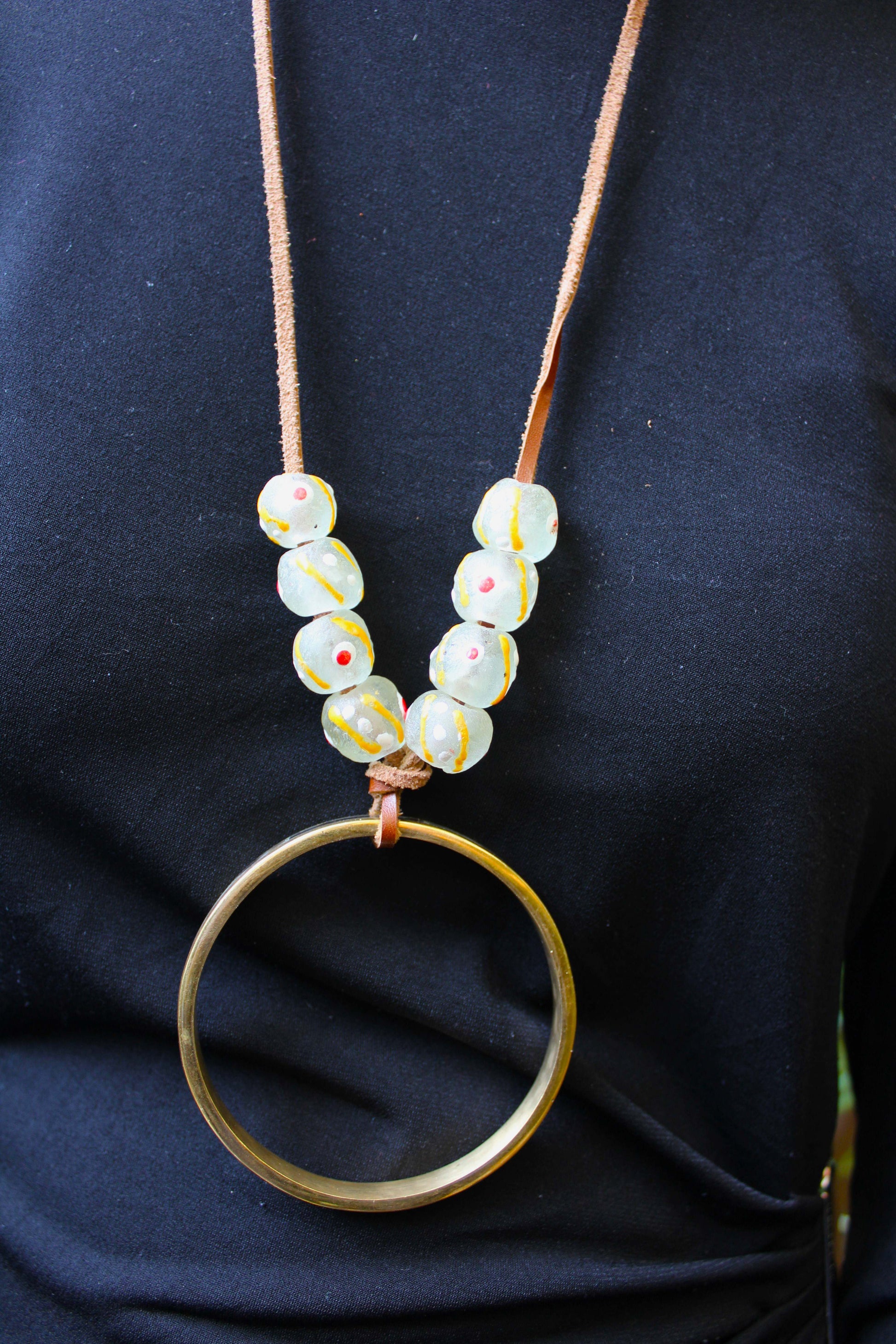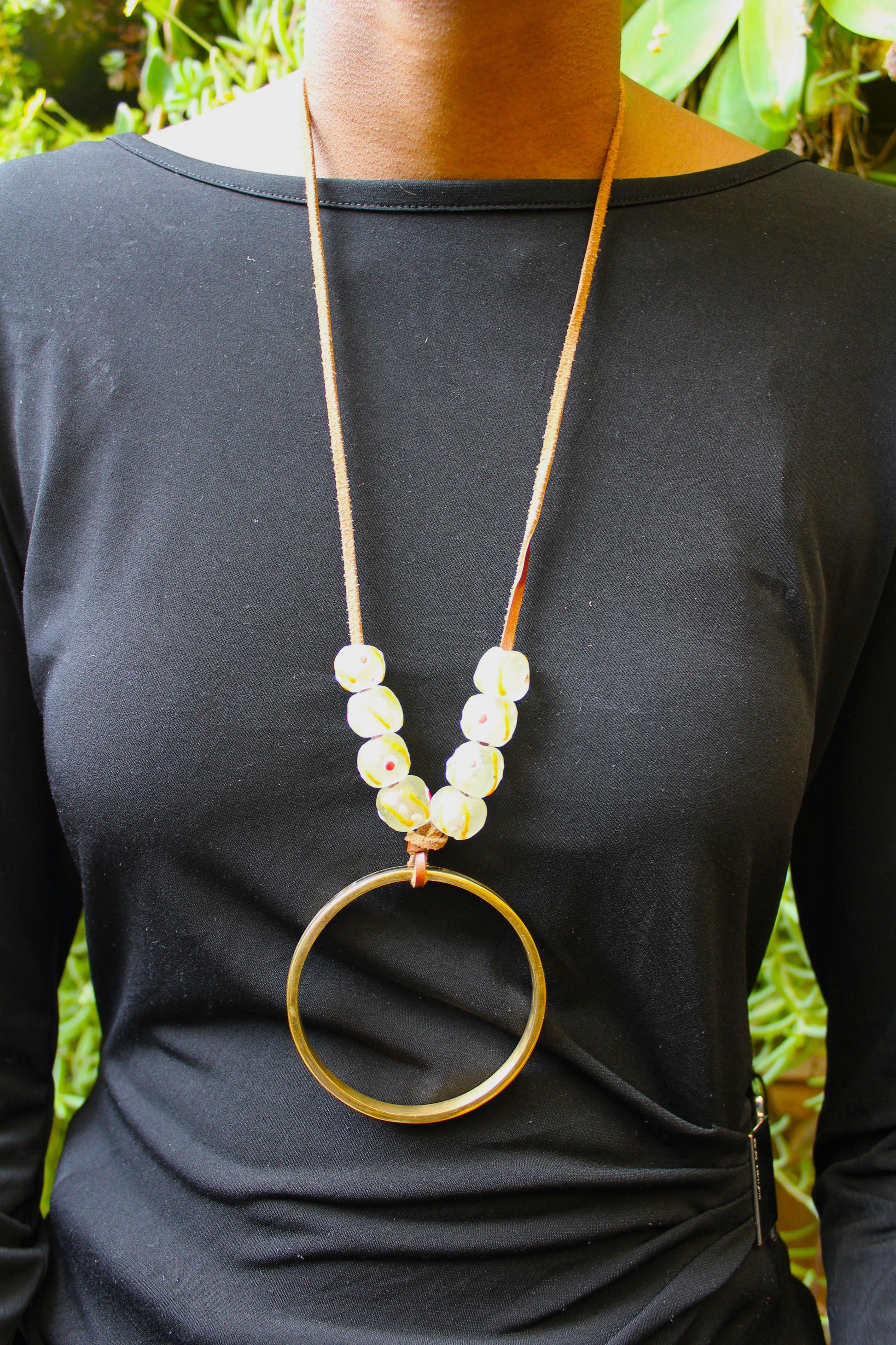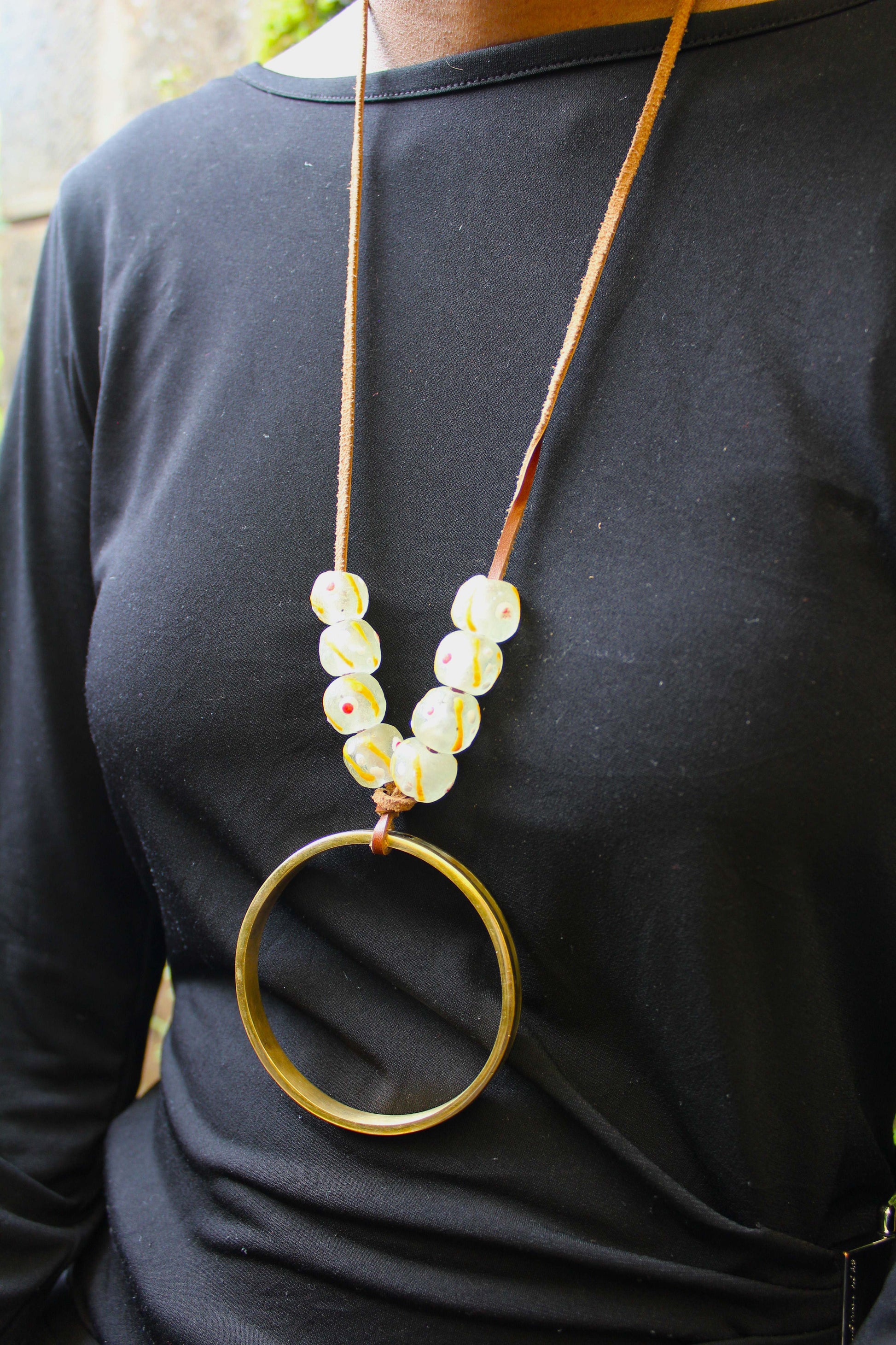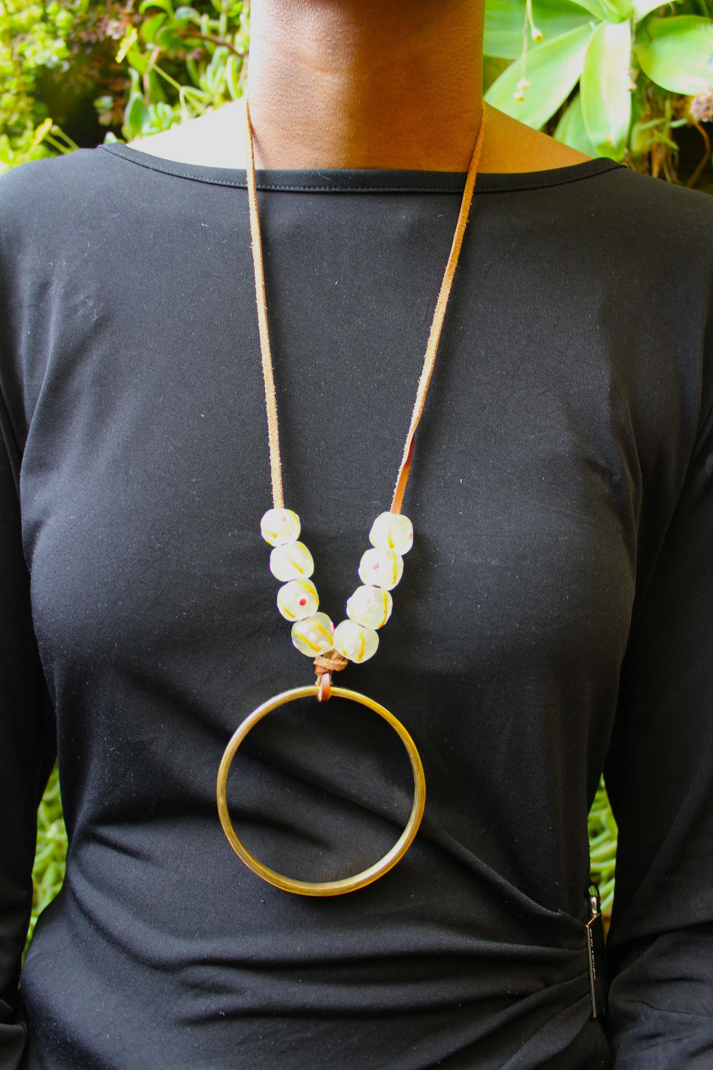 The centerpiece is a striking brass and horn circle pendant, and the necklace is strung on a leather cord.