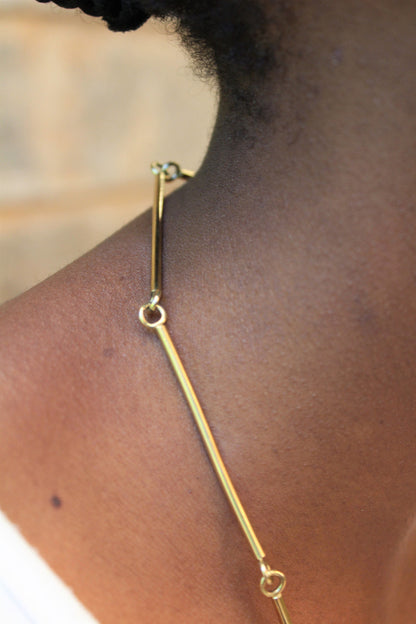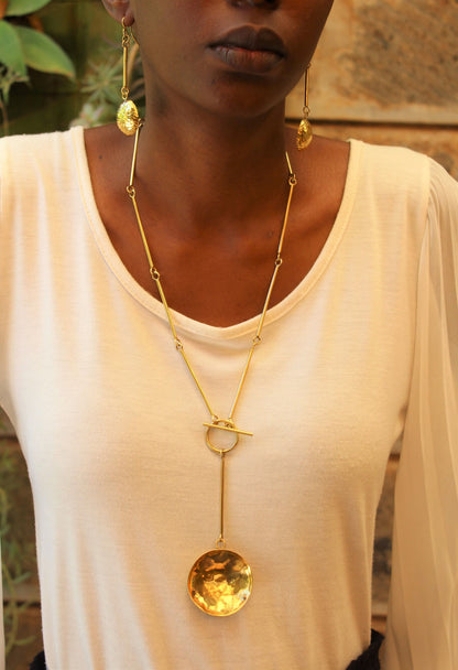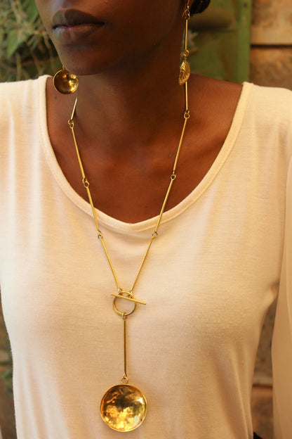 Handmade in Nairobi, Kenya! We crafted this piece with a brass pendant in the shape of a half-dome and a clasp placed in the front. Plus, it comes with a pair of earrings! Necklace length- 40.5cm, Earrings Length- 7cm.