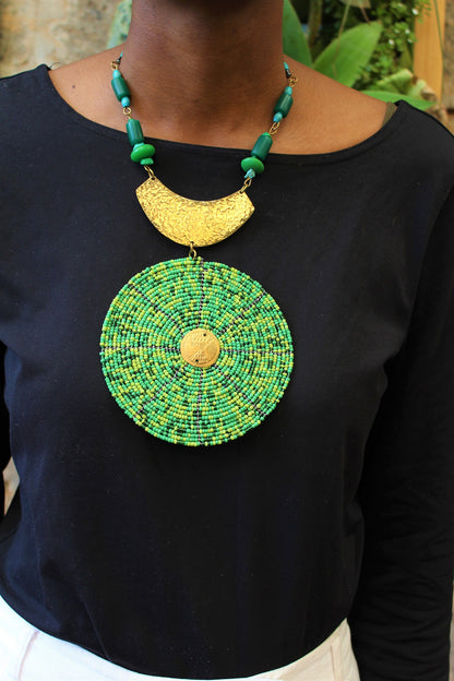 Handcrafted in Nairobi, Kenya, this necklace features brass and green and gold seed beads, plus a maasai beaded pendant, all finished with a brass clasp. With an adjustable length of 33.5 centimeters, this stylish piece is sure to stand out.
