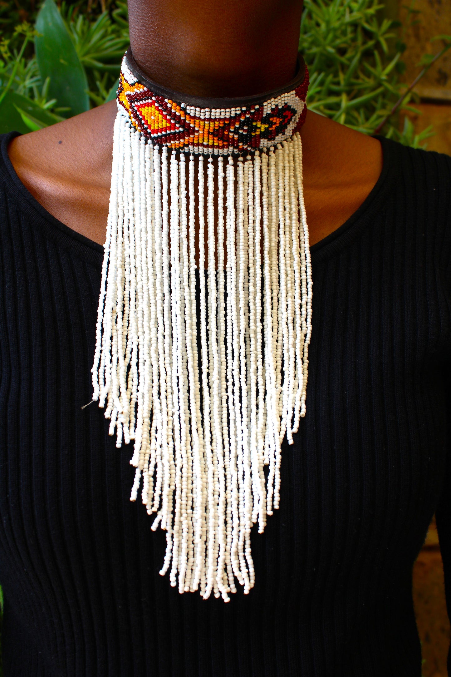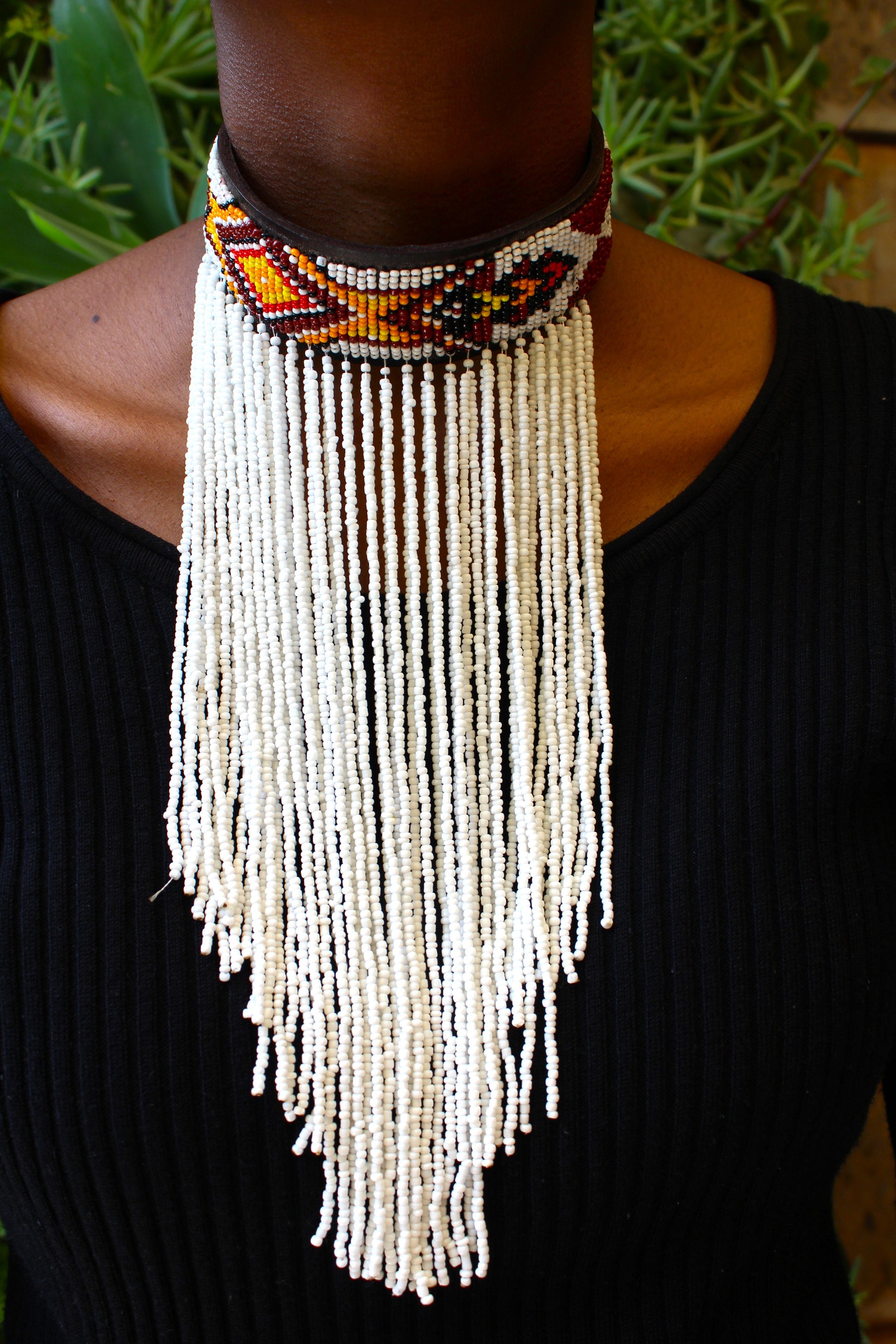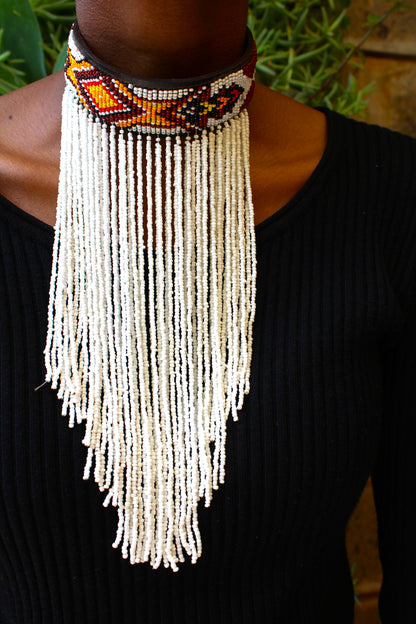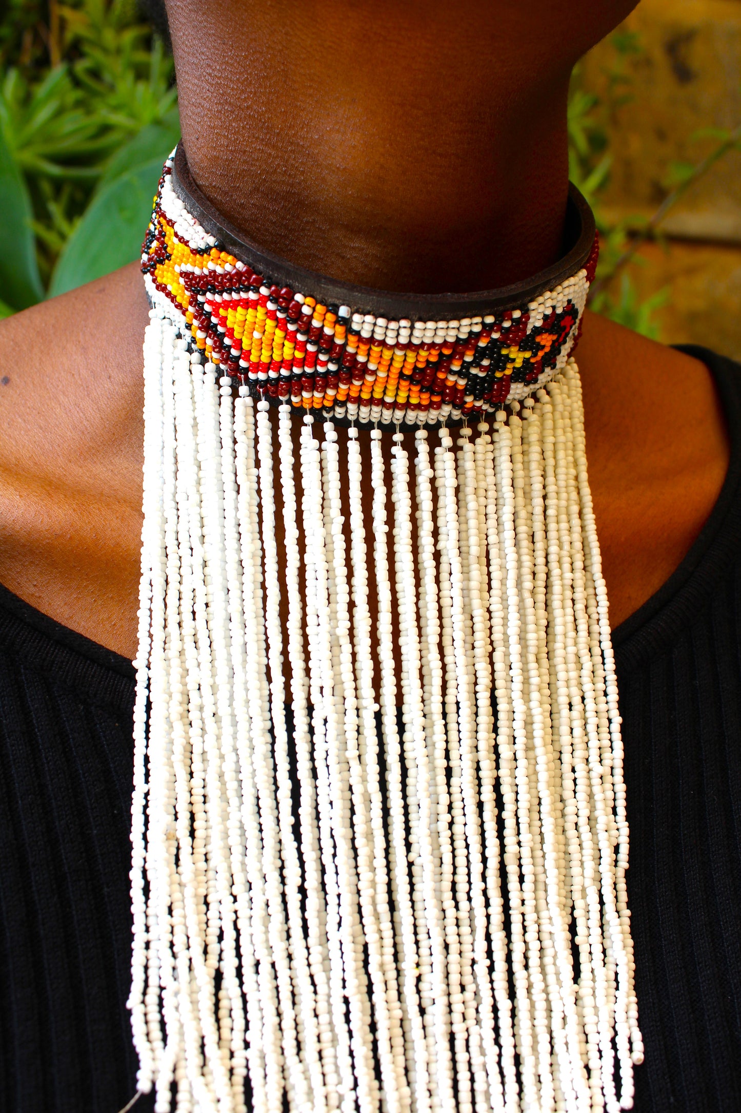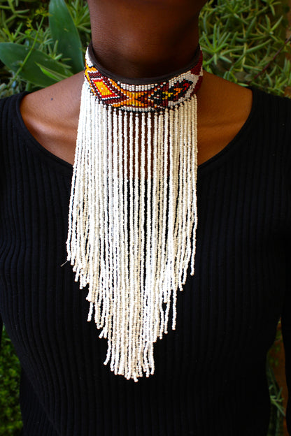 Handcrafted with high-quality, vibrant seed beads, this necklace is a beautiful and eye-catching accessory. The choker area is backed with leather.