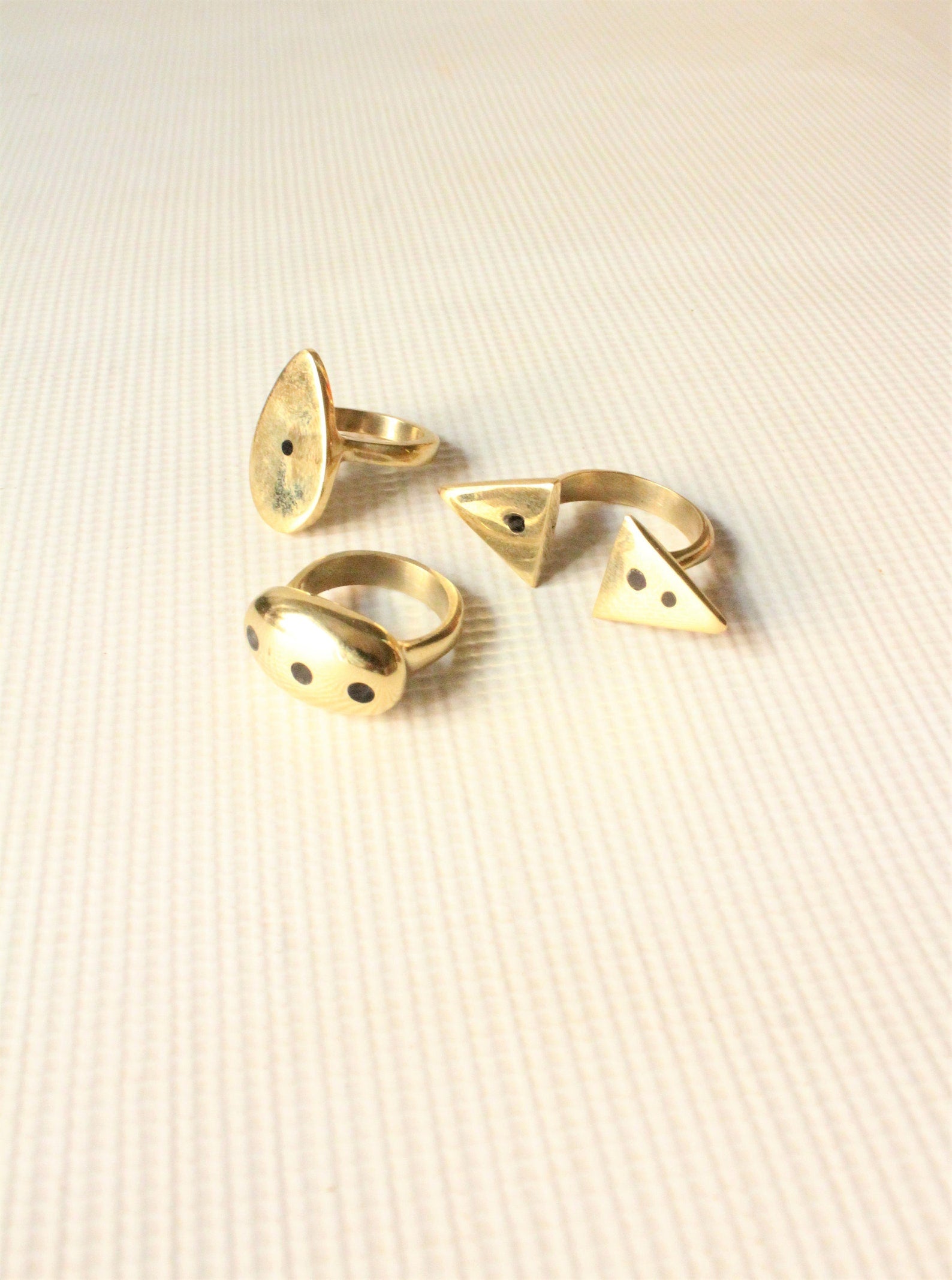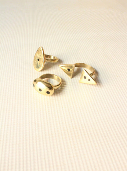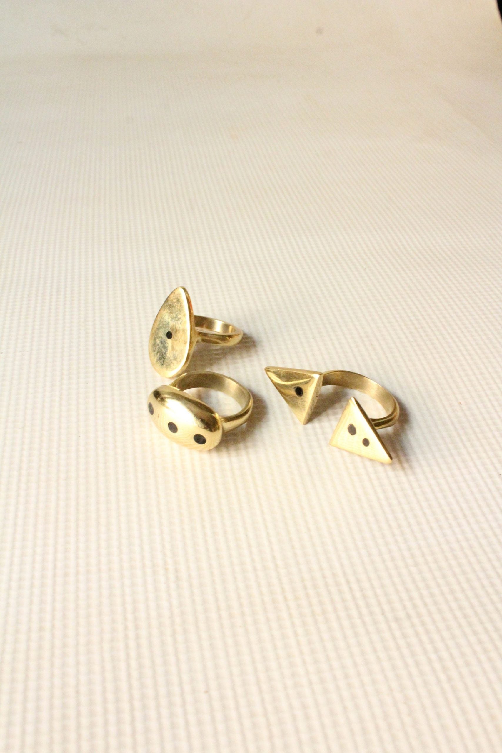 Expertly crafted in Kenya with brass and horn, this set of 3 rings is a luxurious addition to any collection. Embrace the elegance of the Oval Curve, Teardrop, and Open Triangle designs, available in sizes 7 and 7 3/4 US. Each ring is handmade and adjustable for a perfect fit. Elevate your style with this exclusive and tasteful Hasi Ring Set.