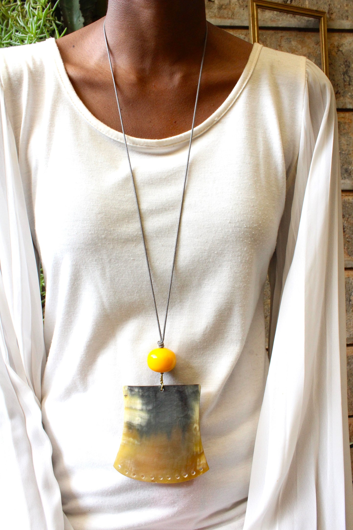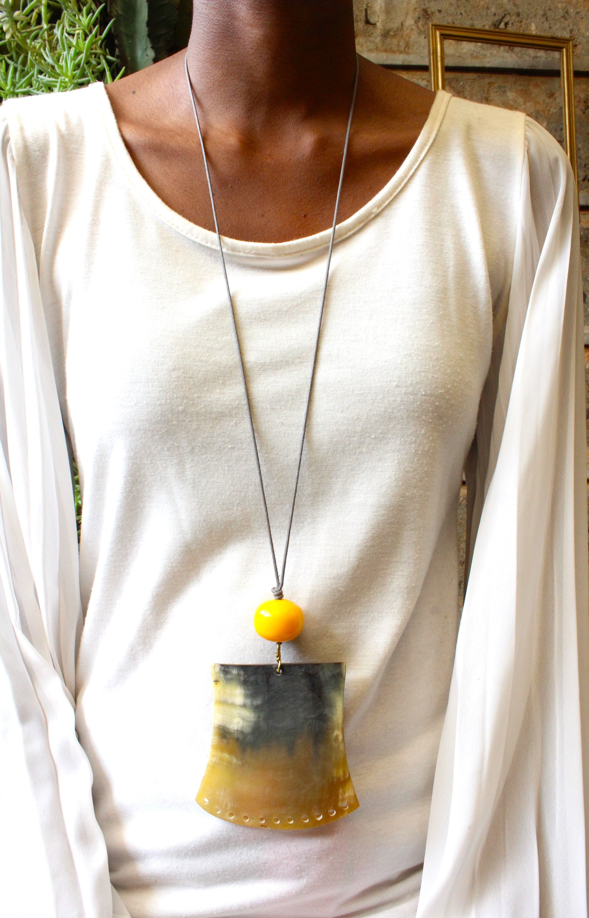 Embrace your bold side with this hand crafted necklace featuring a vibrant yellow African bead, a unique horn pendant, and a no-clasp design. At 54 cm, it's perfect for adding a touch of eccentricity to any outfit.