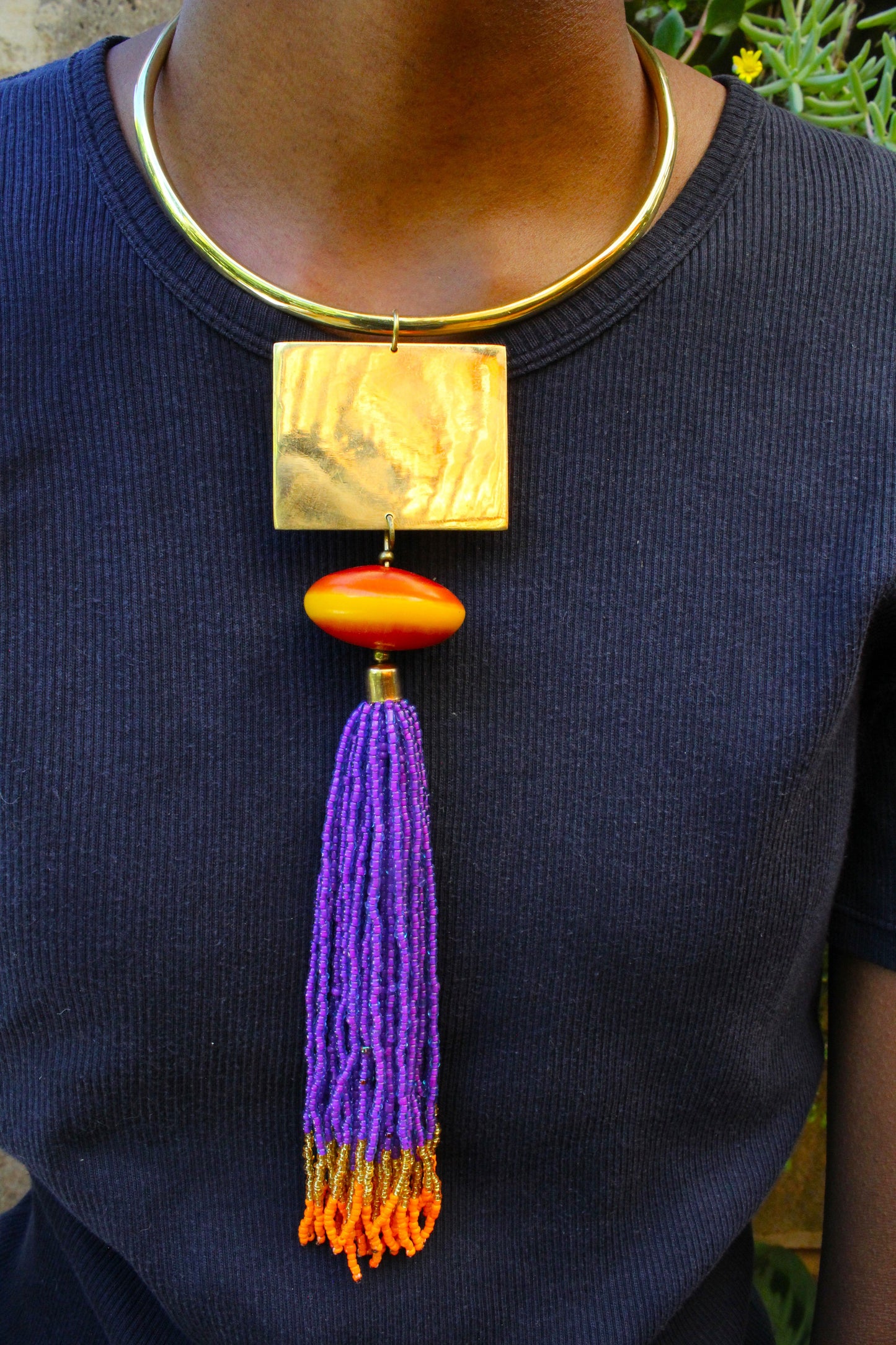 Skillfully handcrafted in Kenya, this exquisite necklace features delicate seed beads and a stunning brass pendant and neckpiece. The elegant design is completed with a sturdy brass clap, ensuring a secure fit. The neck width measures 12.5cm, making this piece a perfect addition to any jewelry collection.