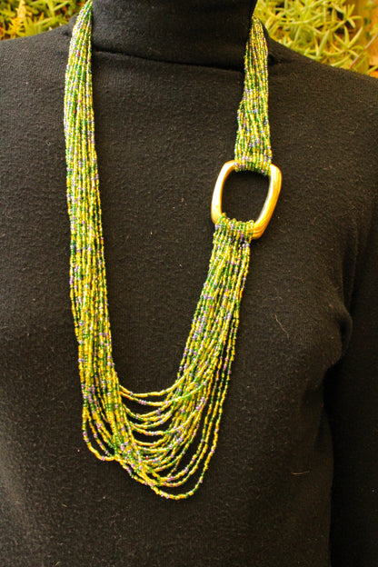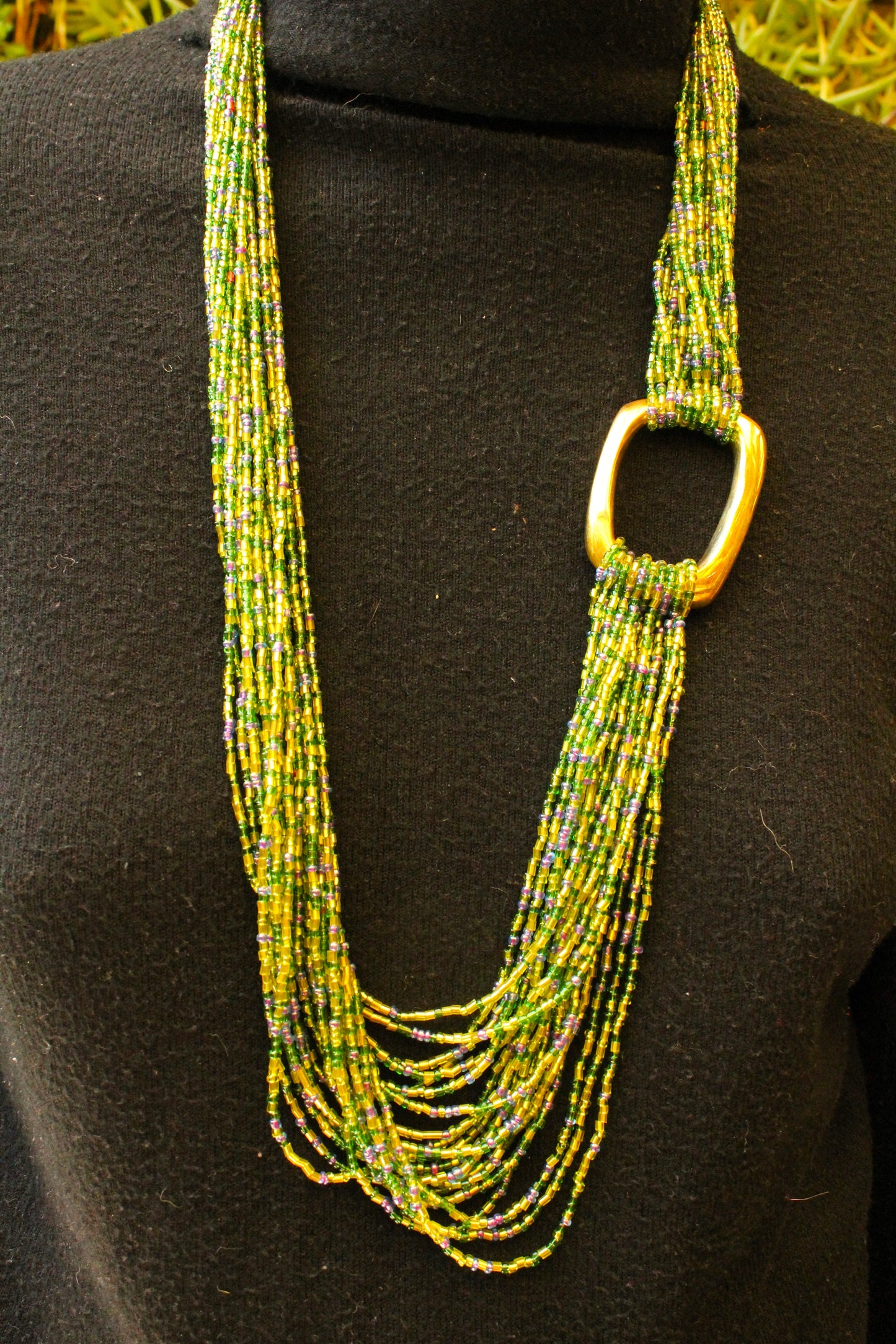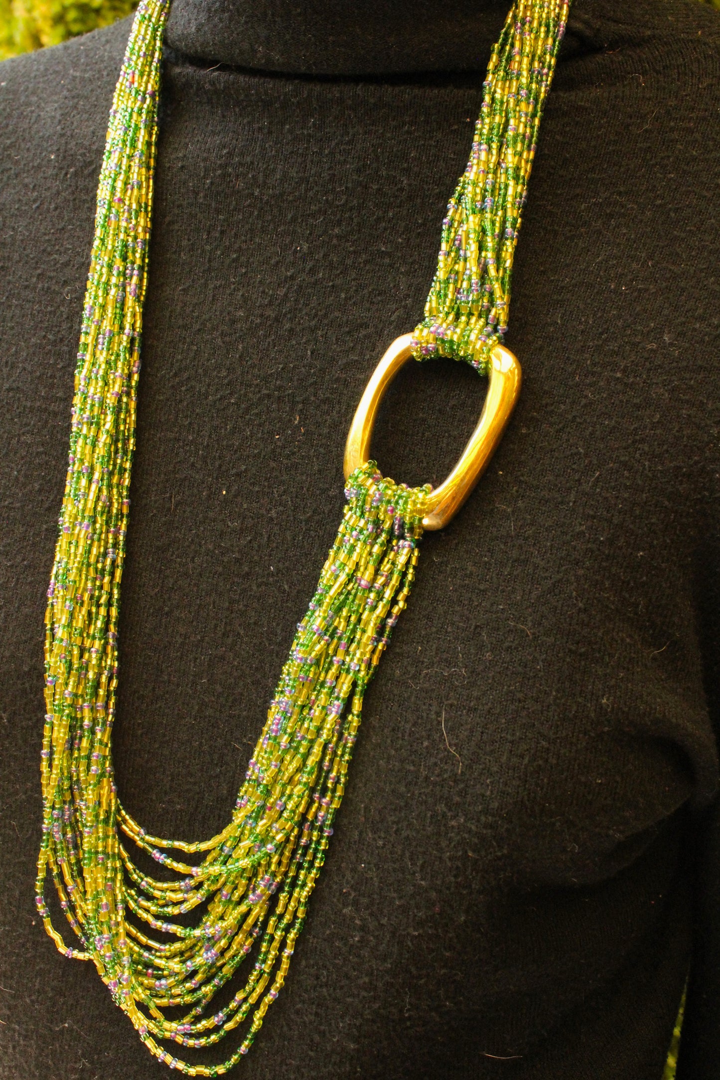 Accented with a delightful array of green seed beads, this remarkable creation encapsulates the splendor of the natural world. The brass clasp guarantees a secure and comfortable wear, making it an ideal accessory for any event.