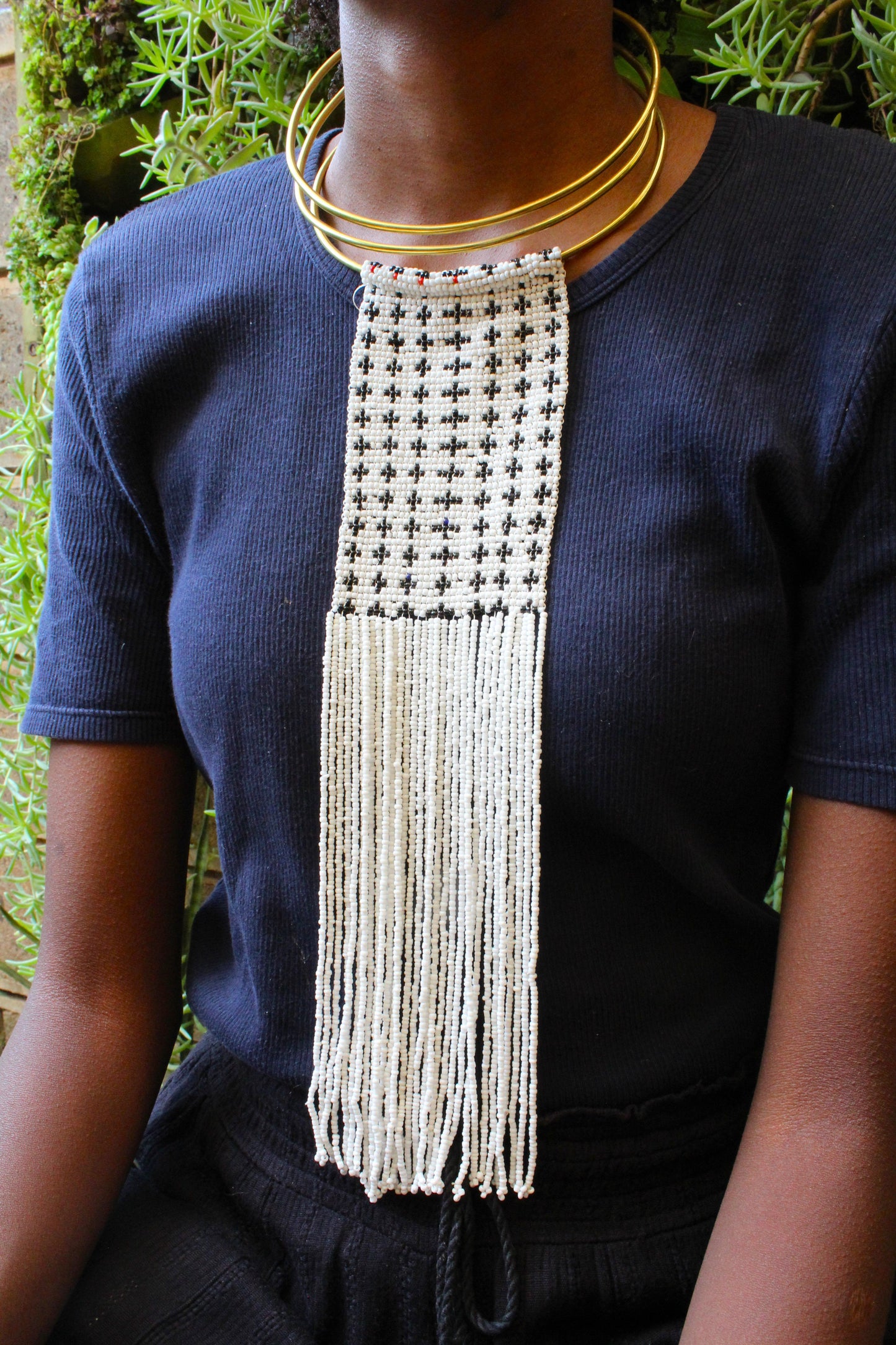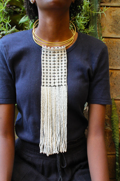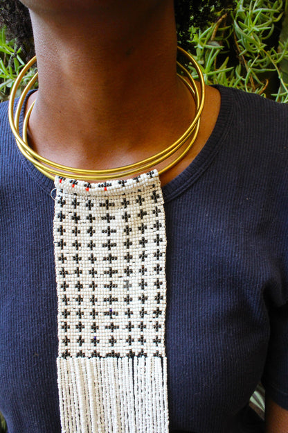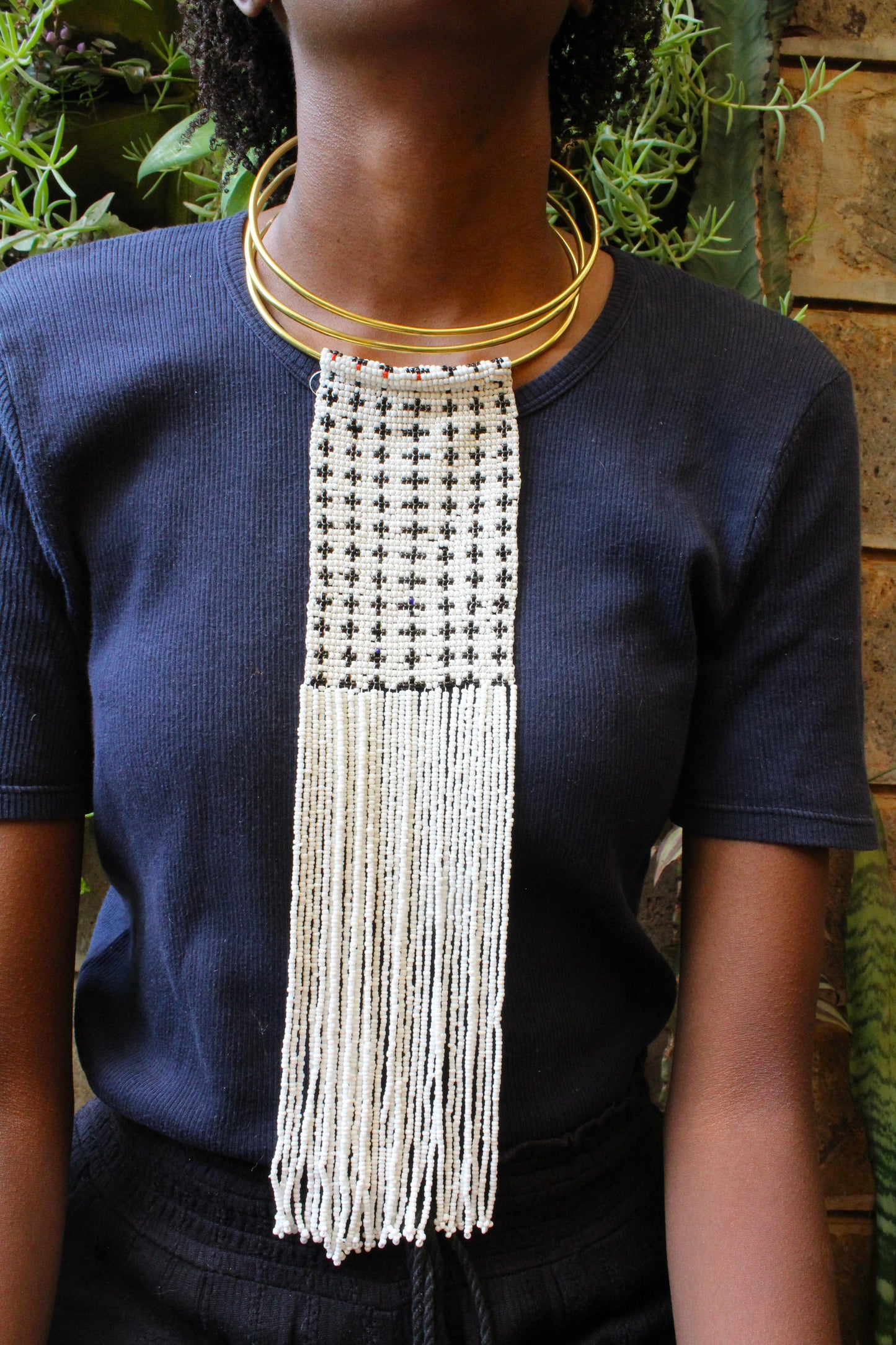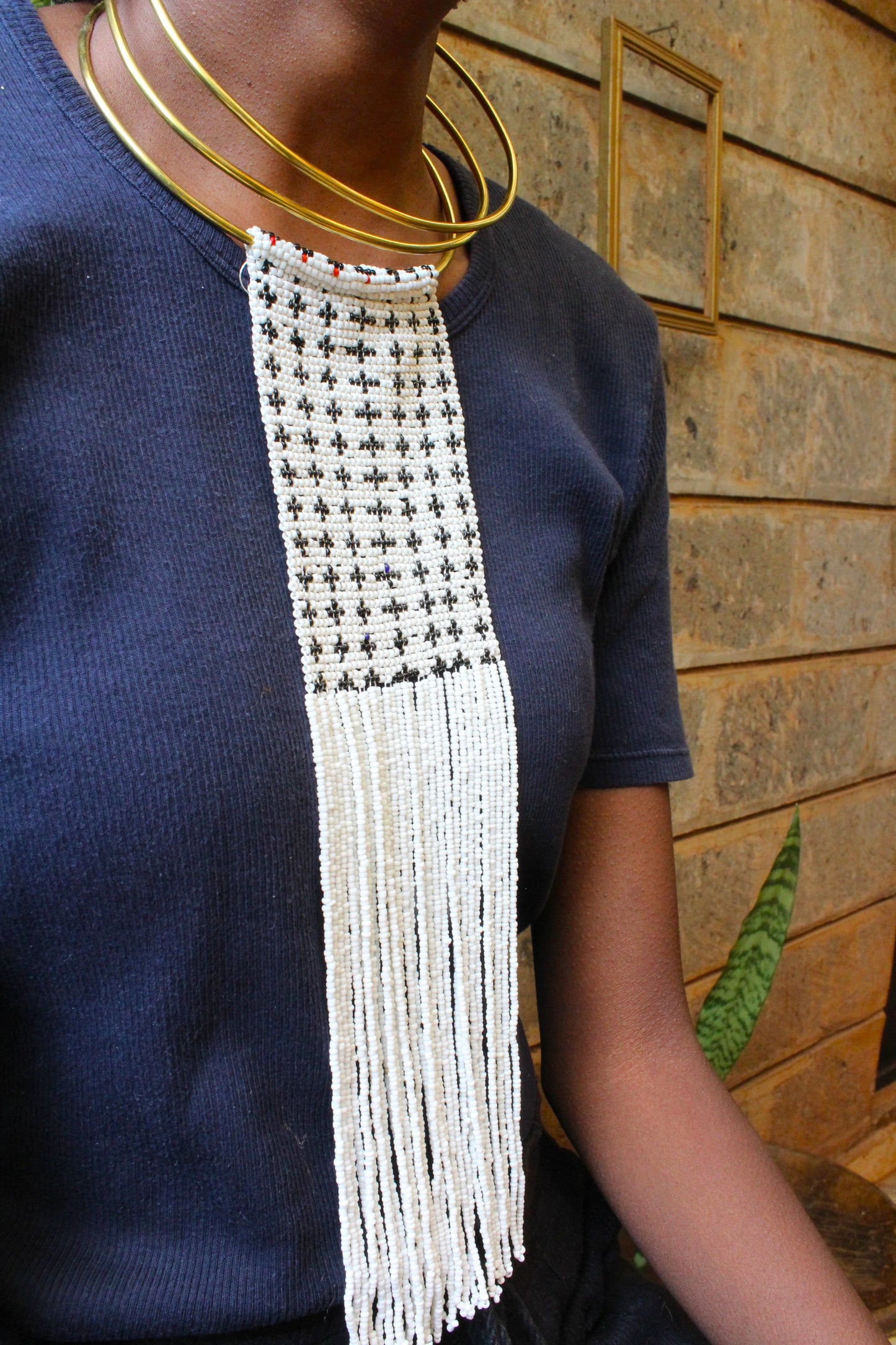 Crafted in Nairobi, Kenya, this unique brass necklace features vibrant seed beads and a backless design (no clap!). Measuring 13.5cm wide and with a pendant length of 34cm, it's perfect for adding some fun to your wardrobe.