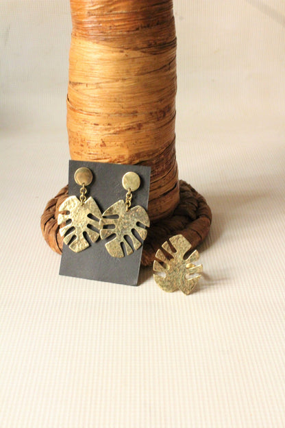 This exquisite jewelry set is meticulously handmade in Kenya, showcasing the craftsmanship of our local artisans. Crafted with brass, the set includes a pair of earrings and a matching adjustable ring, perfect for adding a touch of elegance to any outfit. The earrings measure 5.2 centimeters in length and 3 centimeters in width, making them a versatile and stylish accessory for any occasion.