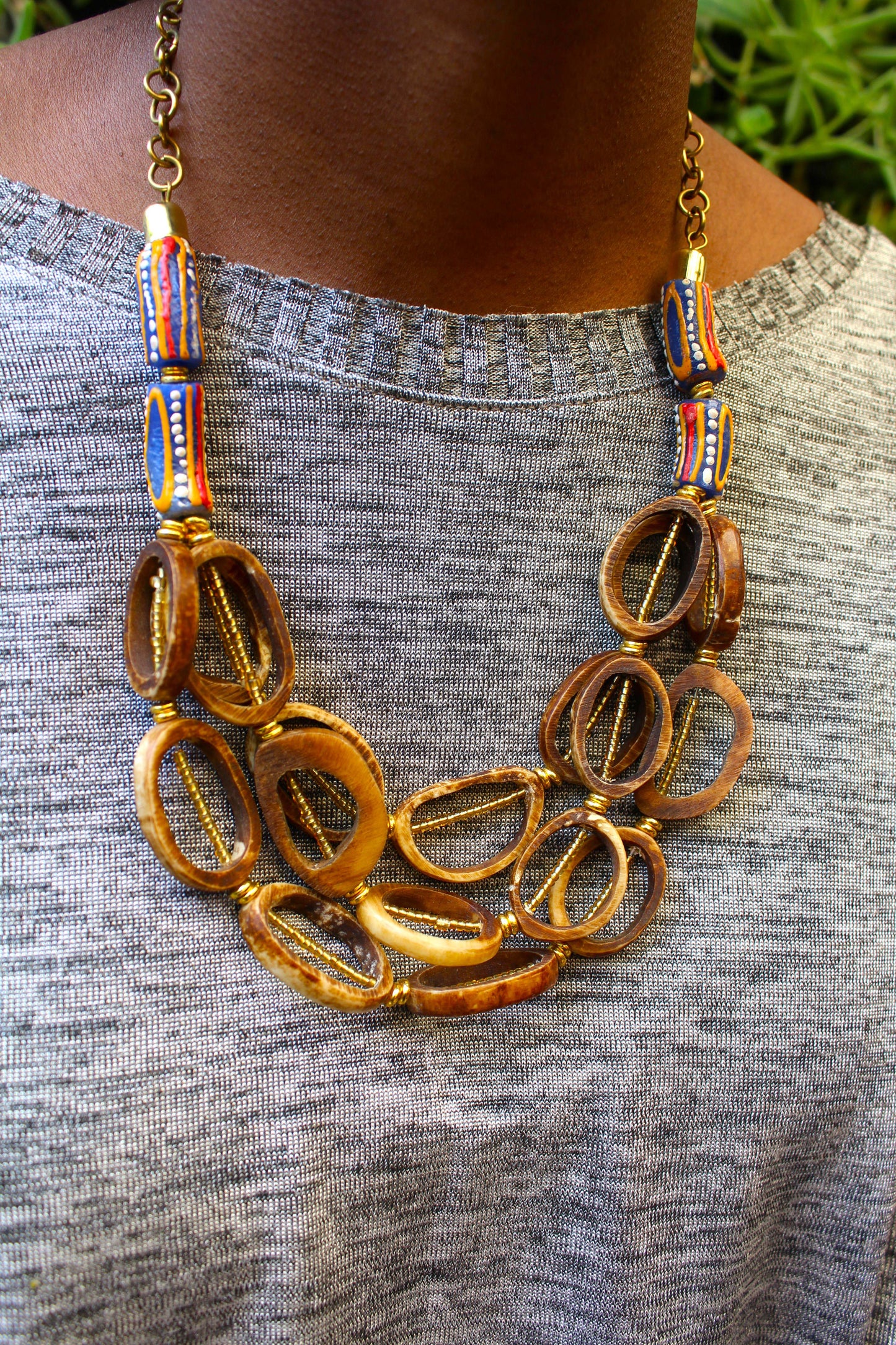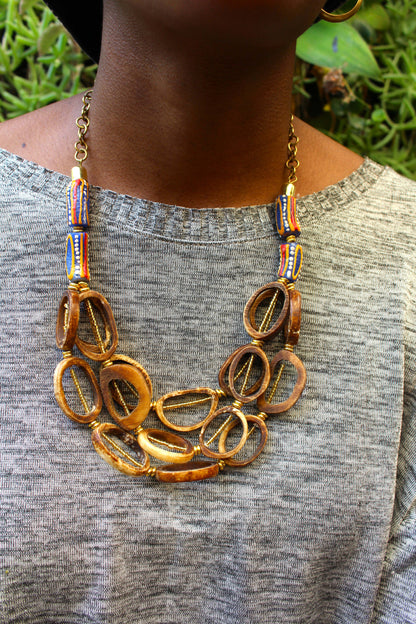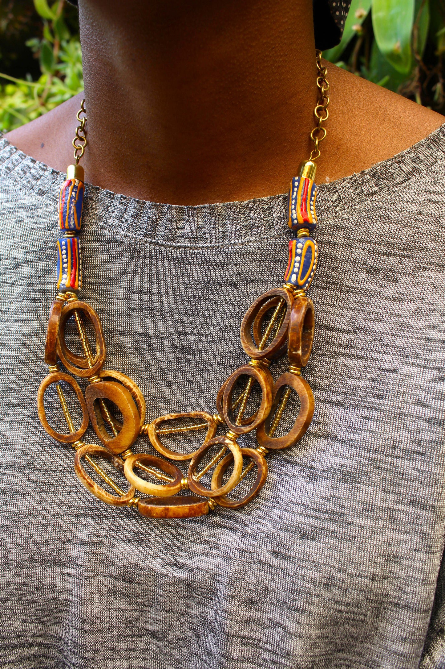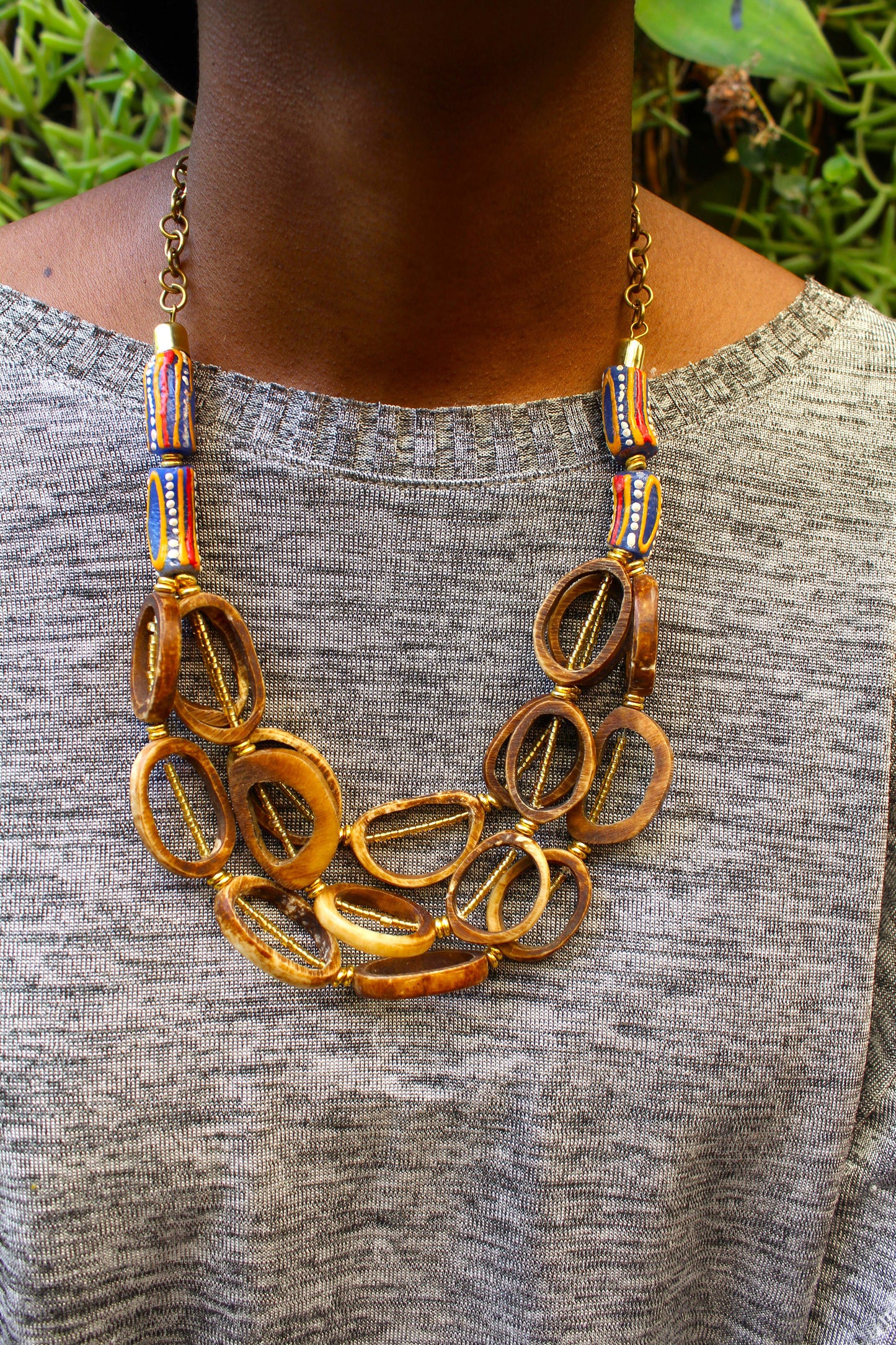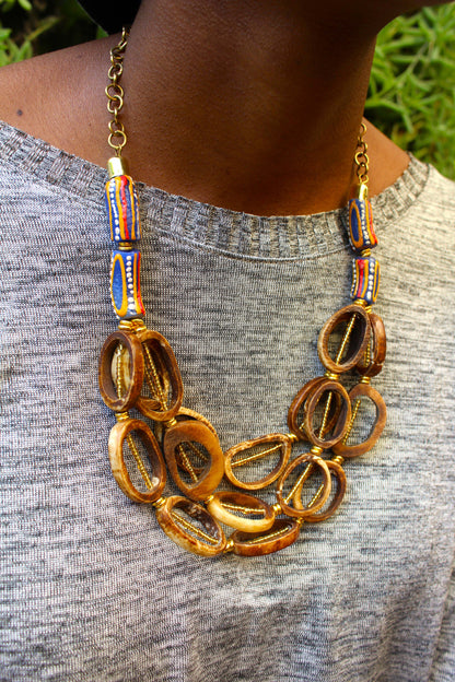 Hand-crafted with exquisite, handmade African beads and delicate seed beads, this necklace is completed with a luxurious brass chain. Measures at 27 centimeters in length and is adjustable,