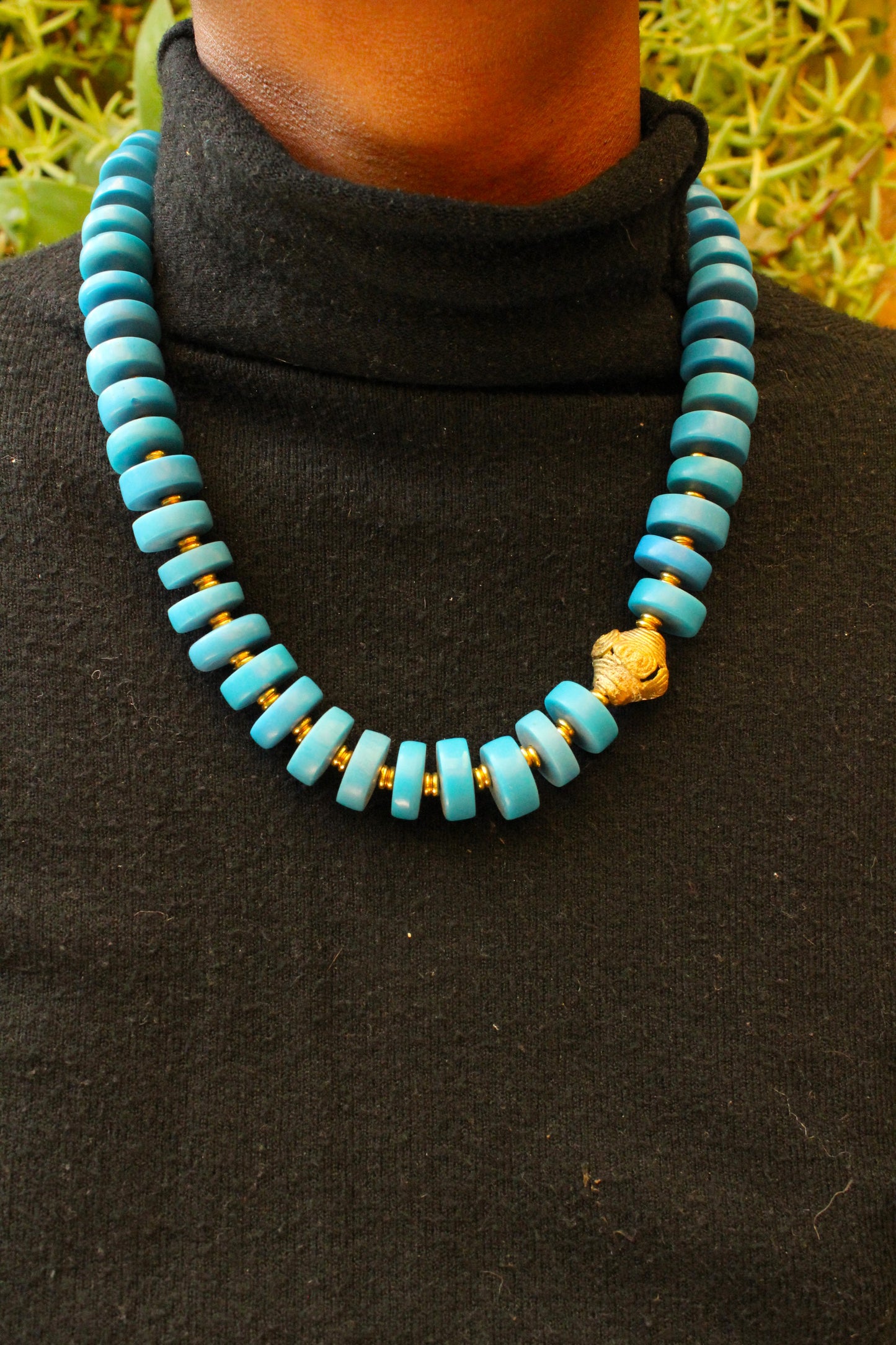 Each bead on this necklace is individually made. The necklace is strung with West African beads in a solid blue color and adorned with a brass West African bead.