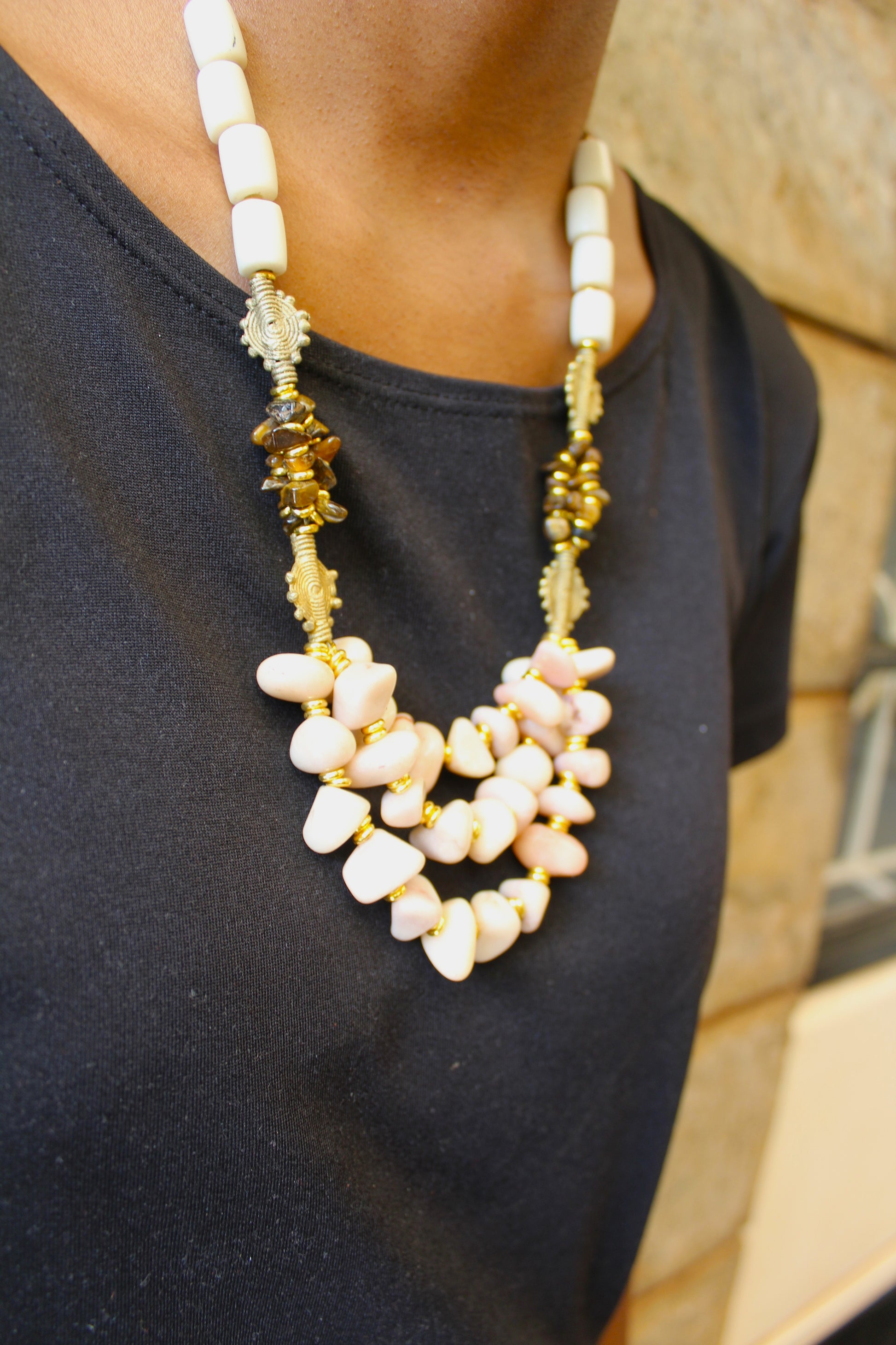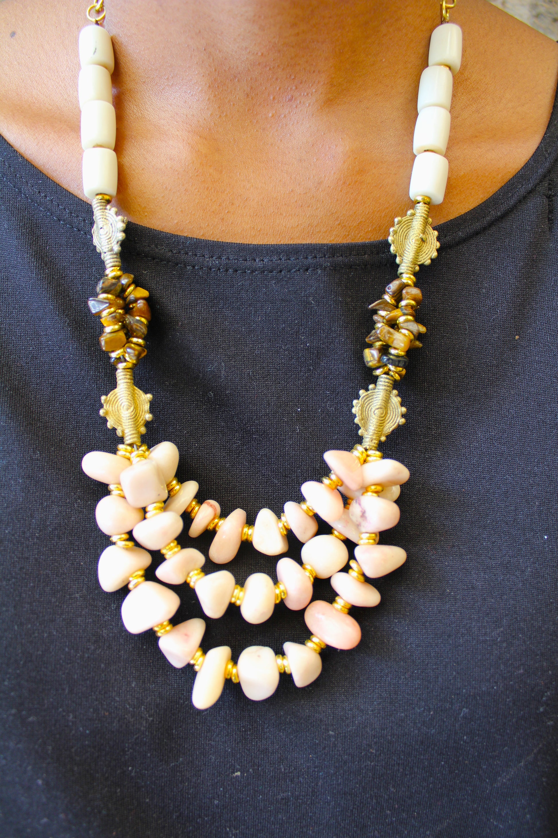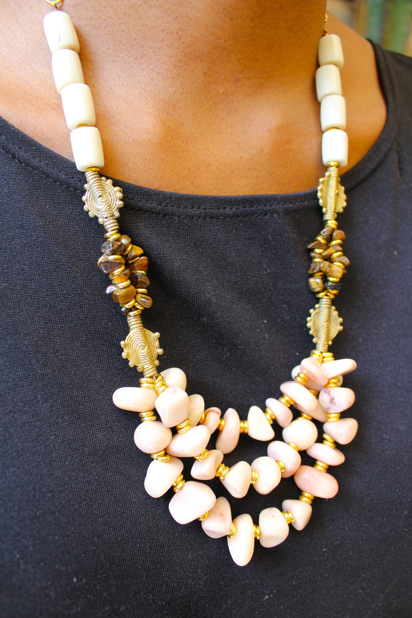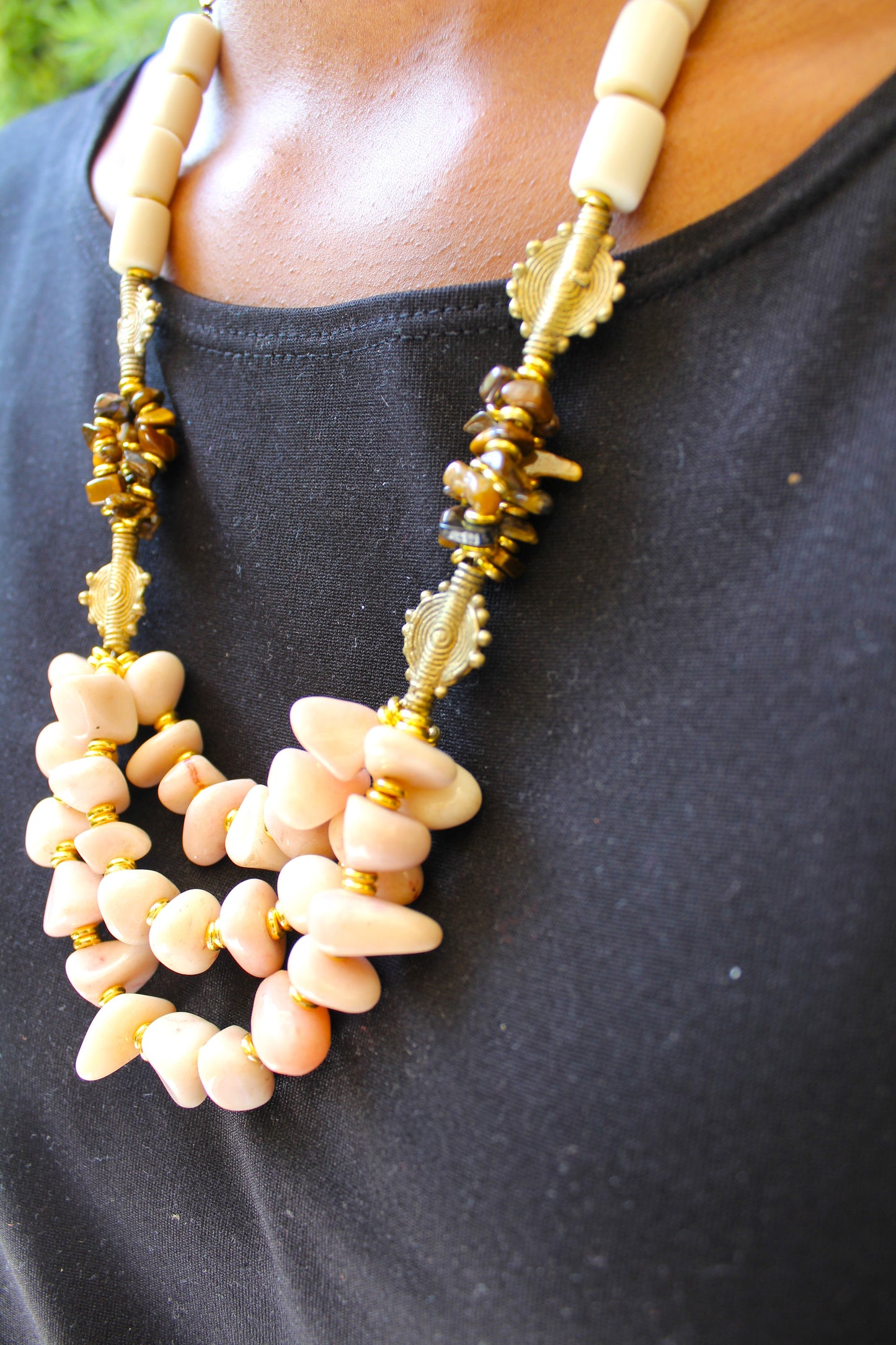 This stunning necklace features bold brass west african beads. Strung on the cord are stone beads and handmade horn beads, which also accent the necklace. The necklace ends in a brass clasp. This eye-catching piece of jewelry is sure to turn heads.