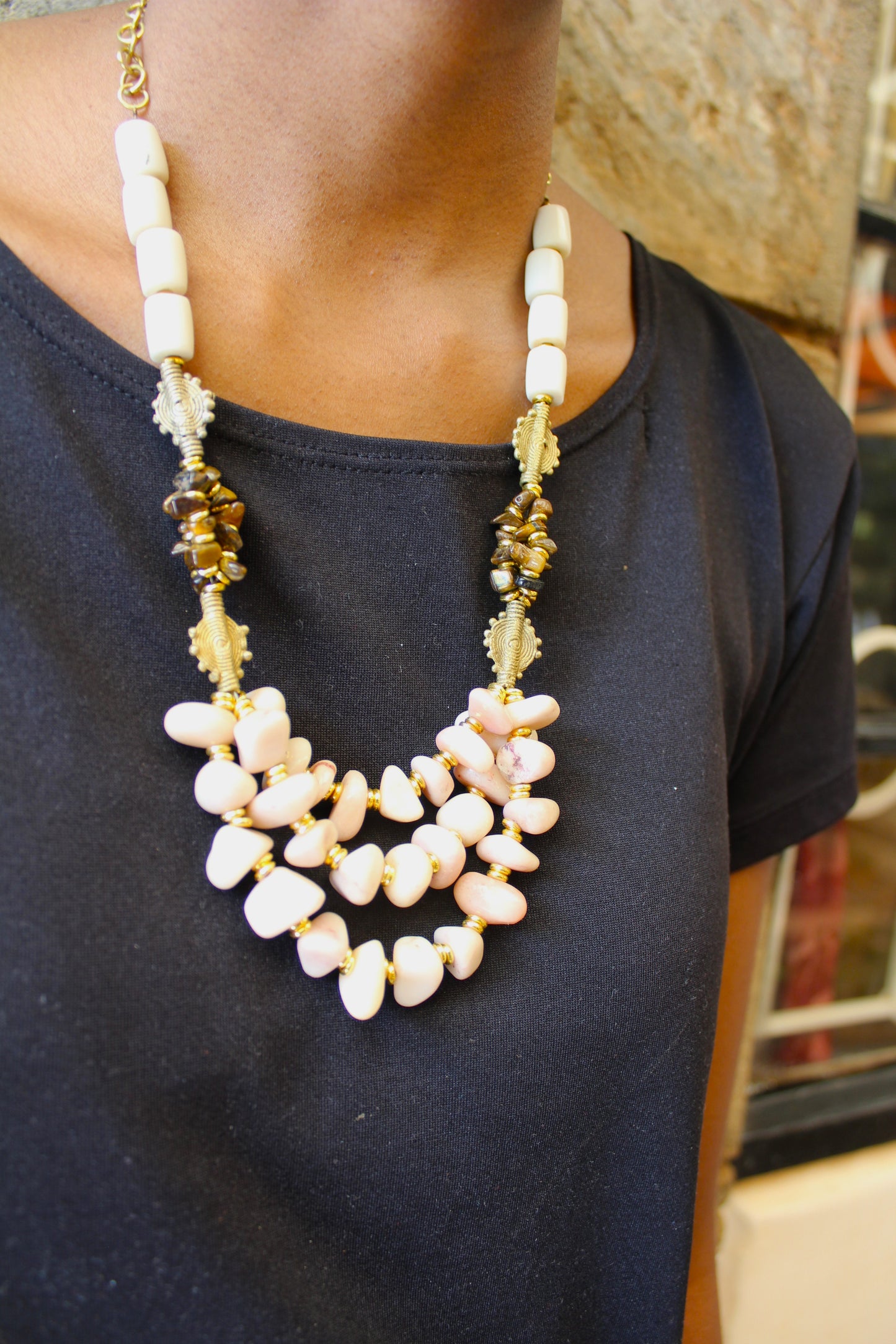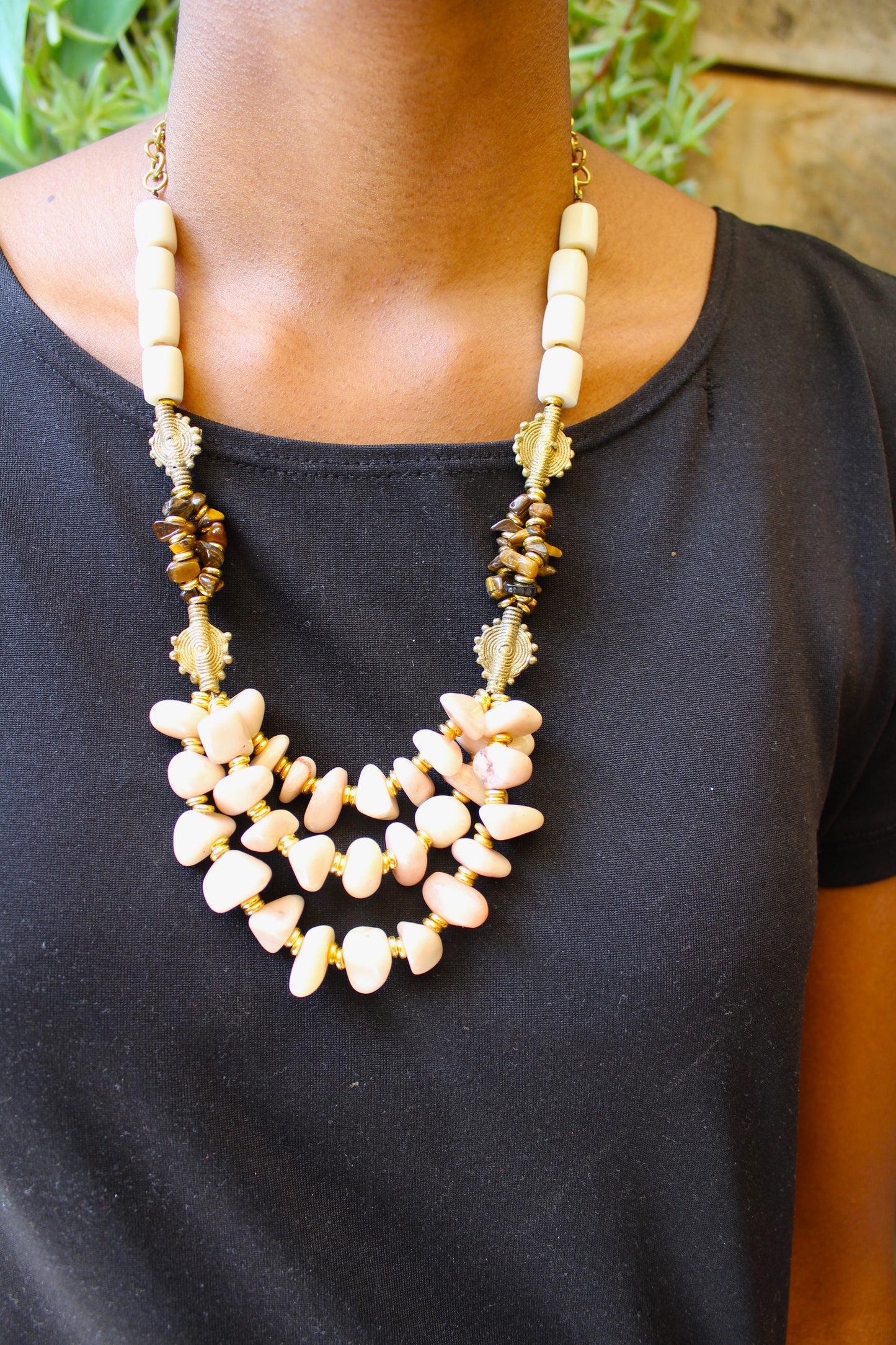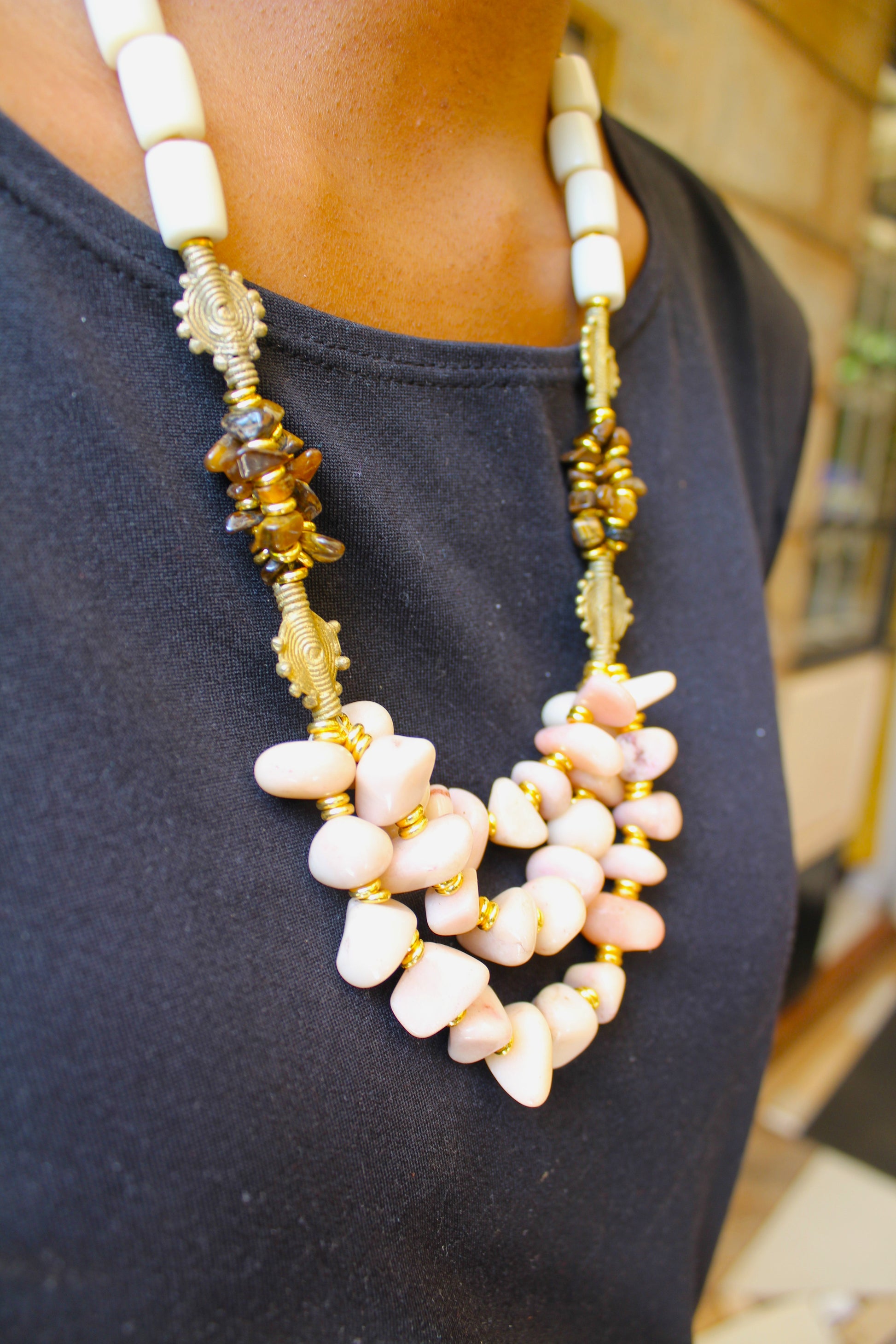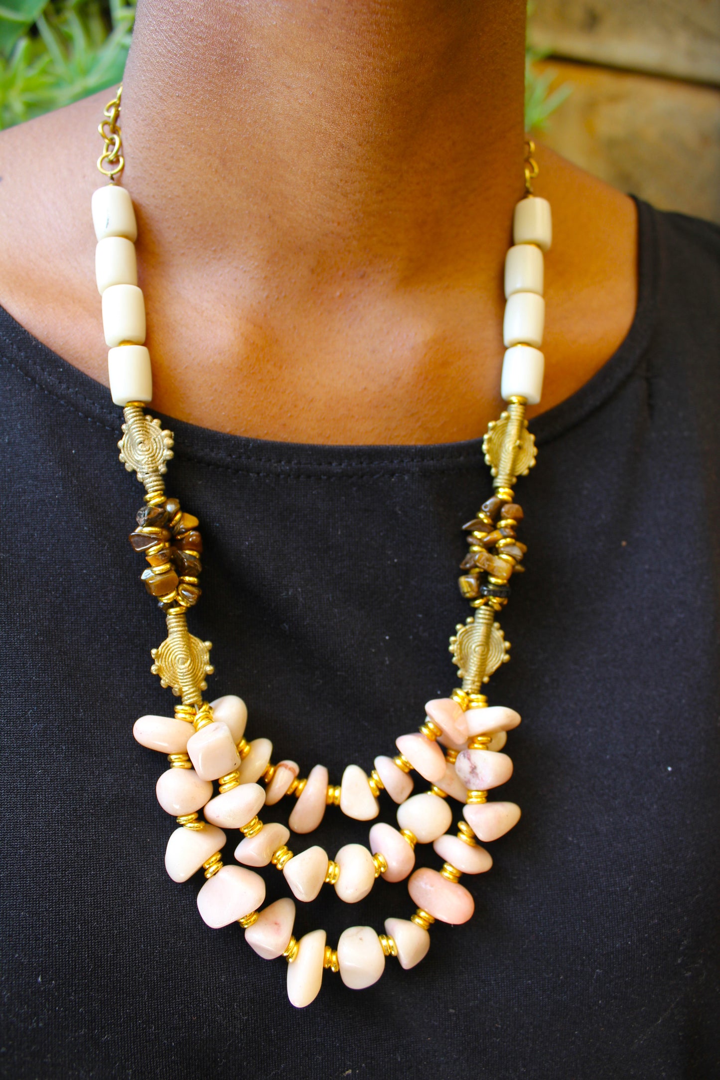 This stunning necklace features bold brass west african beads. Strung on the cord are stone beads and handmade horn beads, which also accent the necklace. The necklace ends in a brass clasp. This eye-catching piece of jewelry is sure to turn heads.