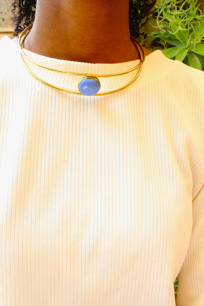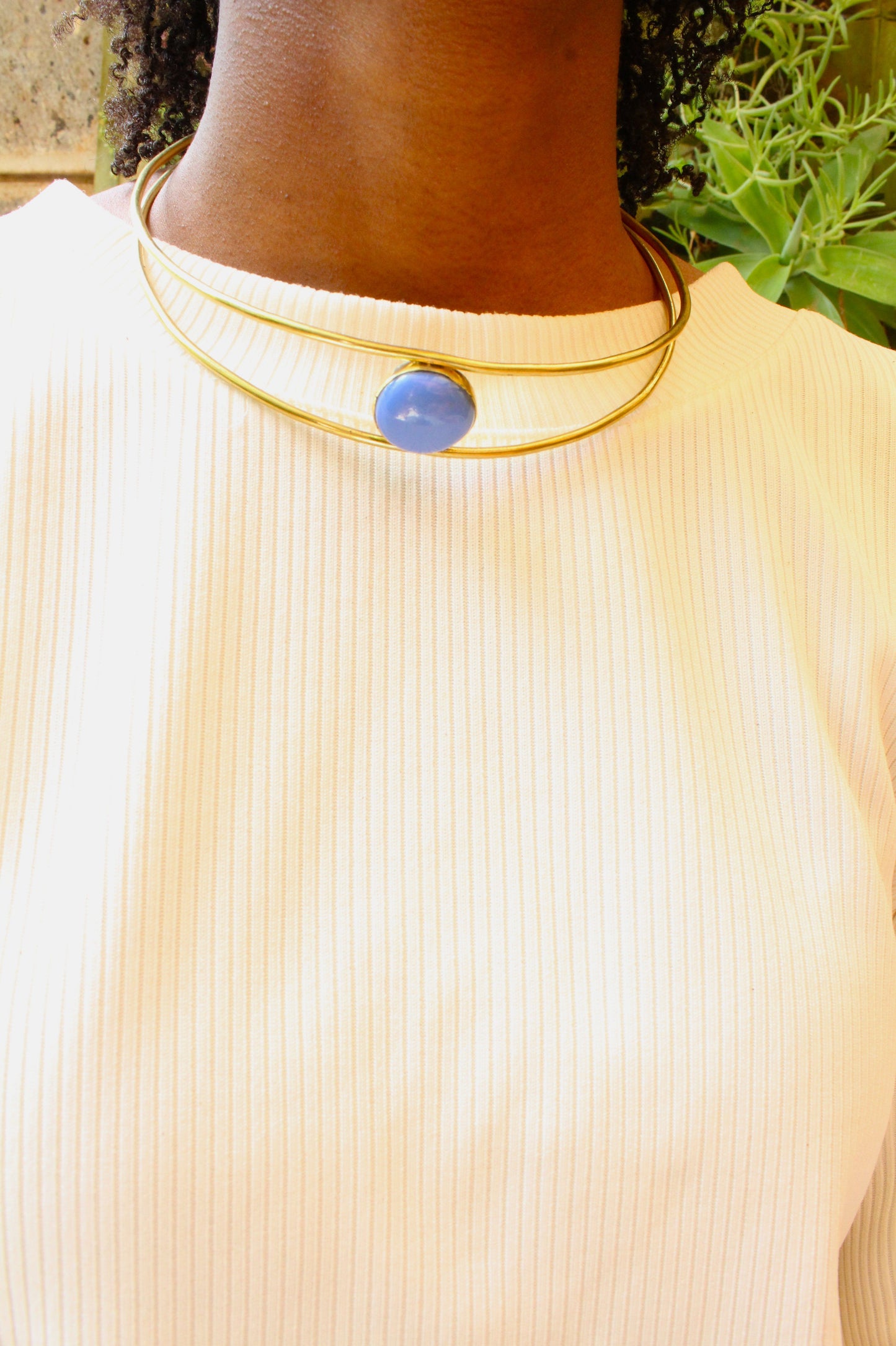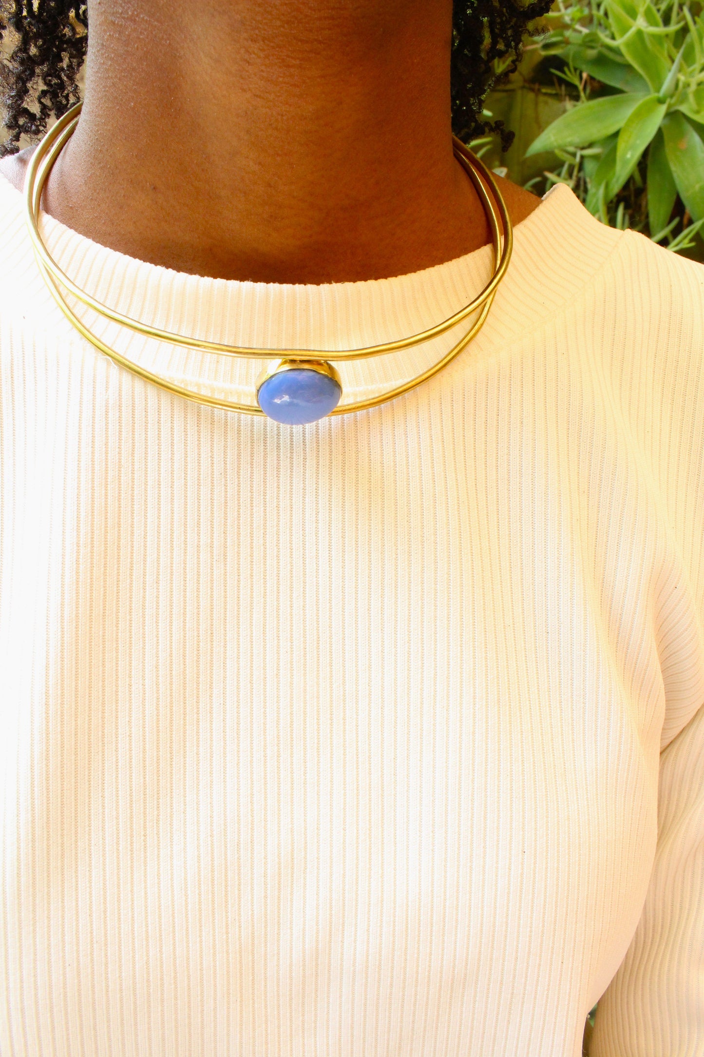 Indulge in the luxurious design and timeless elegance of this Lethu Necklace. Featuring a stunning blue stone bead, this brass choker is carefully crafted to add a touch of sophistication to any outfit.