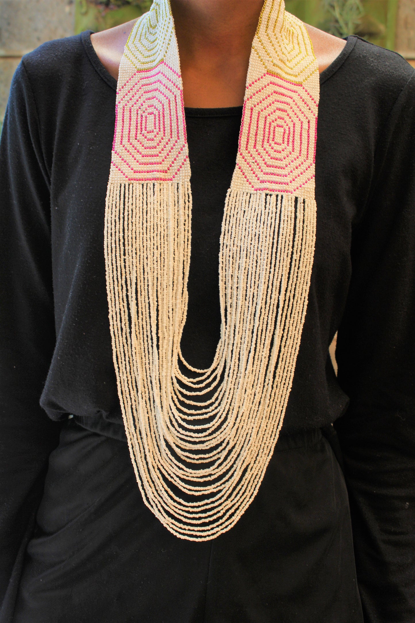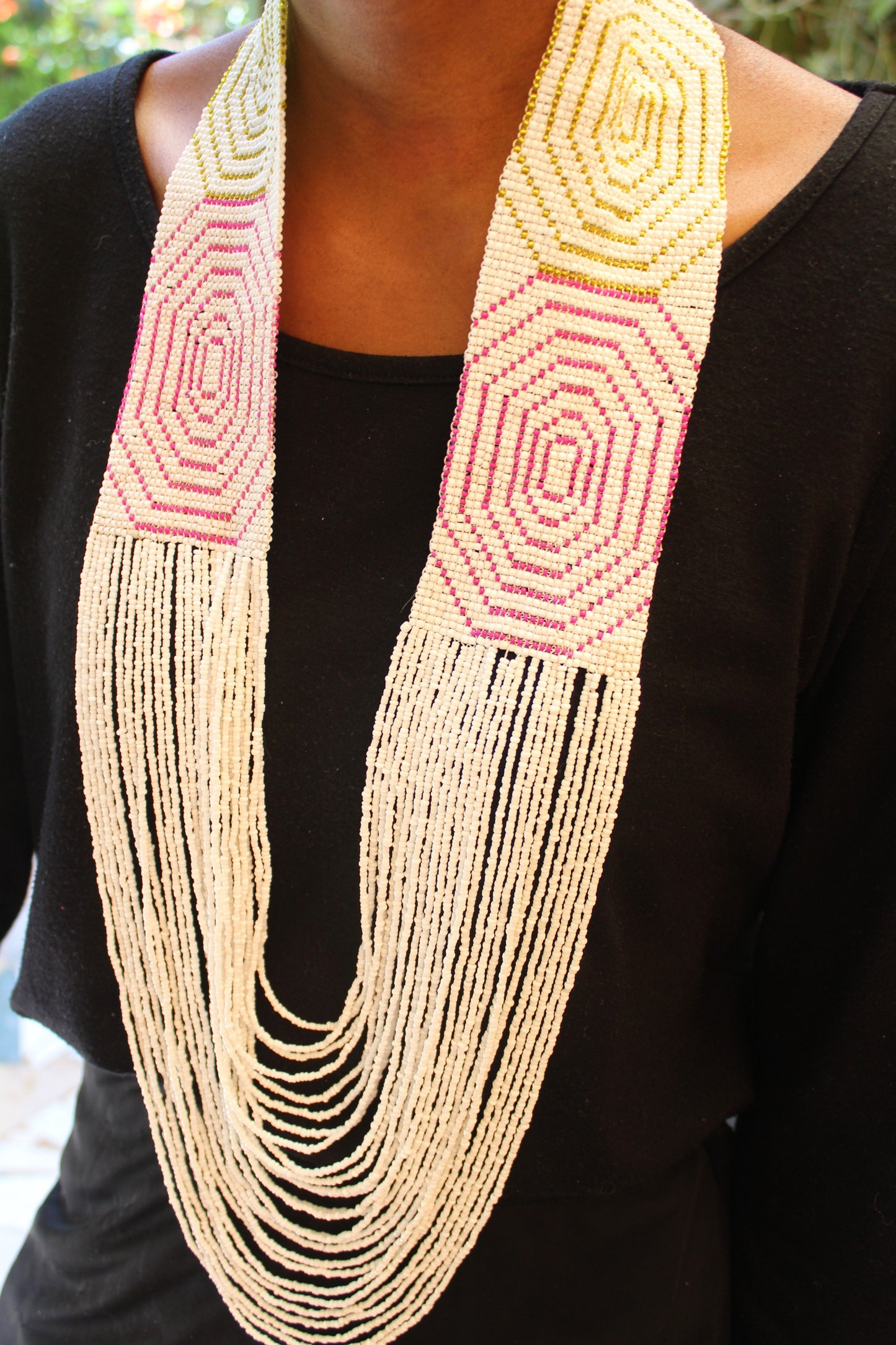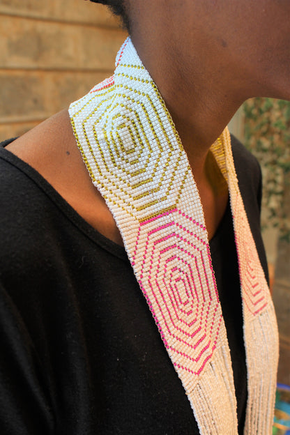Handsewn with a mix of seed beads. Does not have a clasp.
