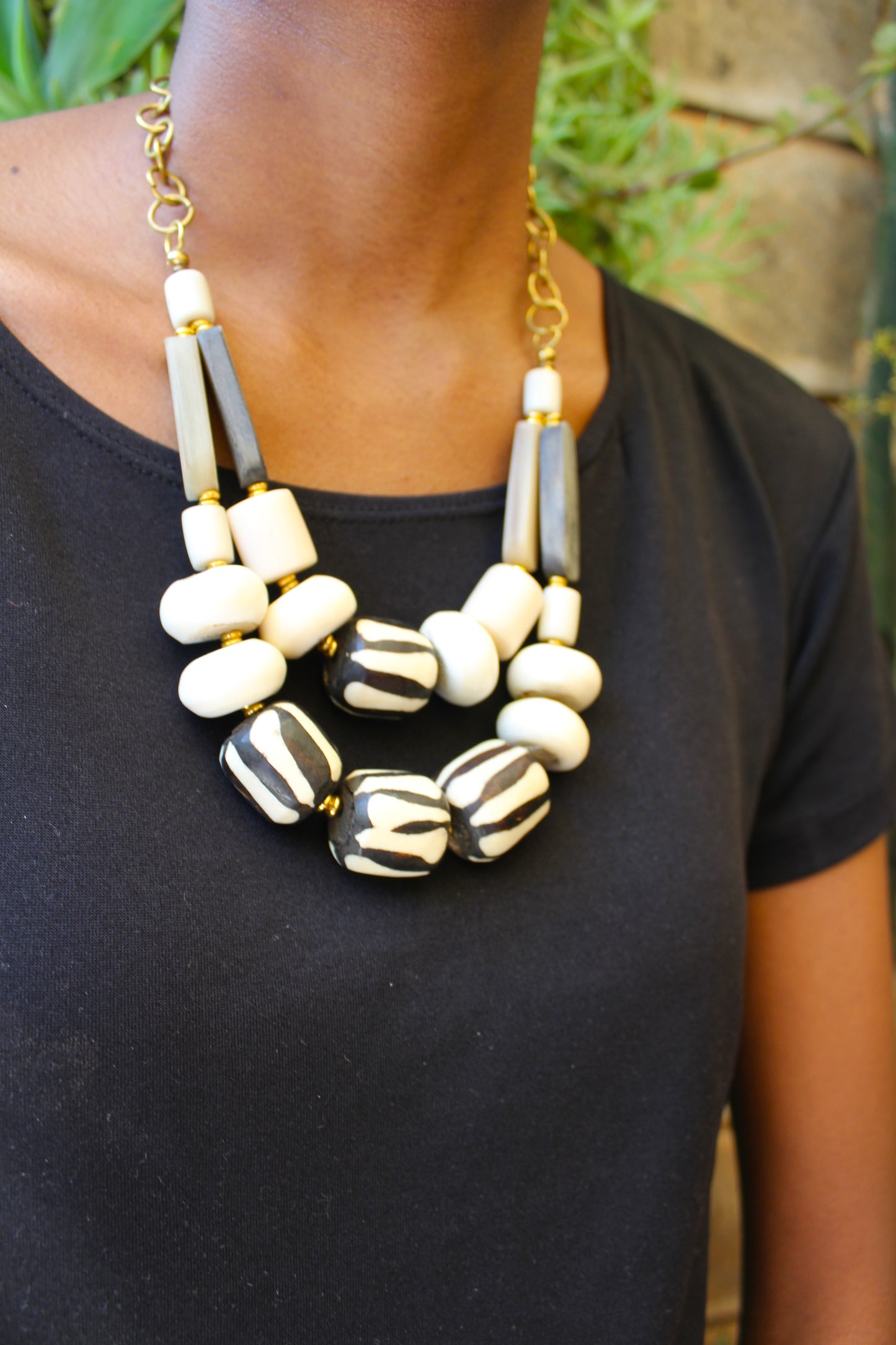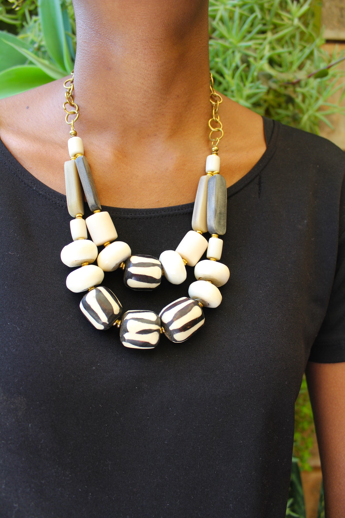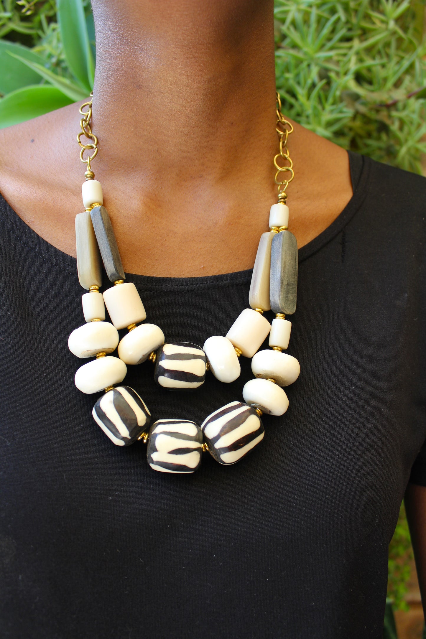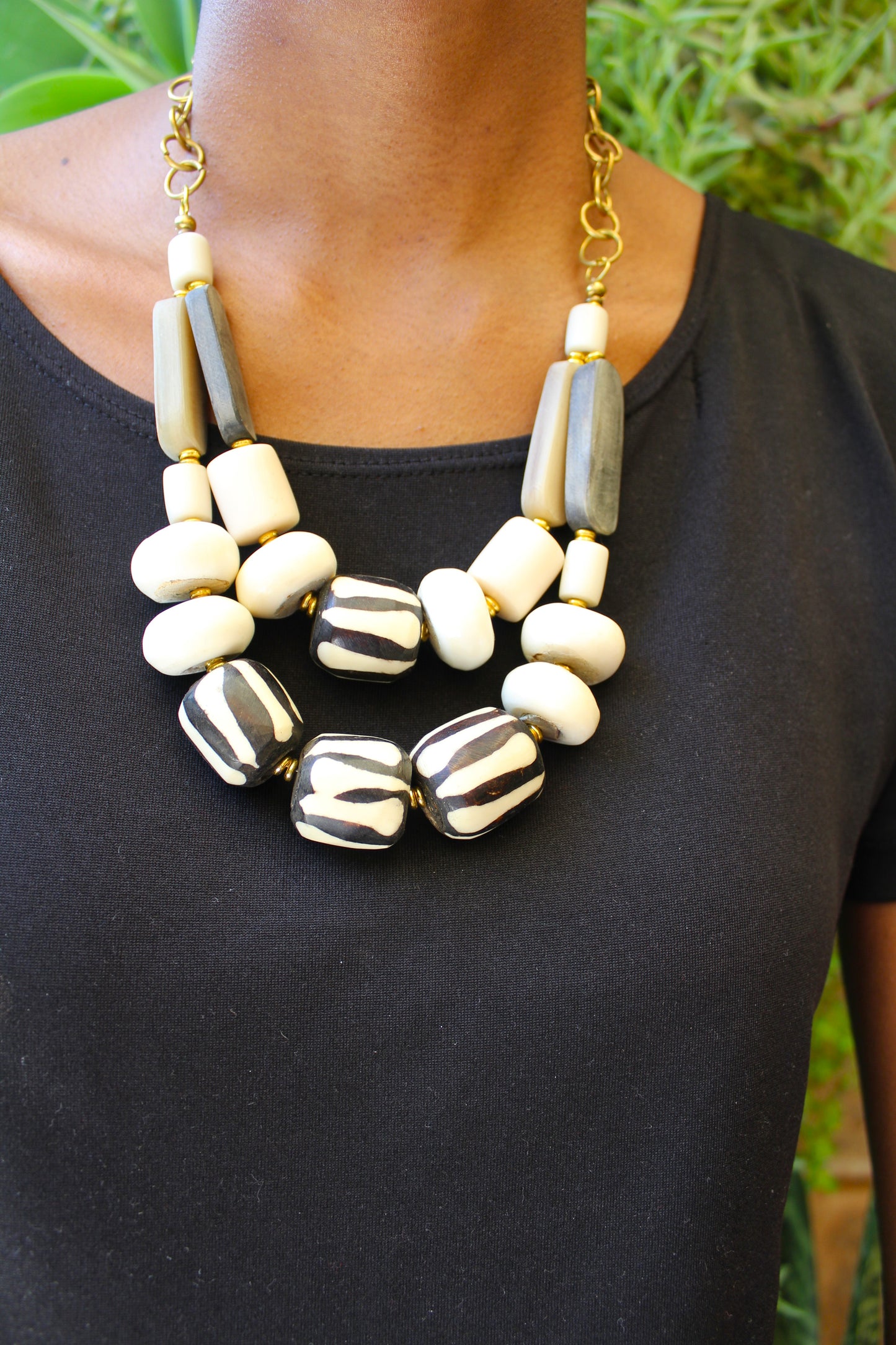 This African necklace is made by hand with beads of bone and horn. The beads are gray. black, and white. The necklace is closed with a brass clasp and looks both unique and sophisticated.
