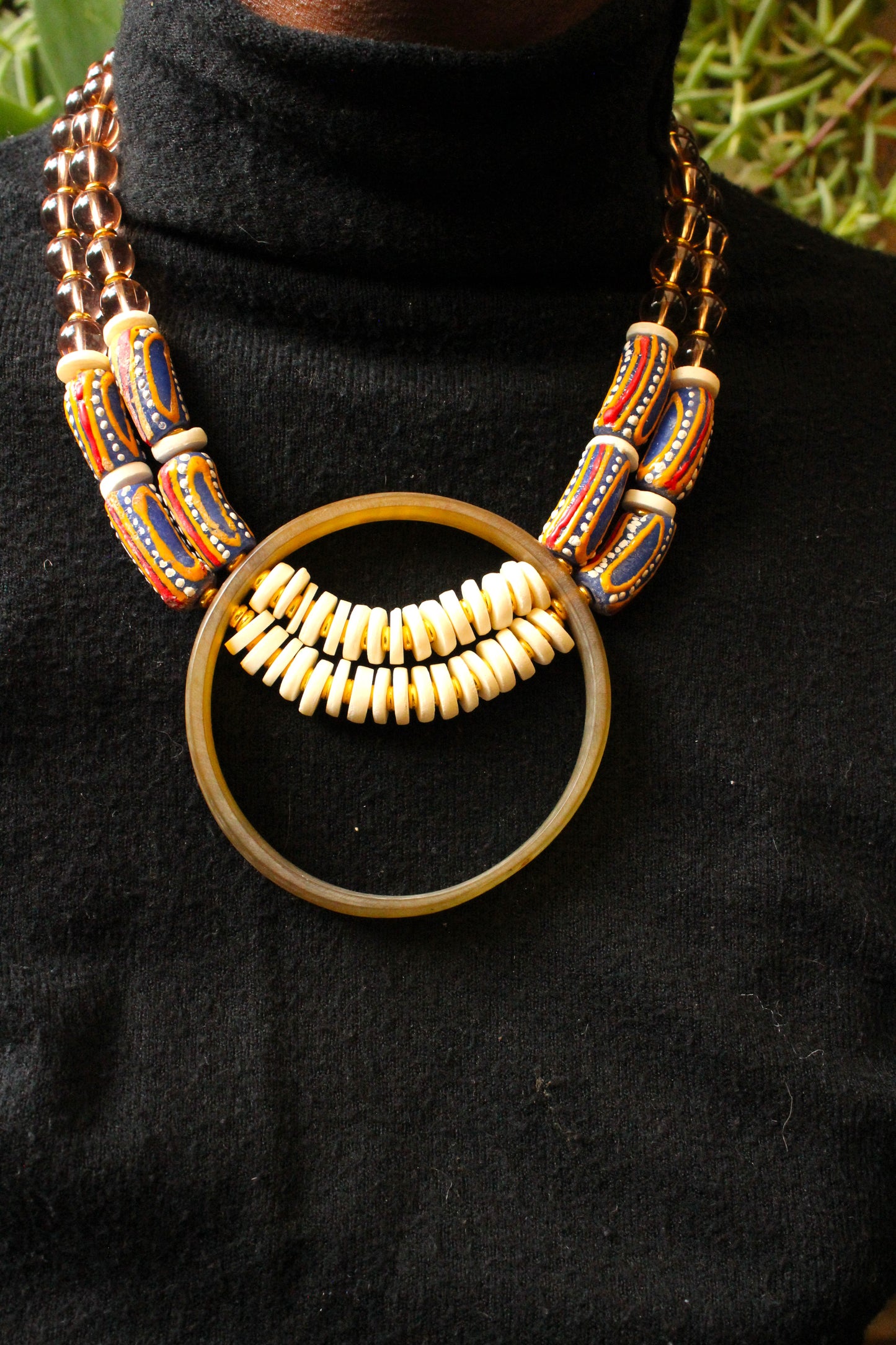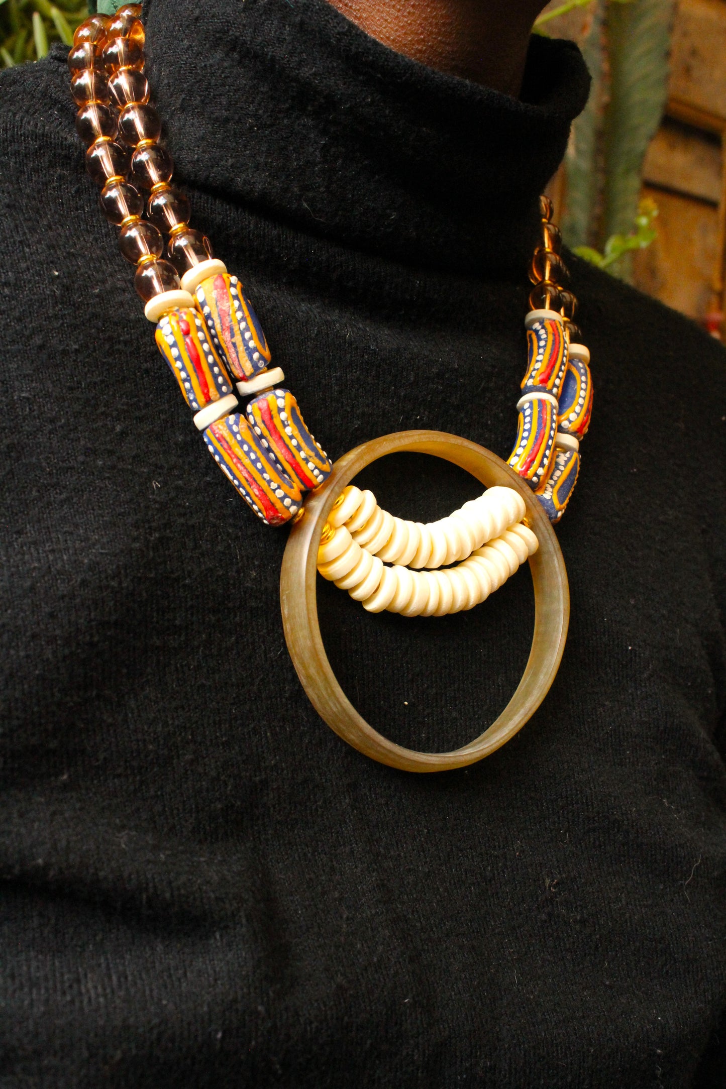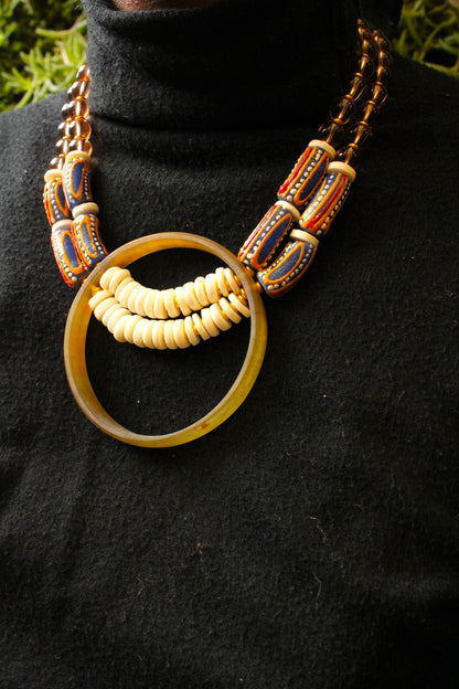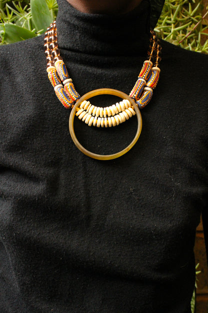 This beautiful necklace is constructed of hand-crafted horn pendants and a diverse selection of flat and round horn and West African beads.