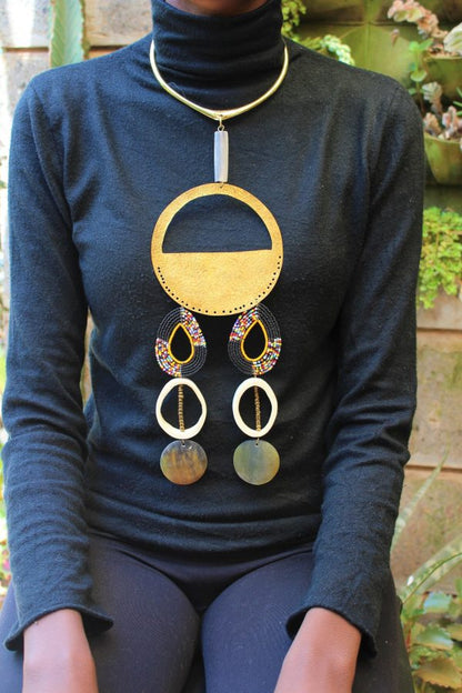 Crafted with a mix of beads and brass pendants. Has knob ends, does not have a clasp.