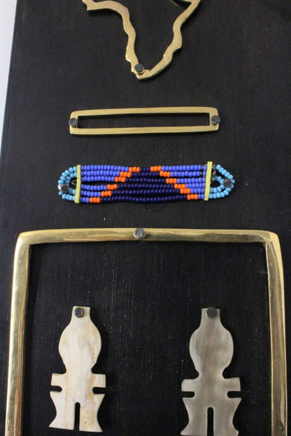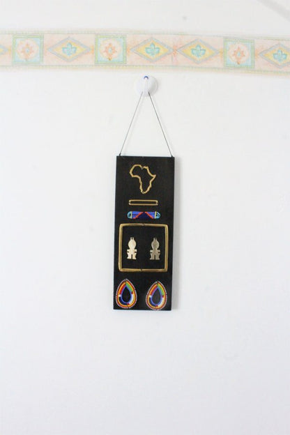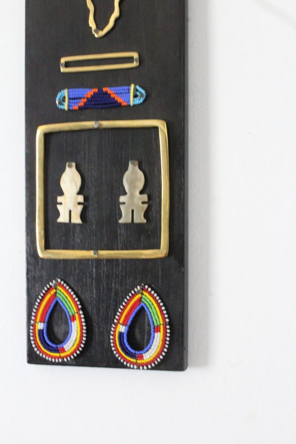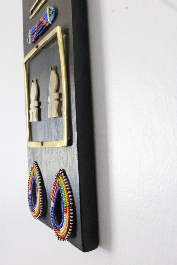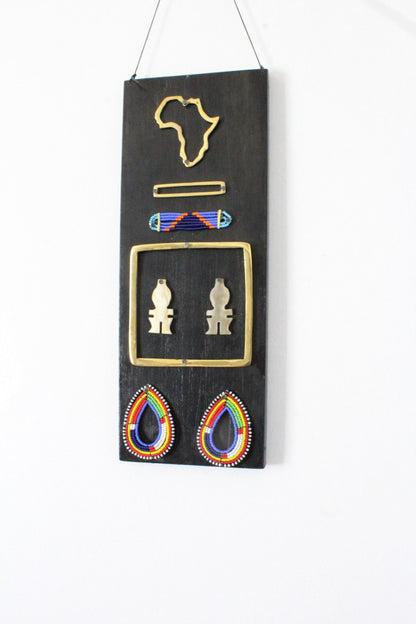 This beaded wall hanging is designed with wood and decorated with brass and seed beads.