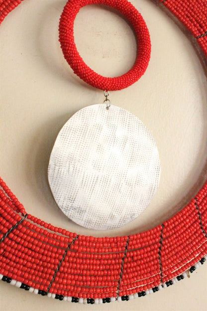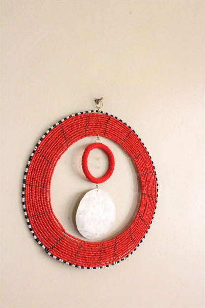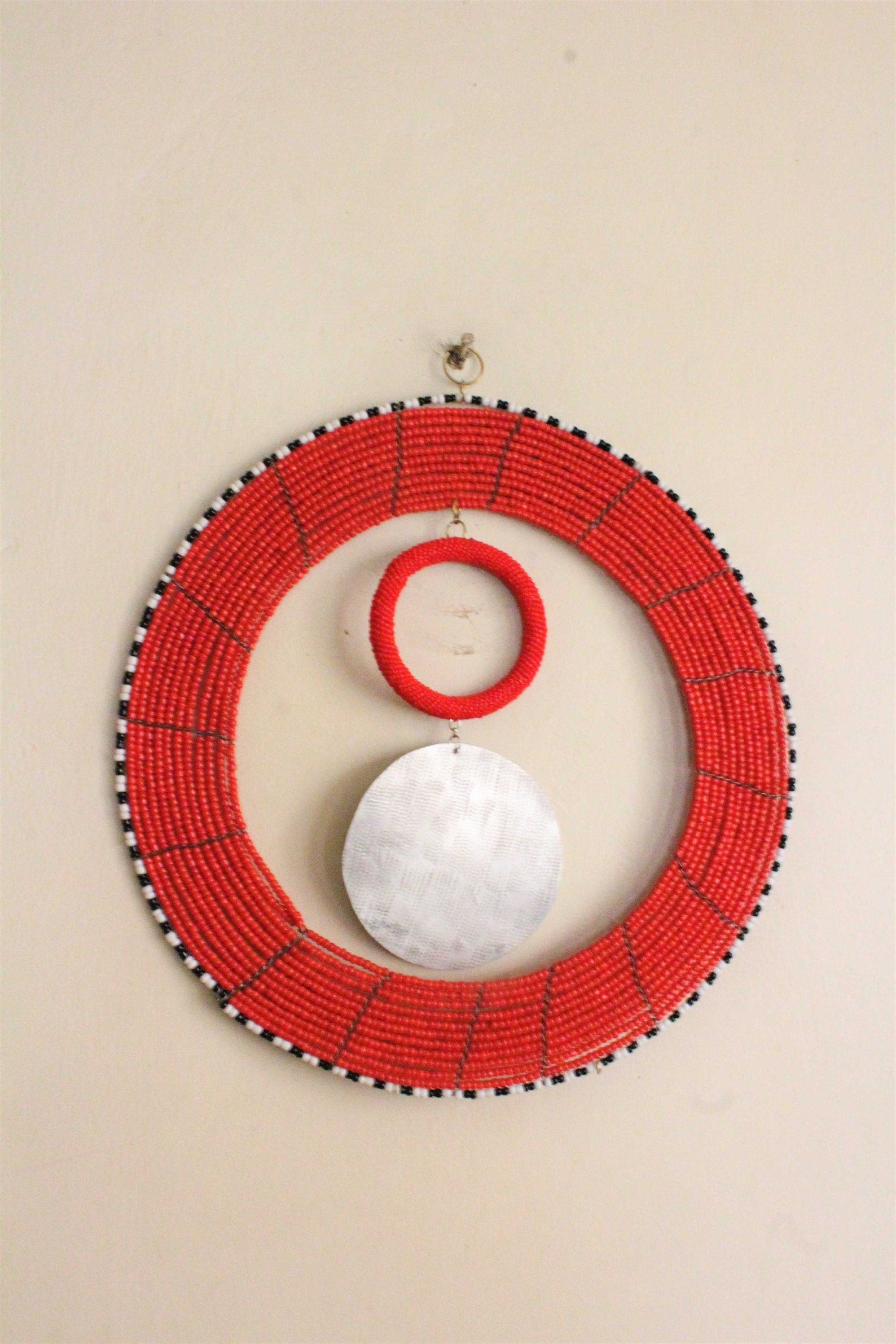 This beaded wall hanging is crafted with beads and an aluminum circle pendant…