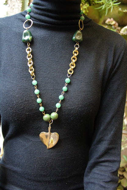 Crafted with brass chain, beads and a brass leaf pendant.