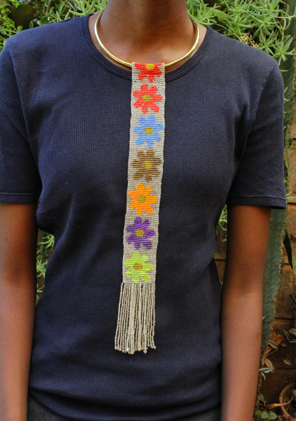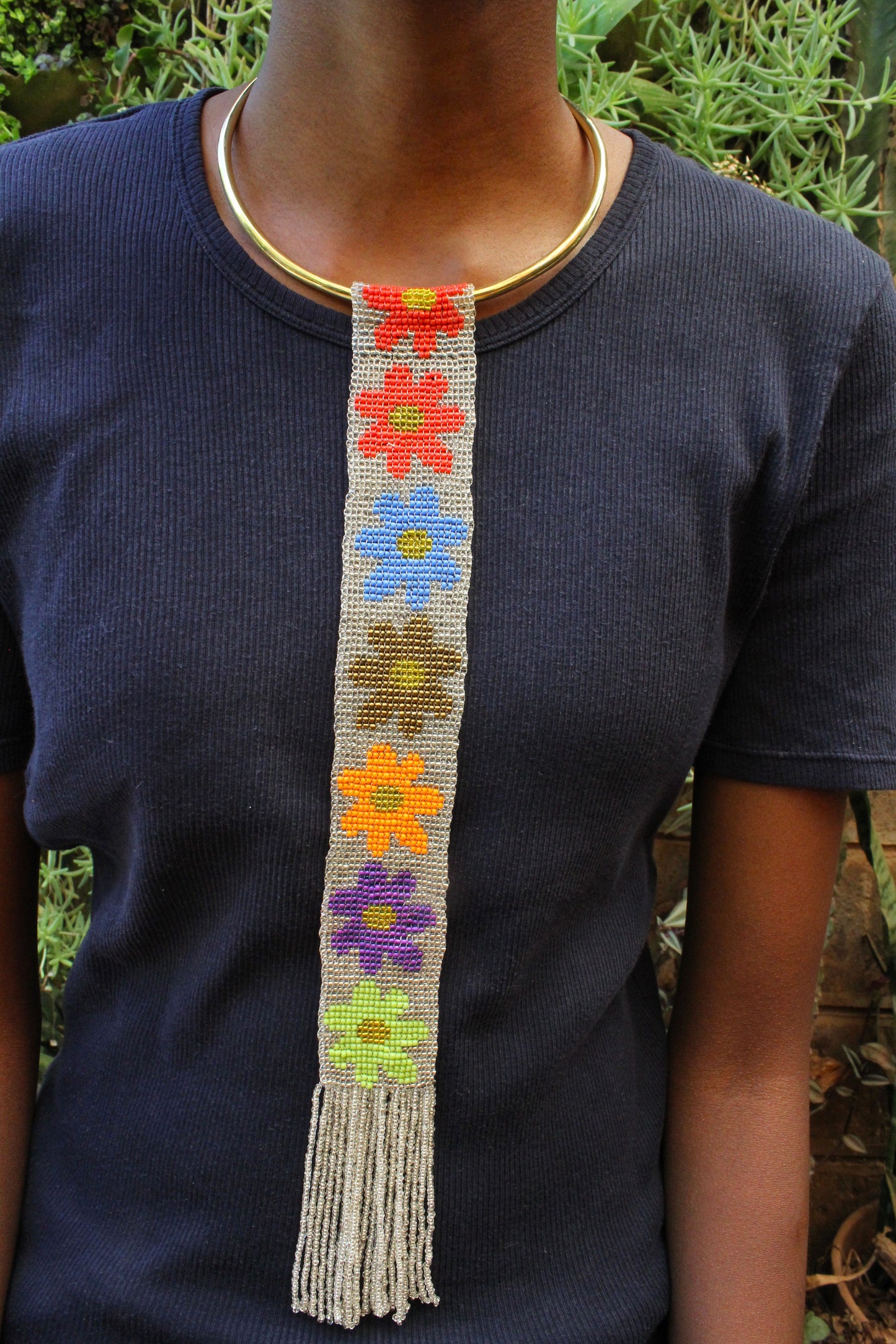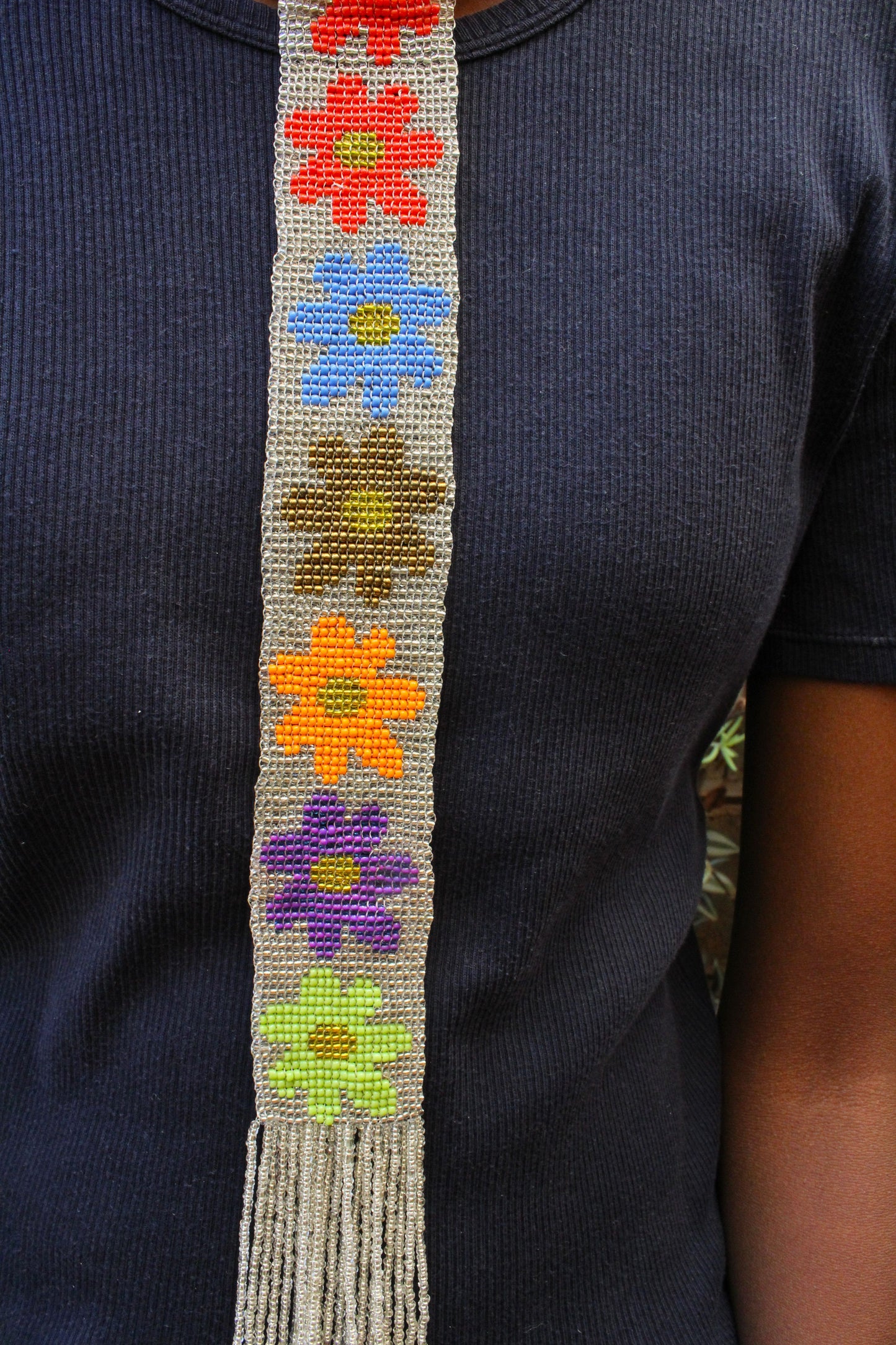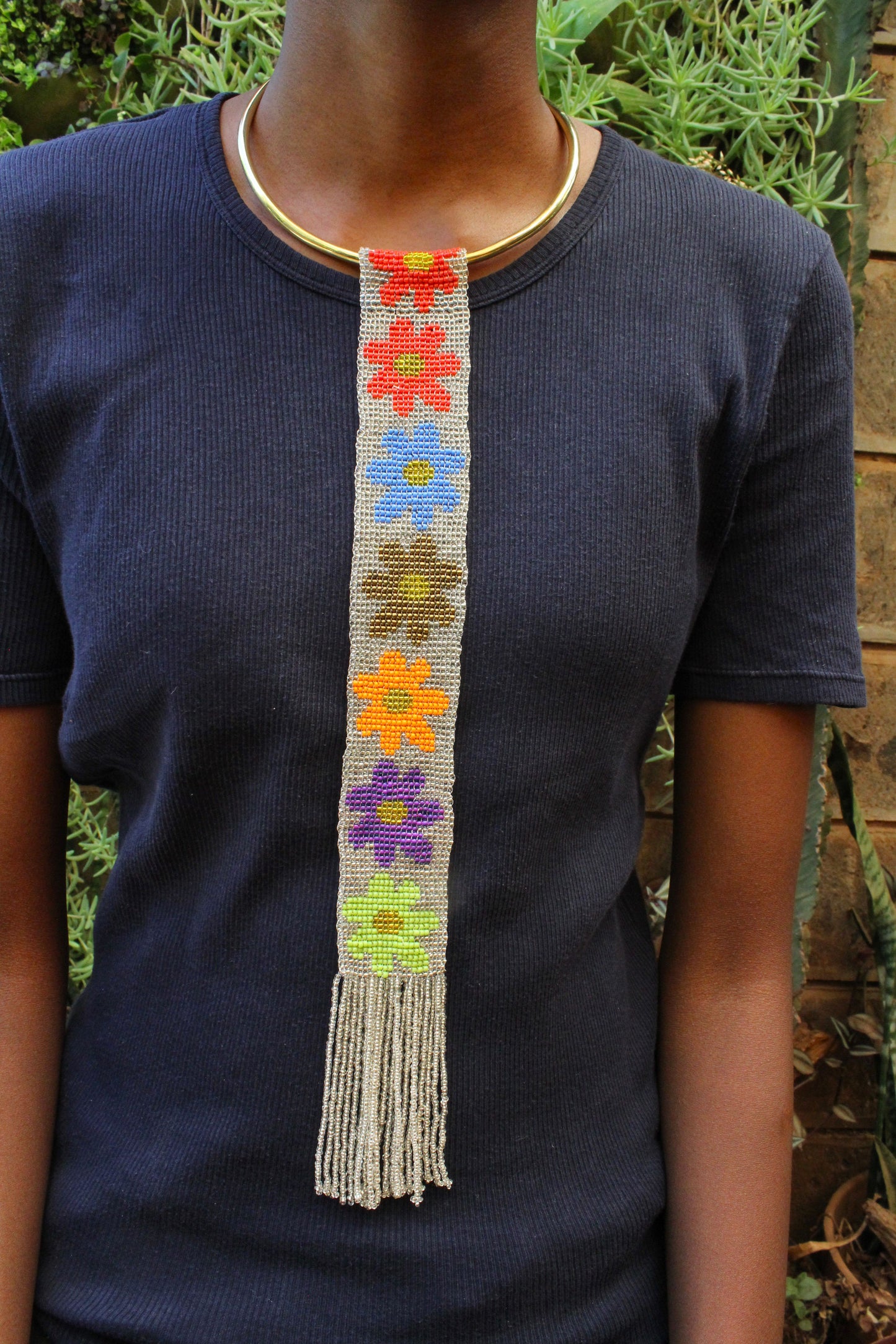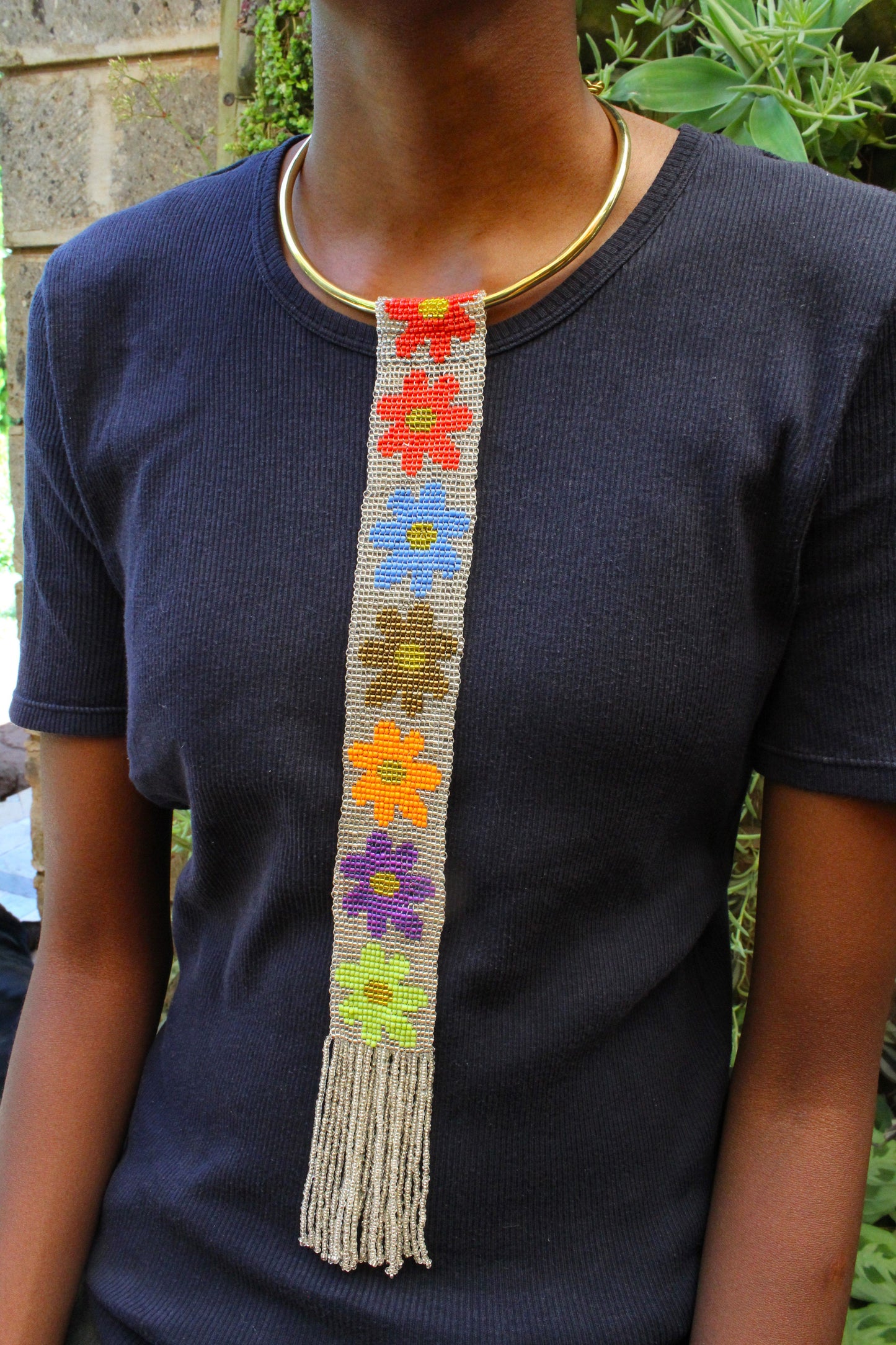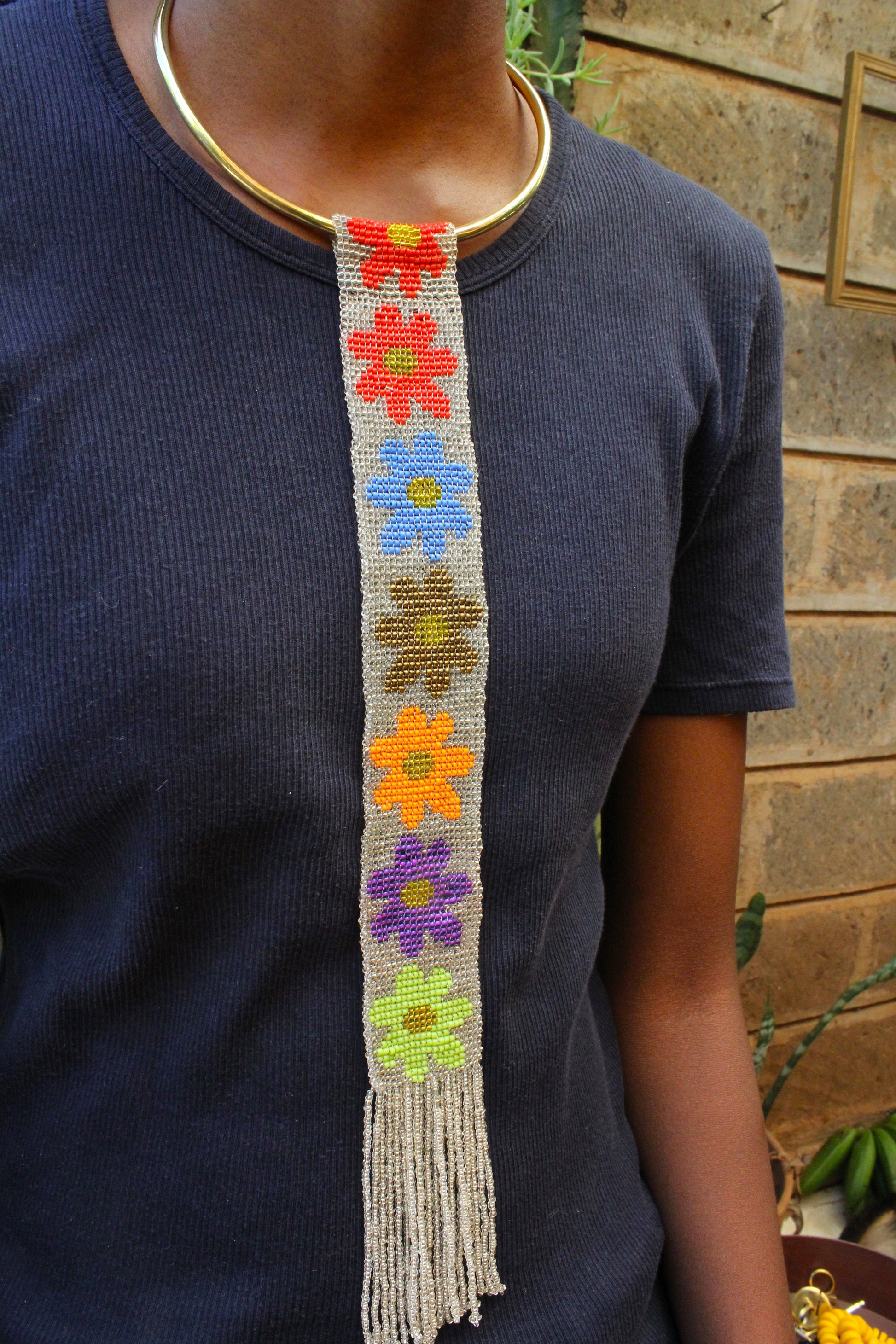 Get ready to add some sparkle and shine to your wardrobe with this handstitched piece. Made with a mix of seed beads and a brass neckpiece, it's finished off with a brass clasp to complete the look.