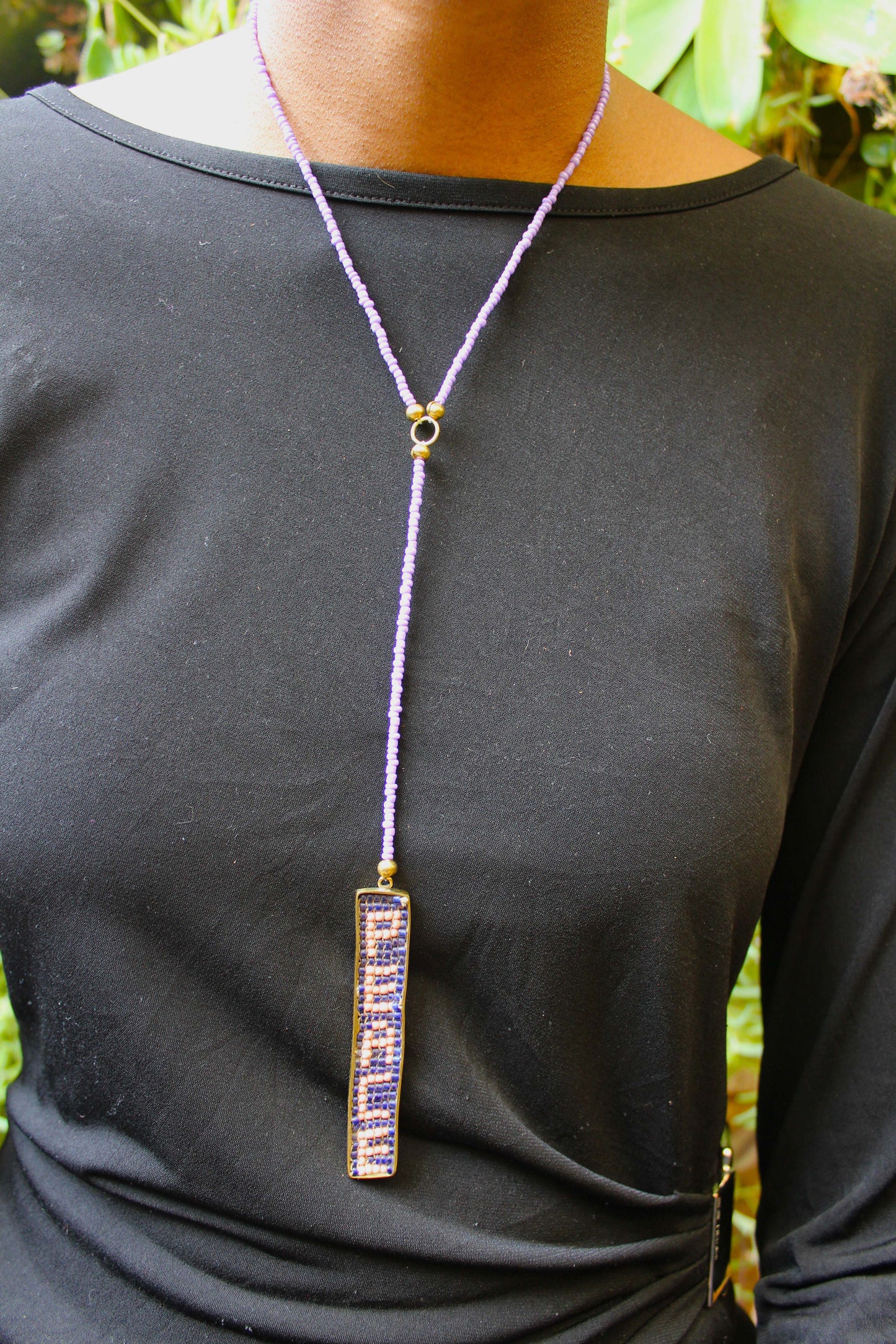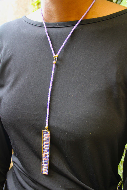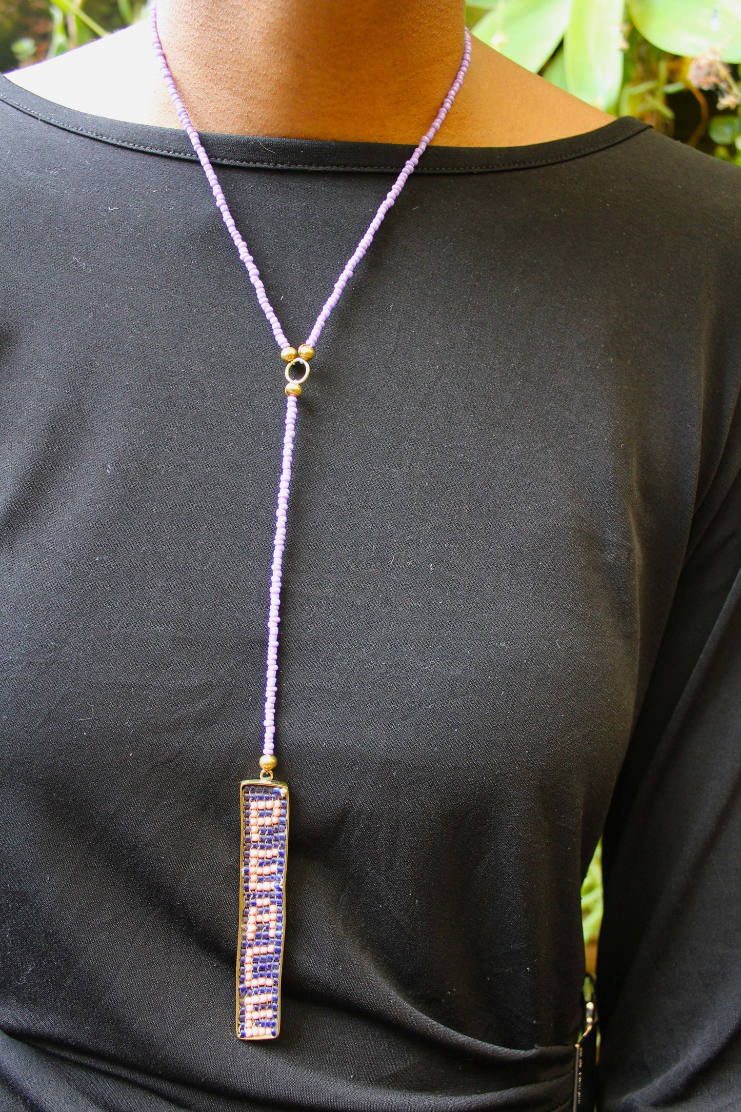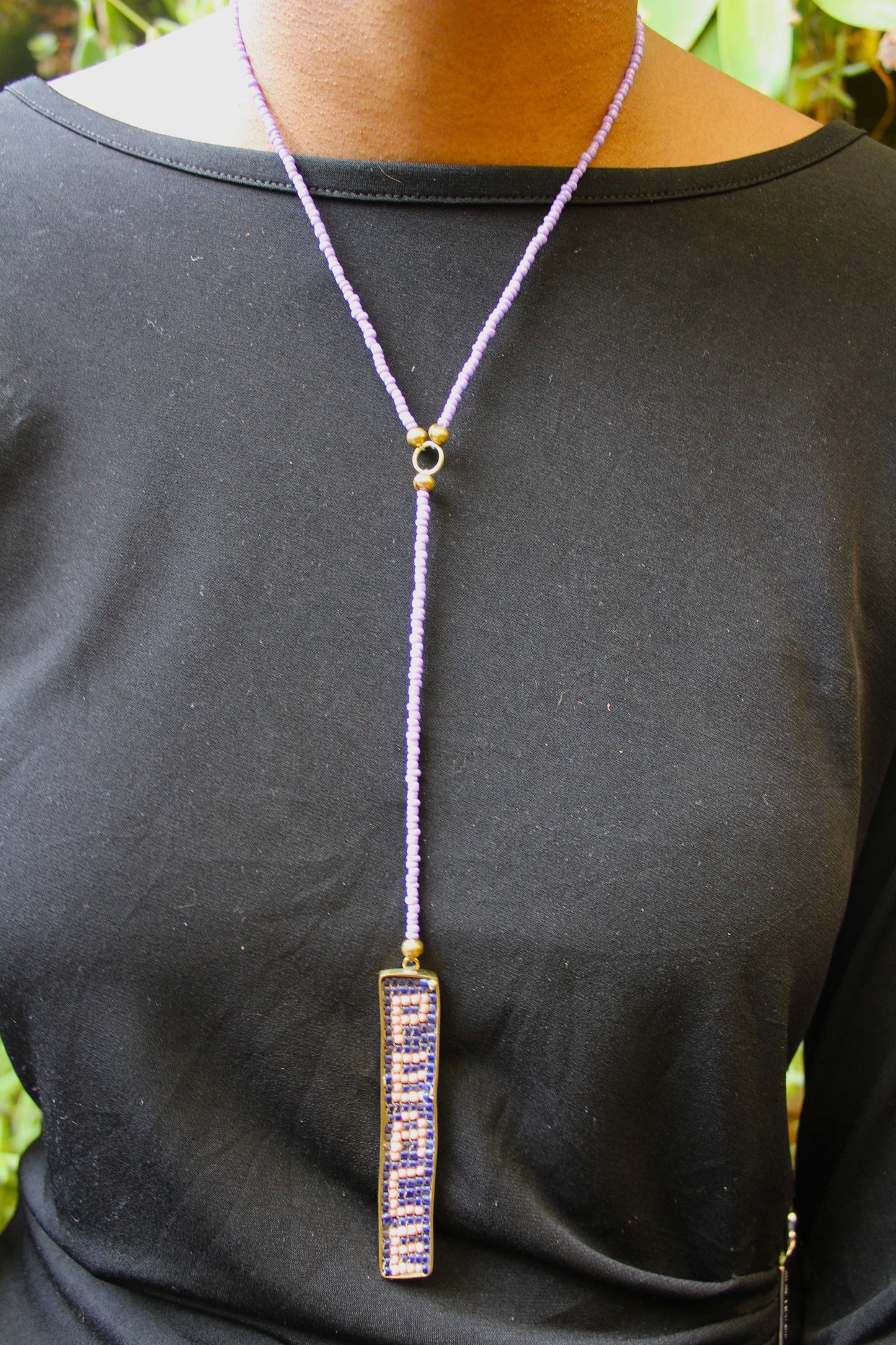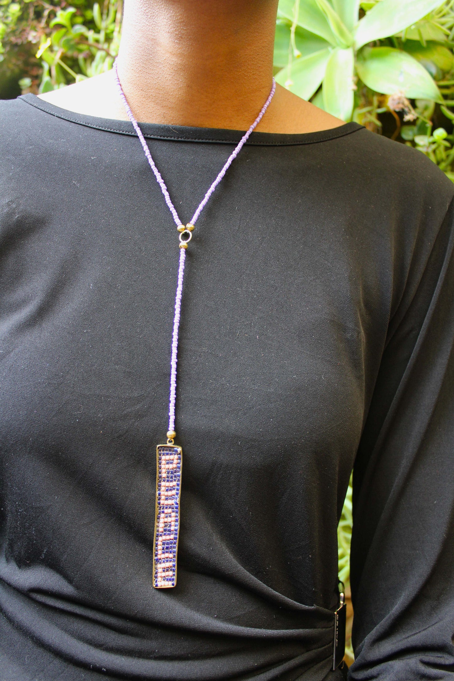 This stunning necklace is made with brass and seed beads, and the brass pendant has the word "Peace" on it. It's finished with a high-quality brass clasp, and it's both beautiful and meaningful.