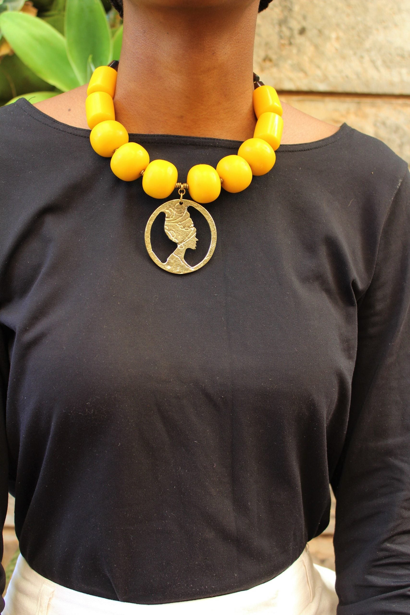 A beautiful. statement, necklace crafted with brown african beads, a brass pendant and finished with a brass clasp.
