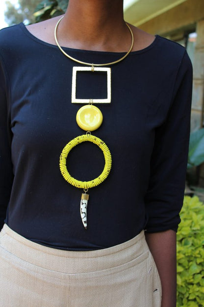 Crafted with colorful seed beads and brass, horn pendants. Finished with a brass clasp.