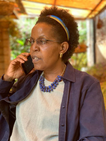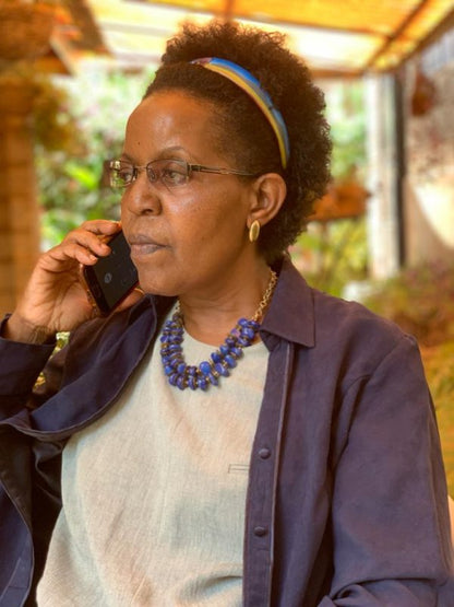 Crafted with brass chain, blue stone beads and spacers. Finished with a brass clasp and has an extender chain.