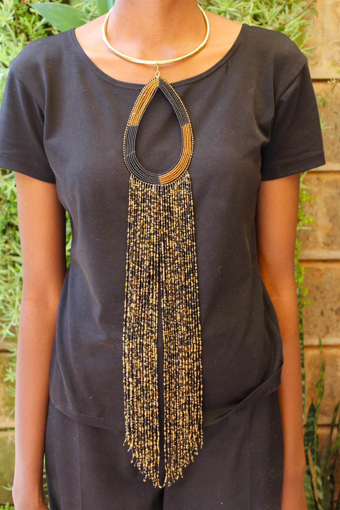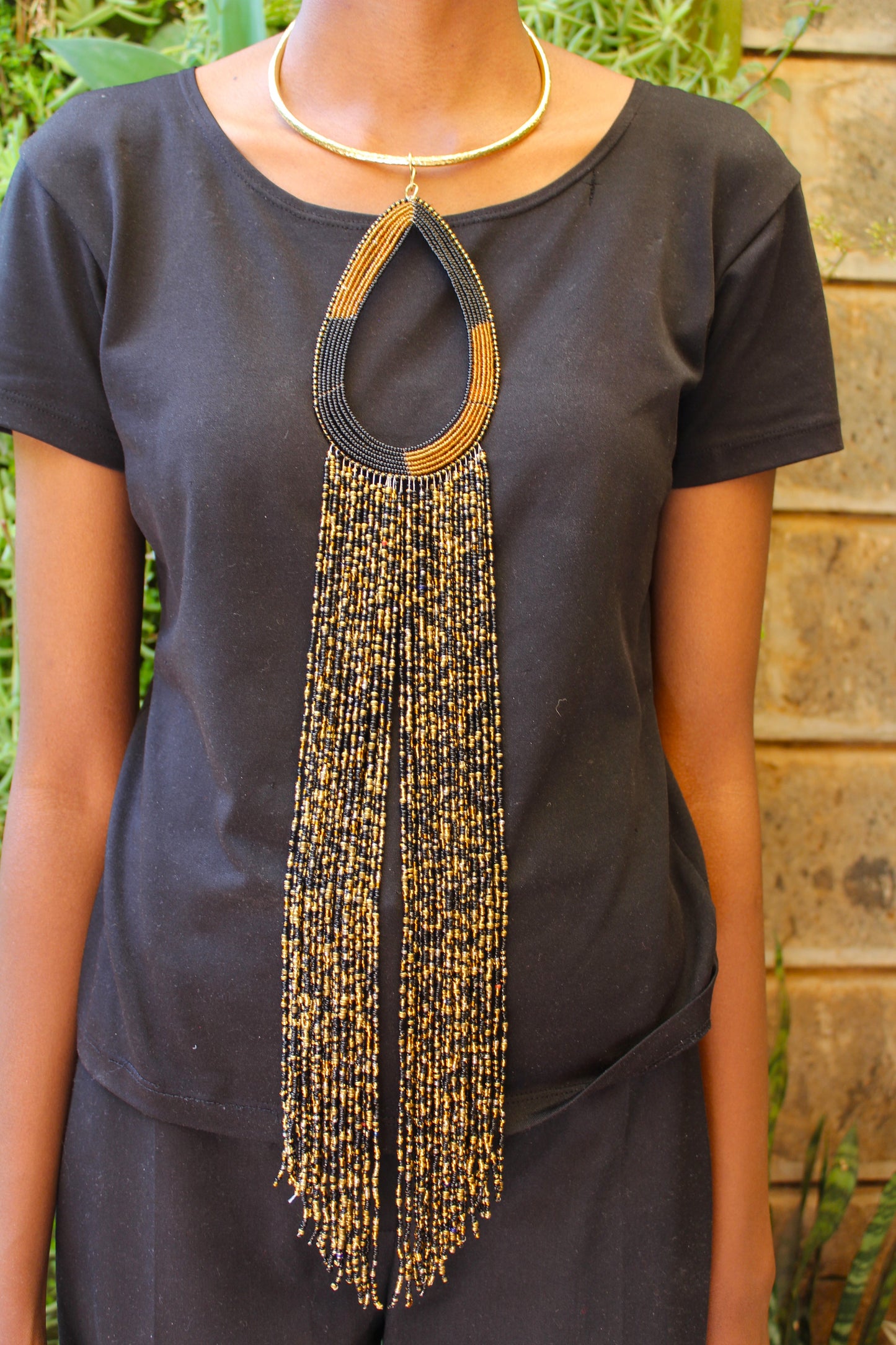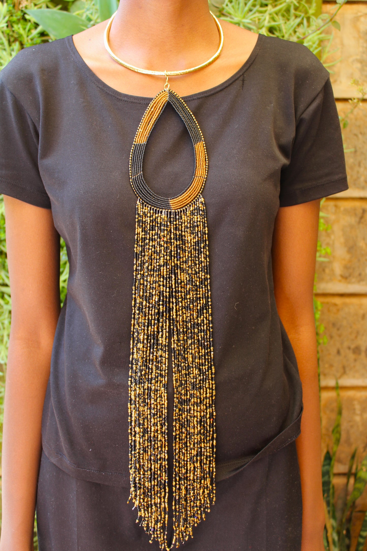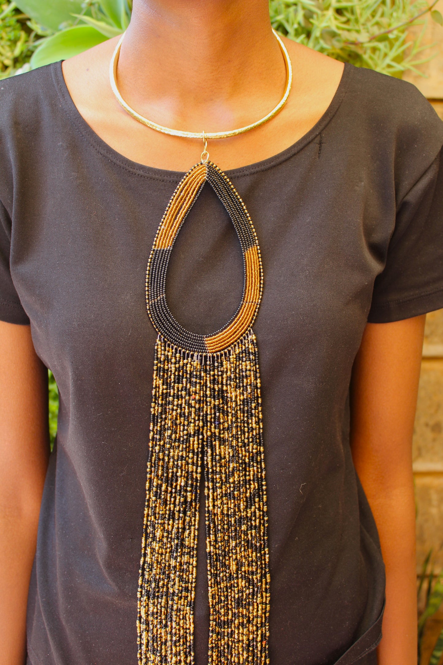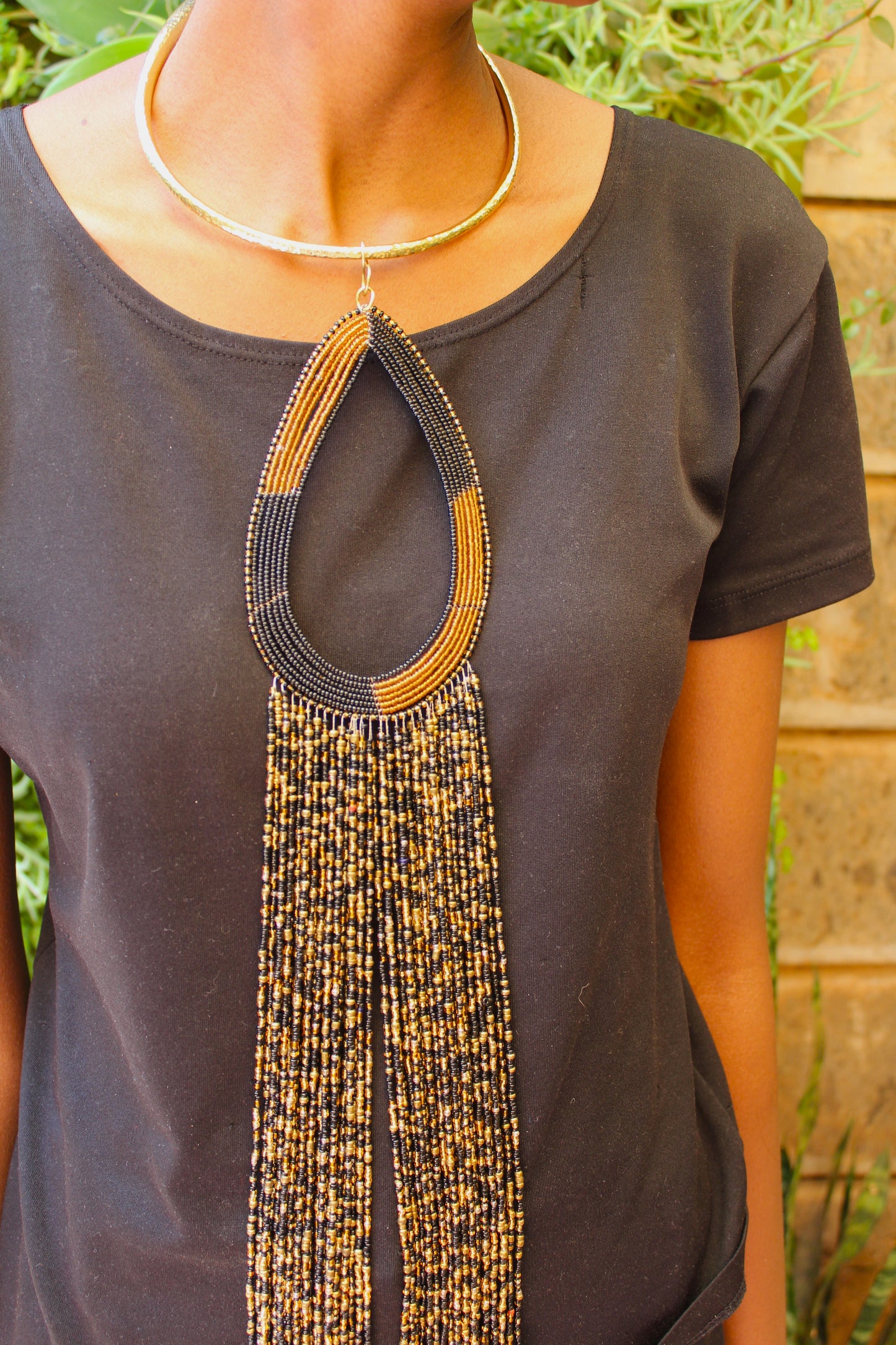 Embrace the beauty and tradition of the Maasai culture with this stunning beaded pendant featuring a striking mix of black and gold seed beads. Completed with an the elegant brass neckpiece.