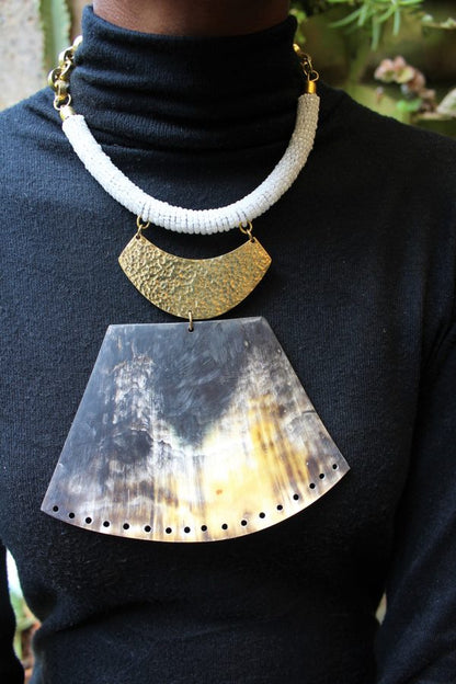 Crafted with seed beads and a brass and horn pendants.