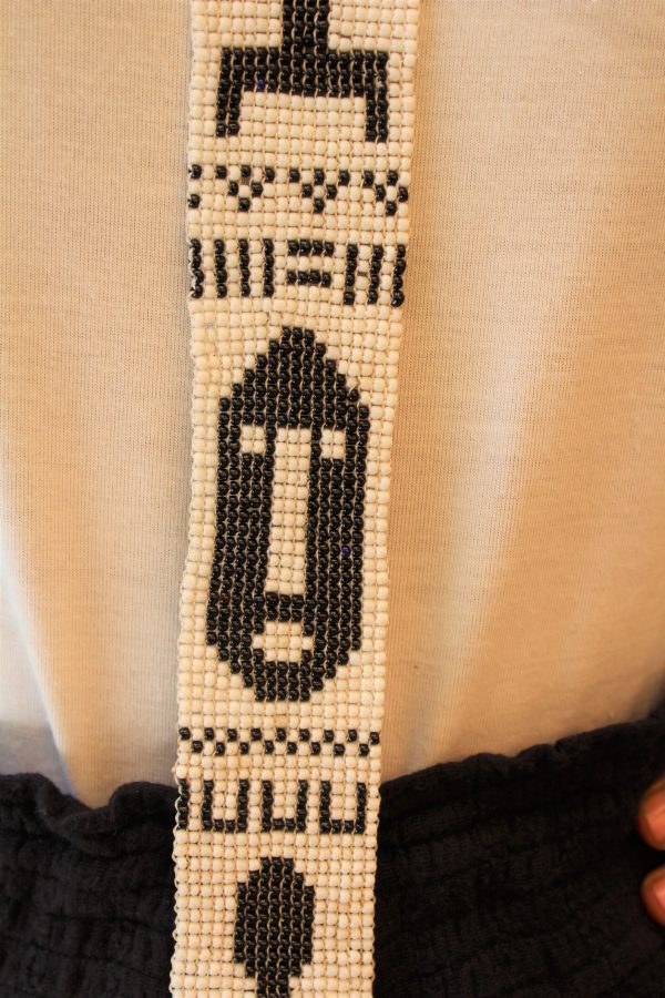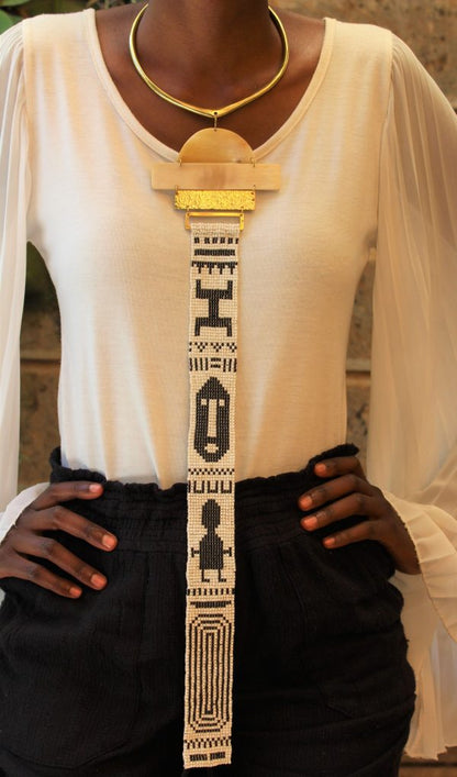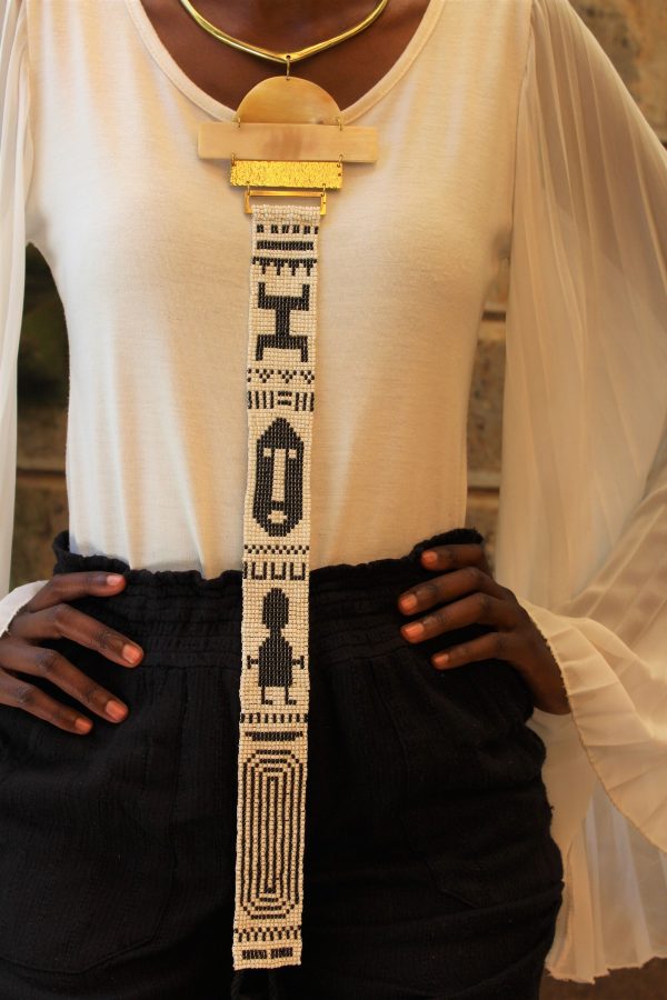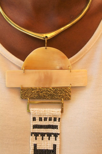 Crafted with brass, horn pendants and seed beads. Does not have a clap, has an open back.