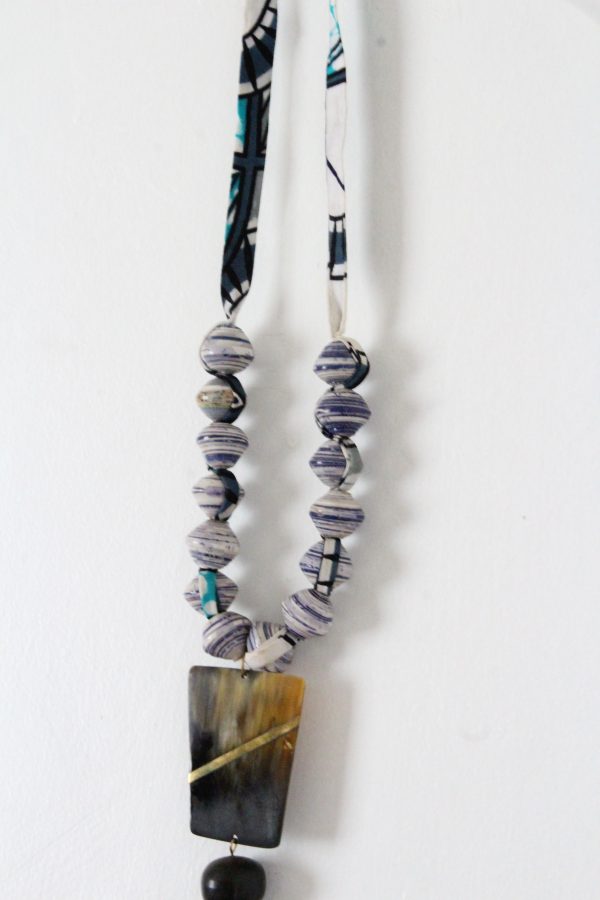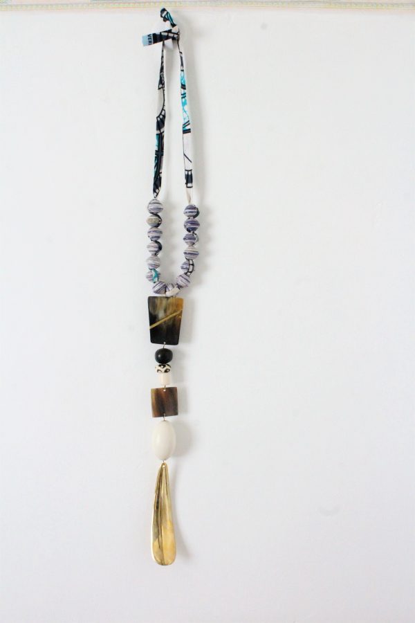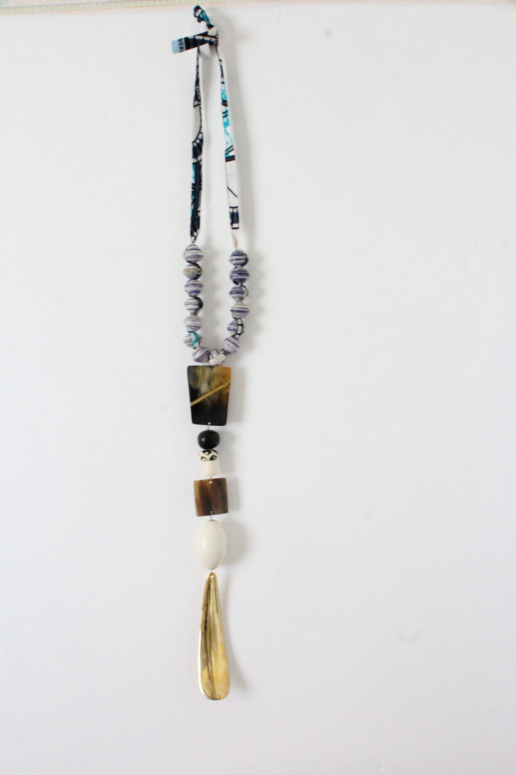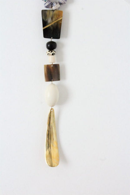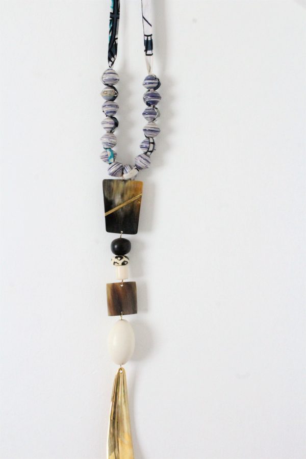 This beaded wall hanging is crafted with beads, brass and fabric..