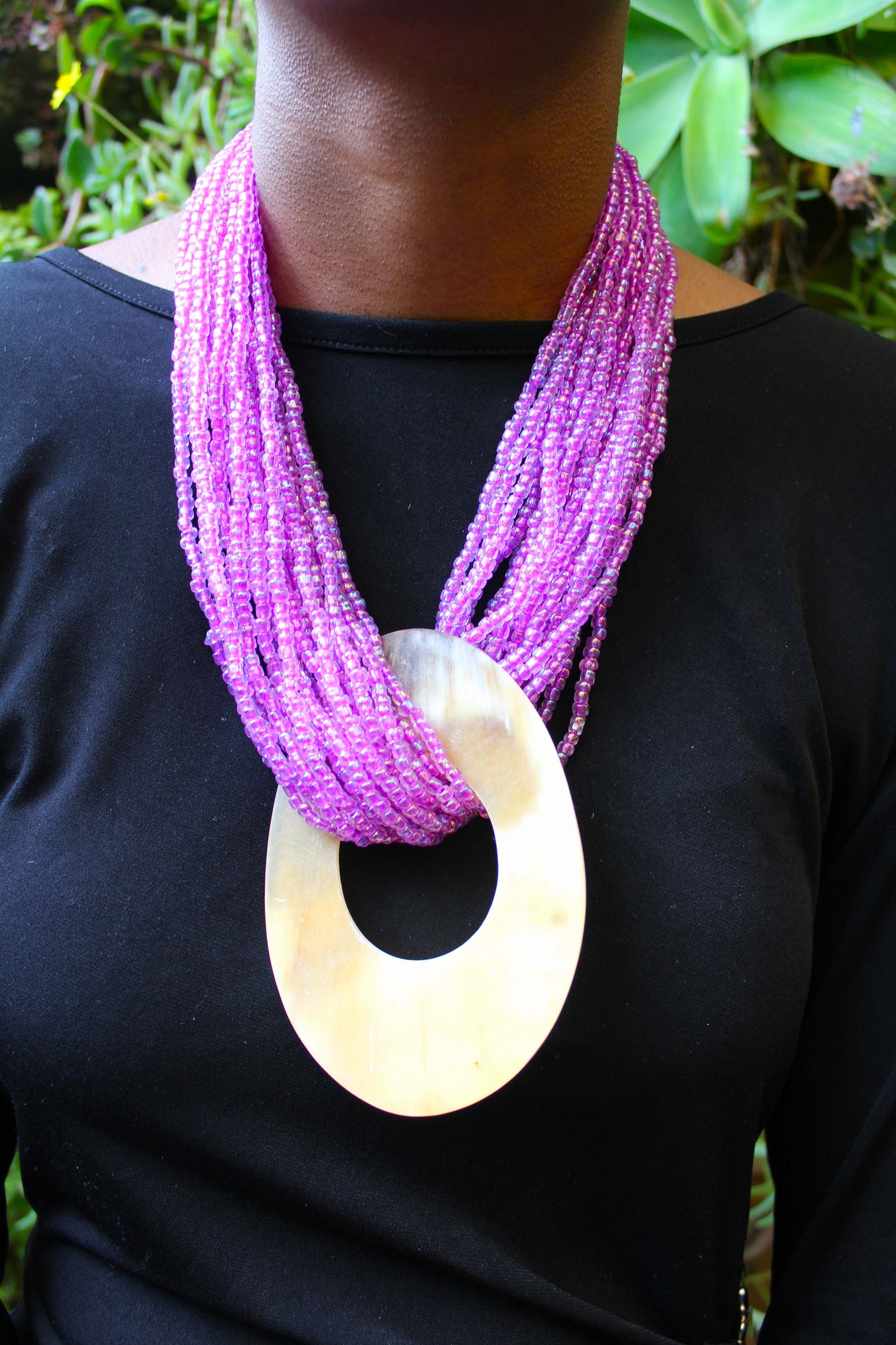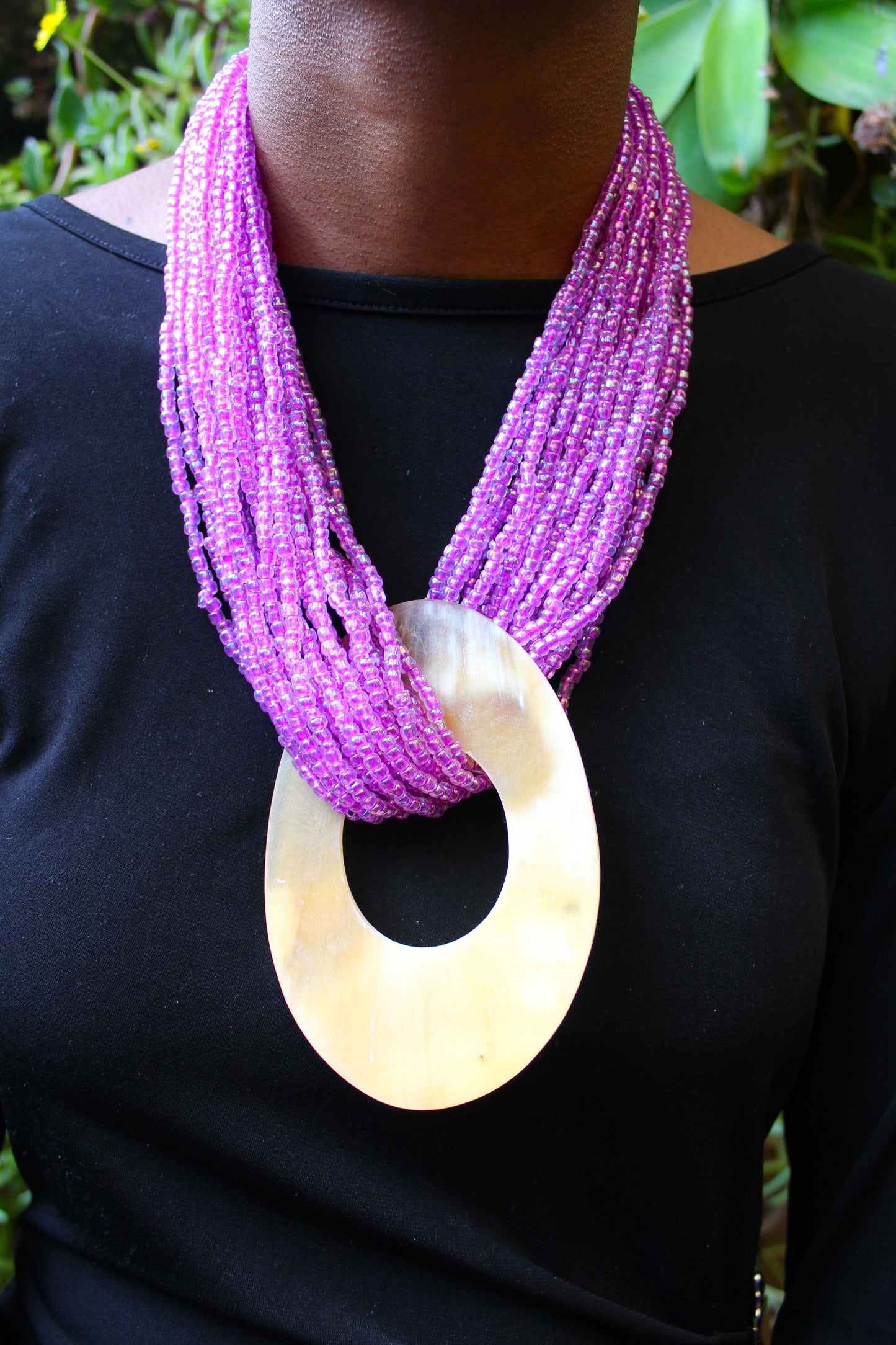 This necklace is a stunning, one-of-a-kind piece of jewelry. I crafted it from seed beads and added a handmade horn pendant for a touch of African flair. It's finished with a brass clasp that's sturdy and easy to use. The seed beads come in a gorgeous array of colors, and they may appear slightly different in person depending on the lighting.