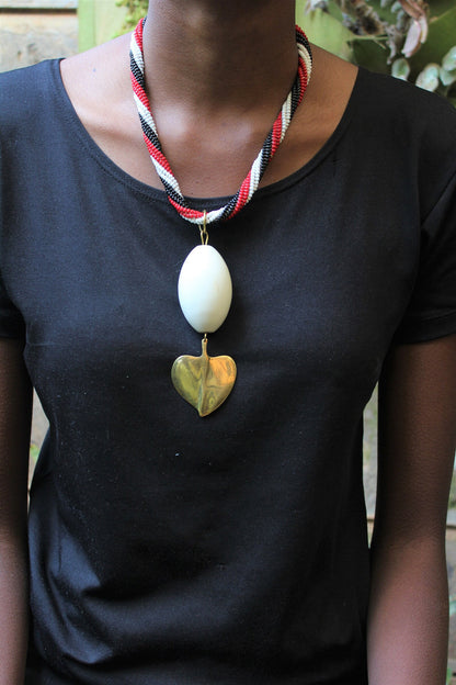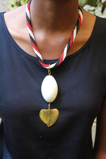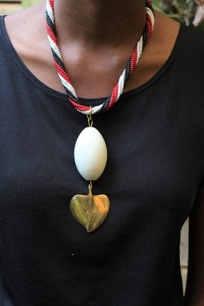 Crafted with seed beads and brass, bead pendants. Finished with a beaded ball and hole clasp.