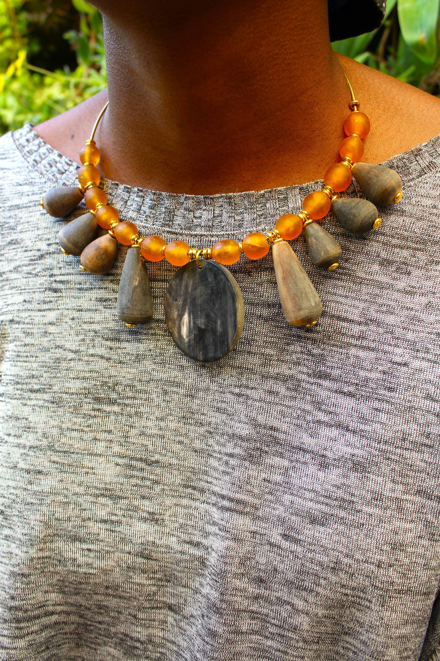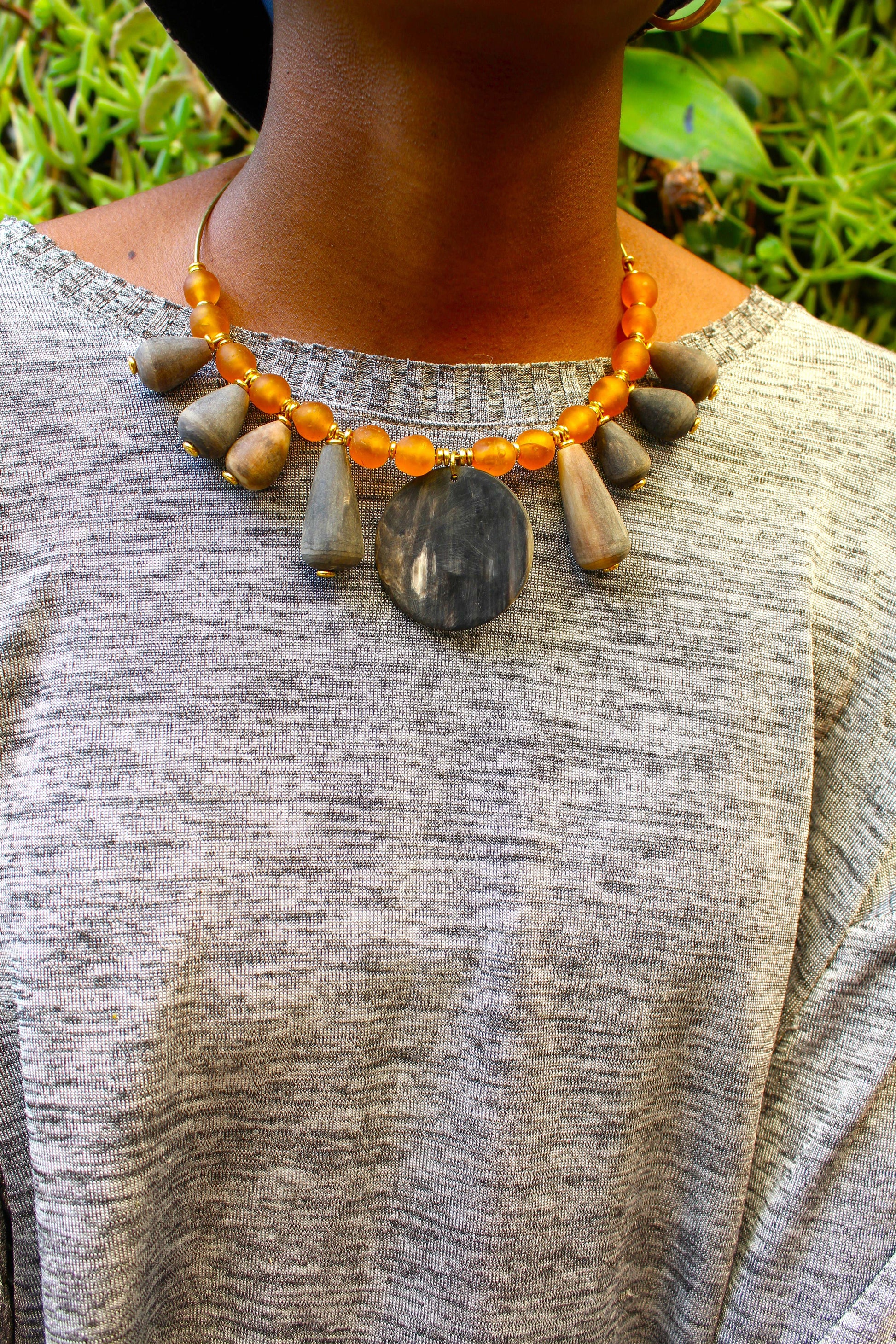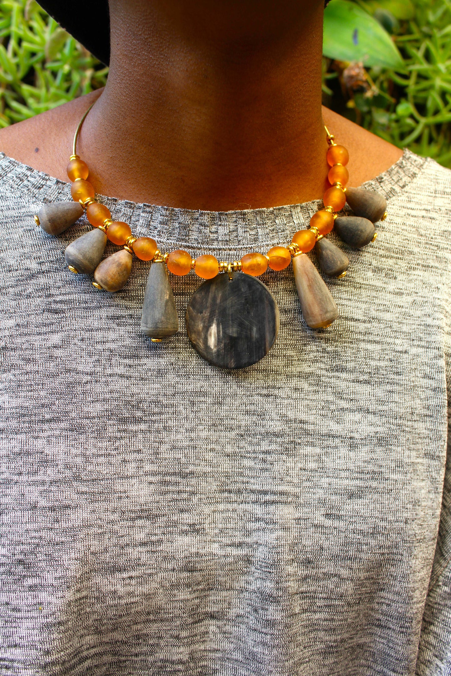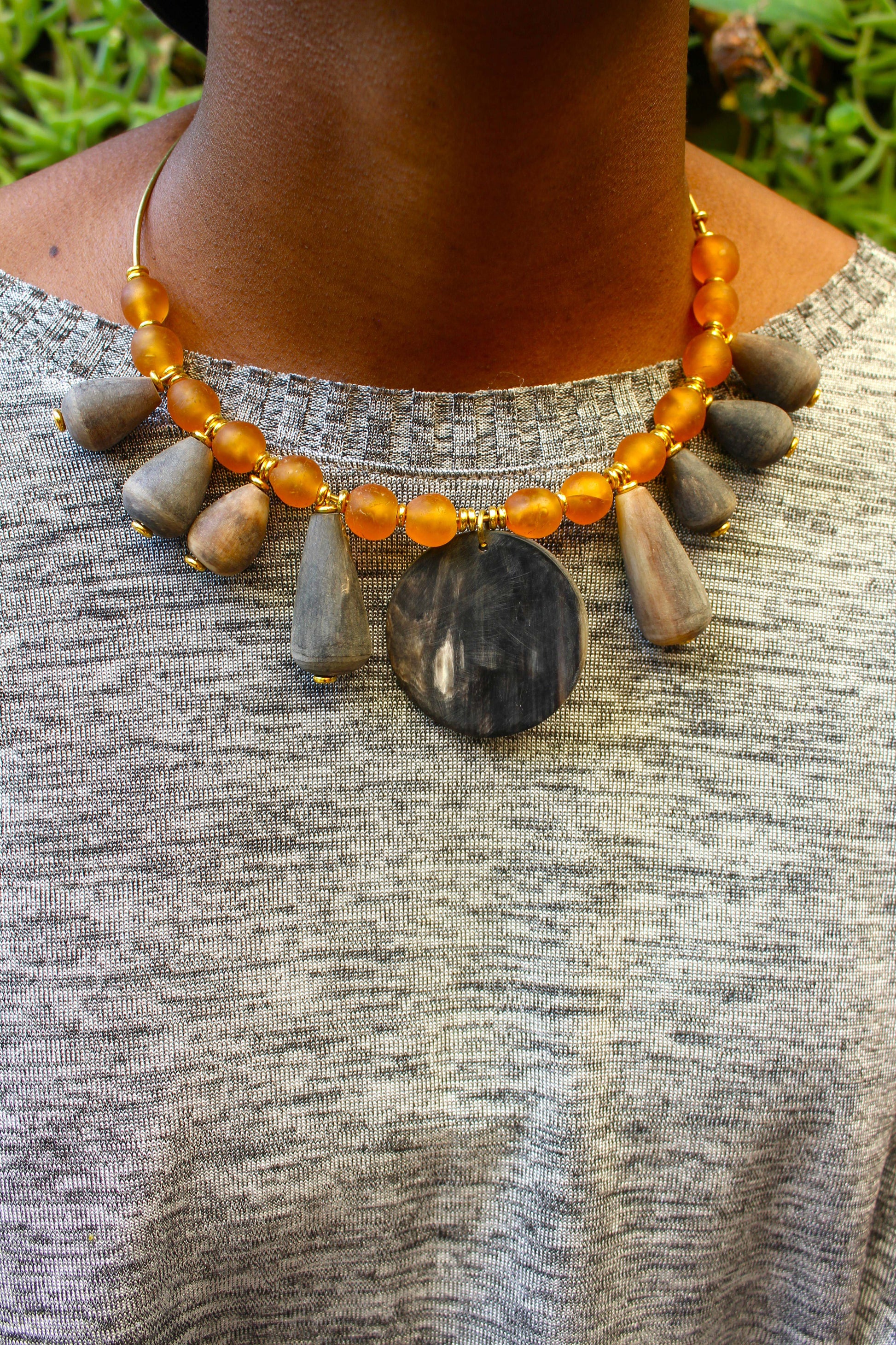 Expertly crafted in Nairobi, Kenya using high-quality brass wire, horn beads, and beautiful West African glass beads.