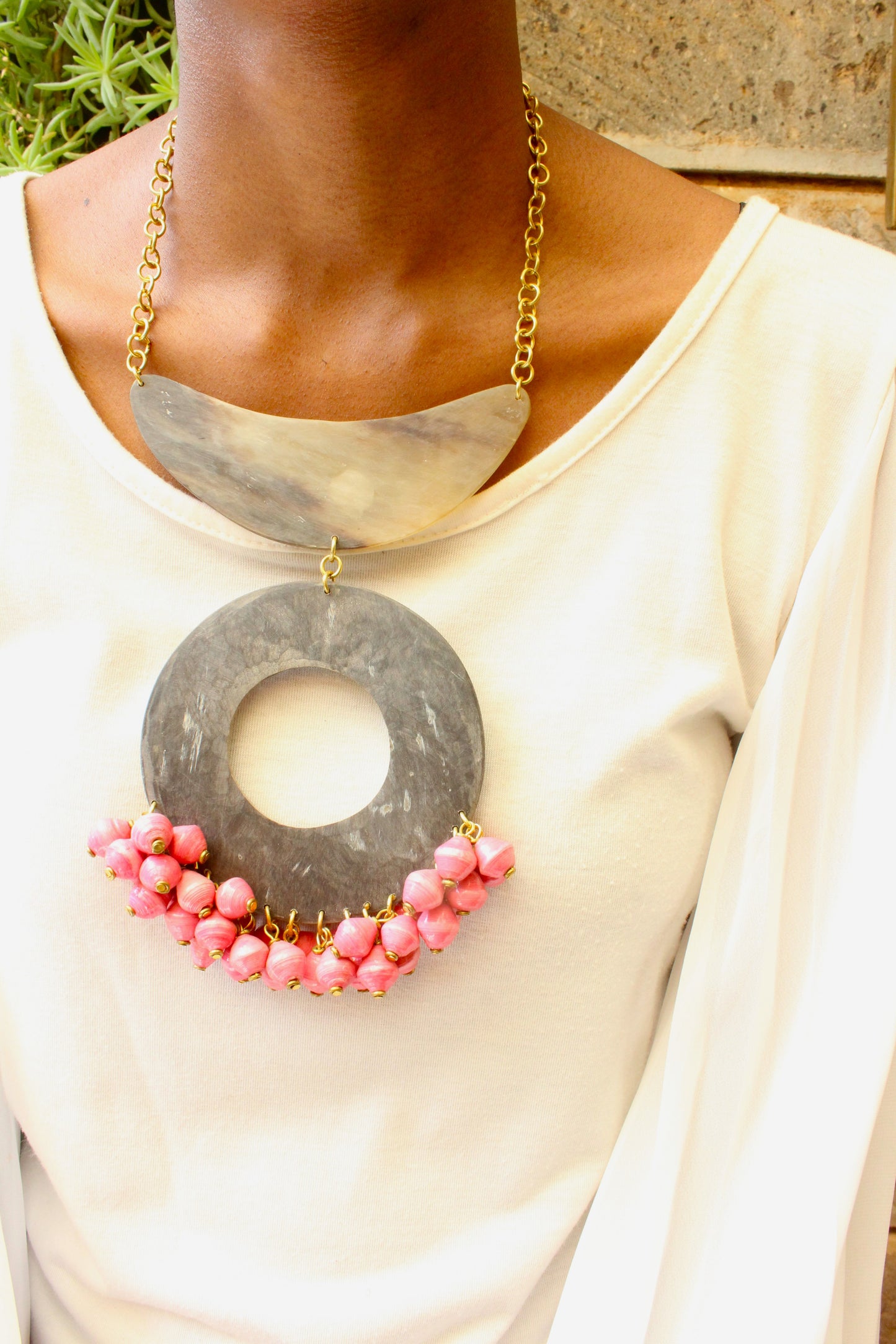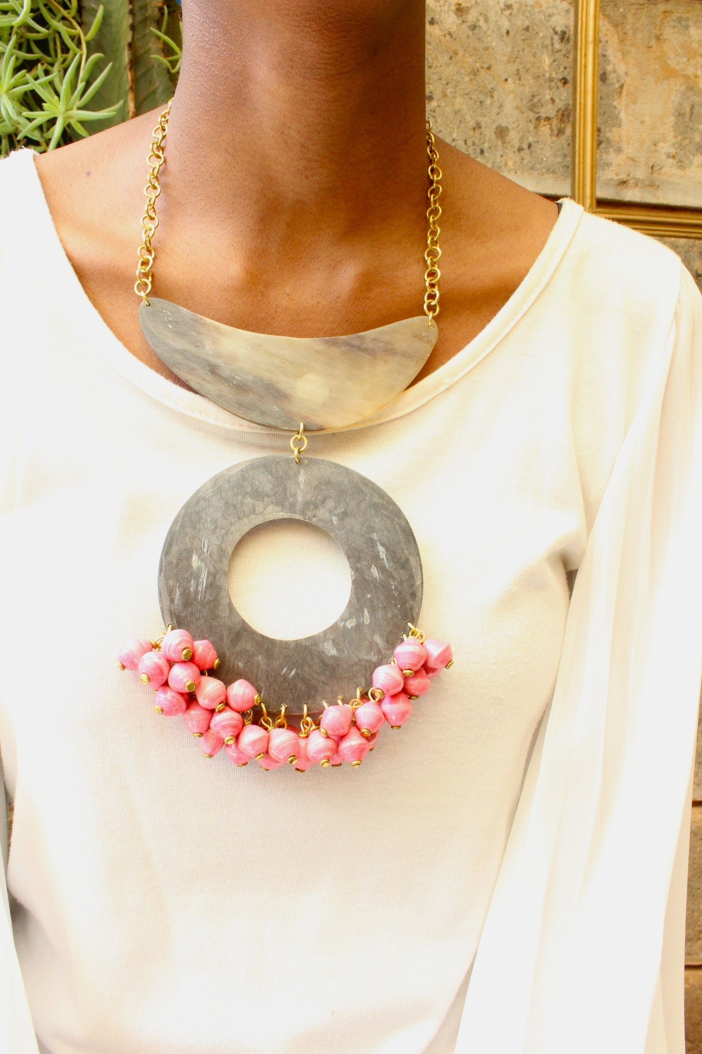 Nairobi-made and naturally lit, this quirky necklace packs a punch with horn pendants, pink paper beads, and a brass chain. Its shiny brass clasp adds a fun touch. Please note, color may vary in person.
