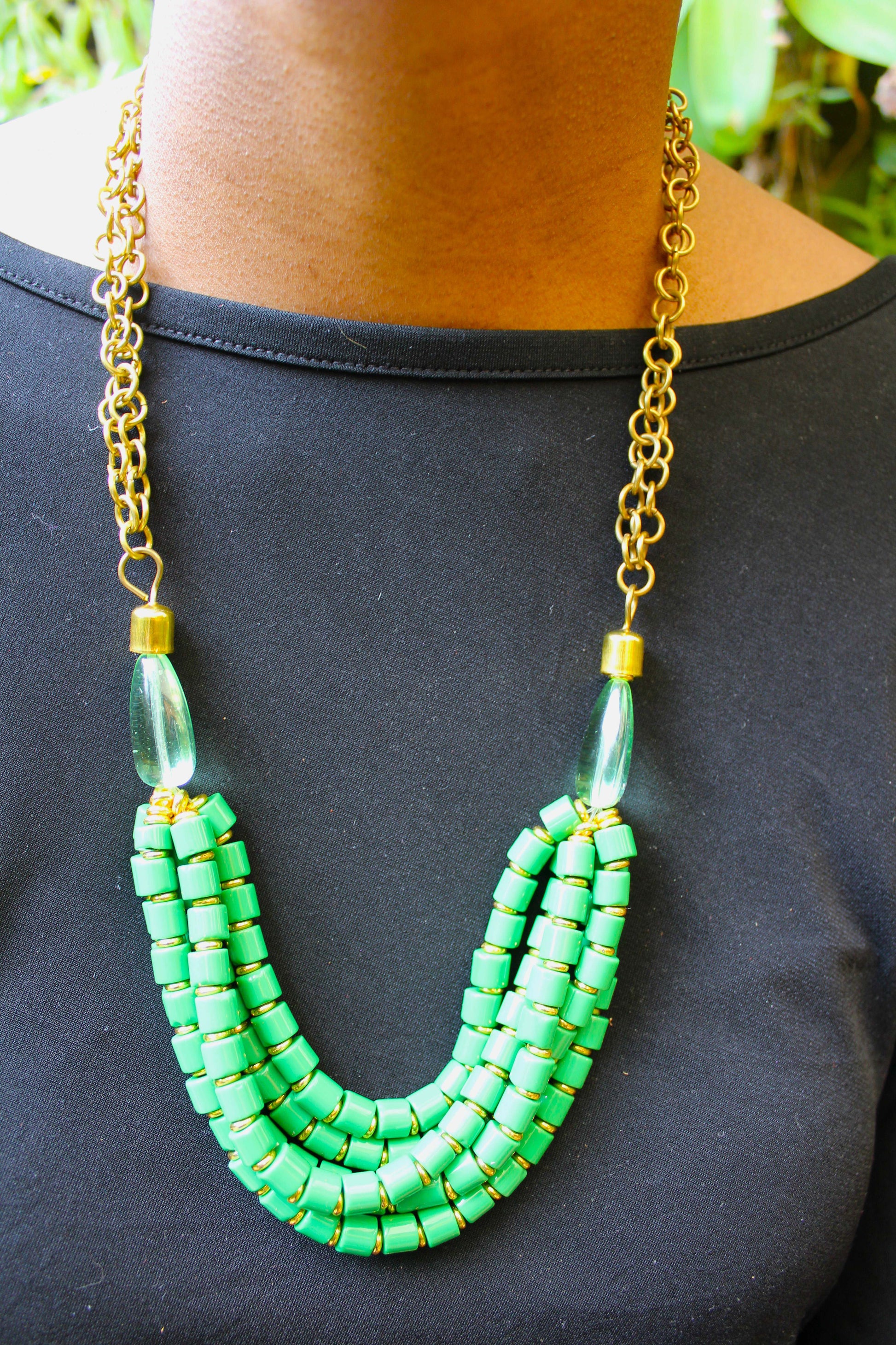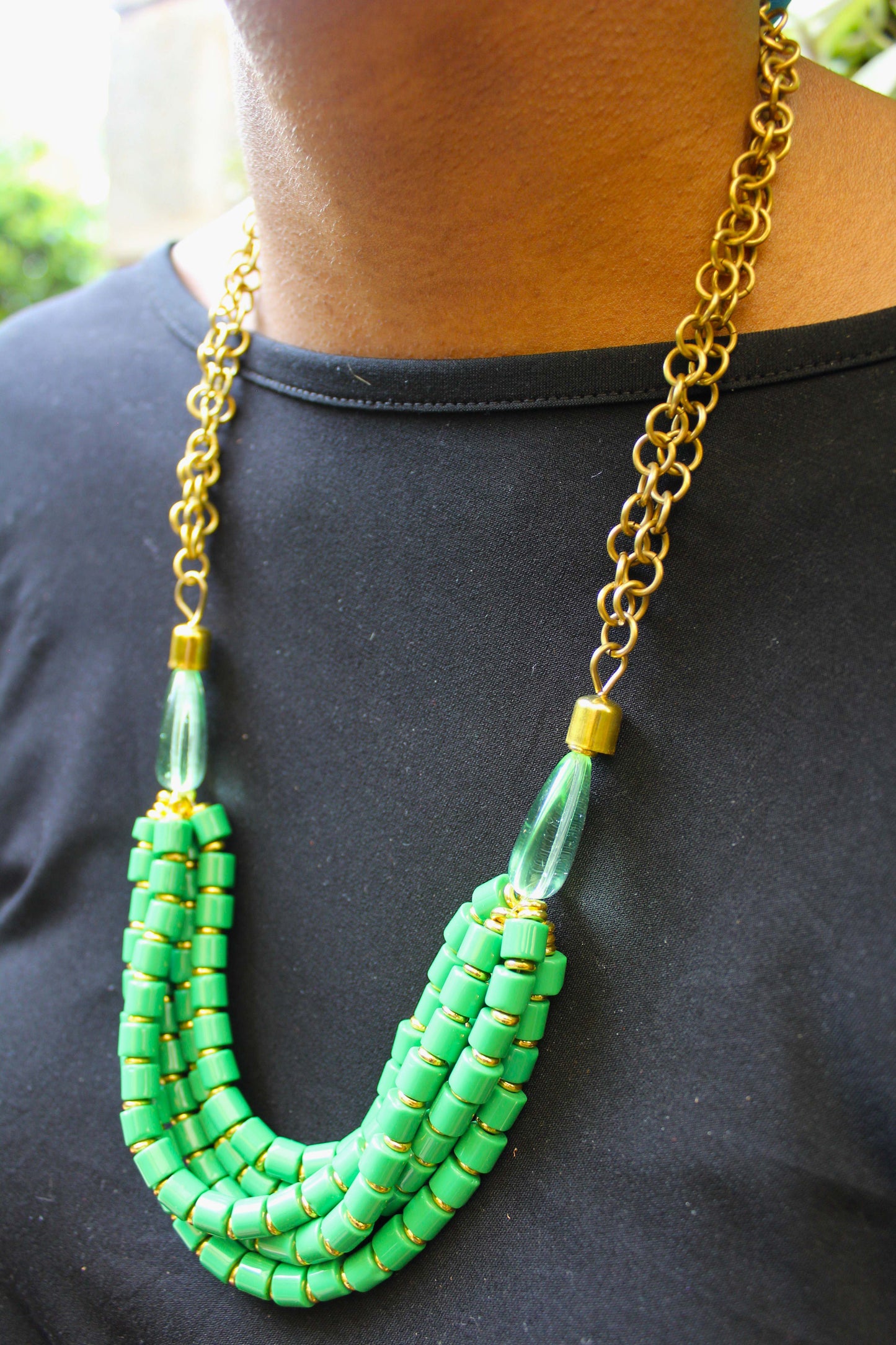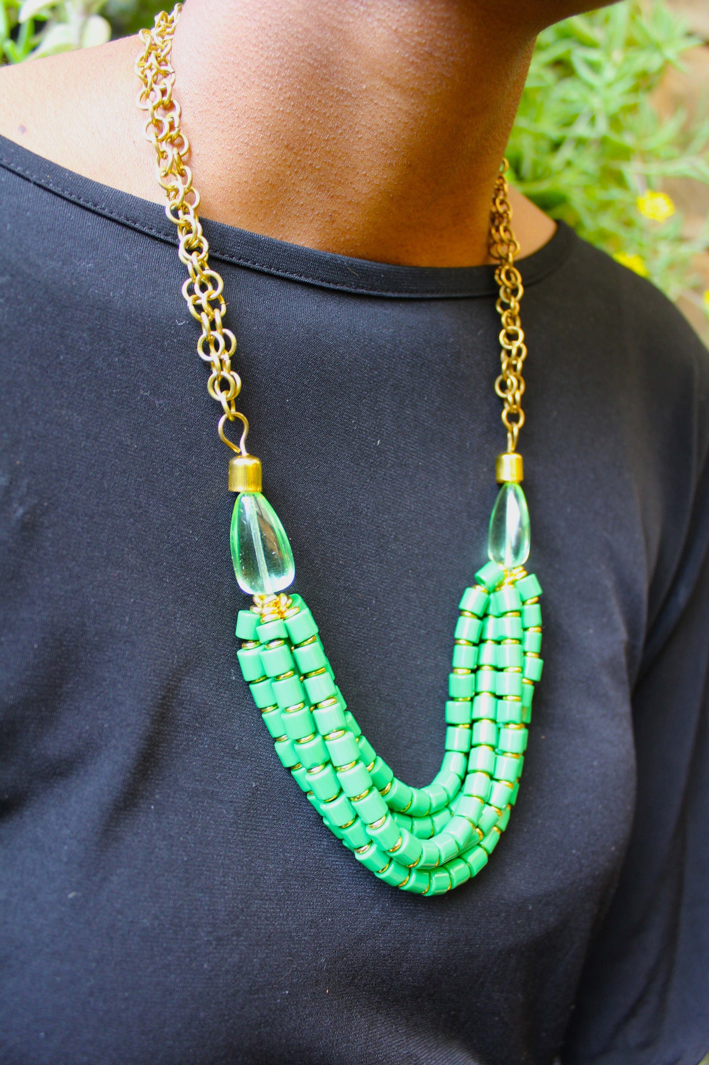 This necklace is unique, eye-catching, and handmade. It includes green beads, brass spacers, and handmade brass chain. The necklace is secured with a brass clasp. This piece would be an excellent gift for a special occasion like a birthday or an anniversary.