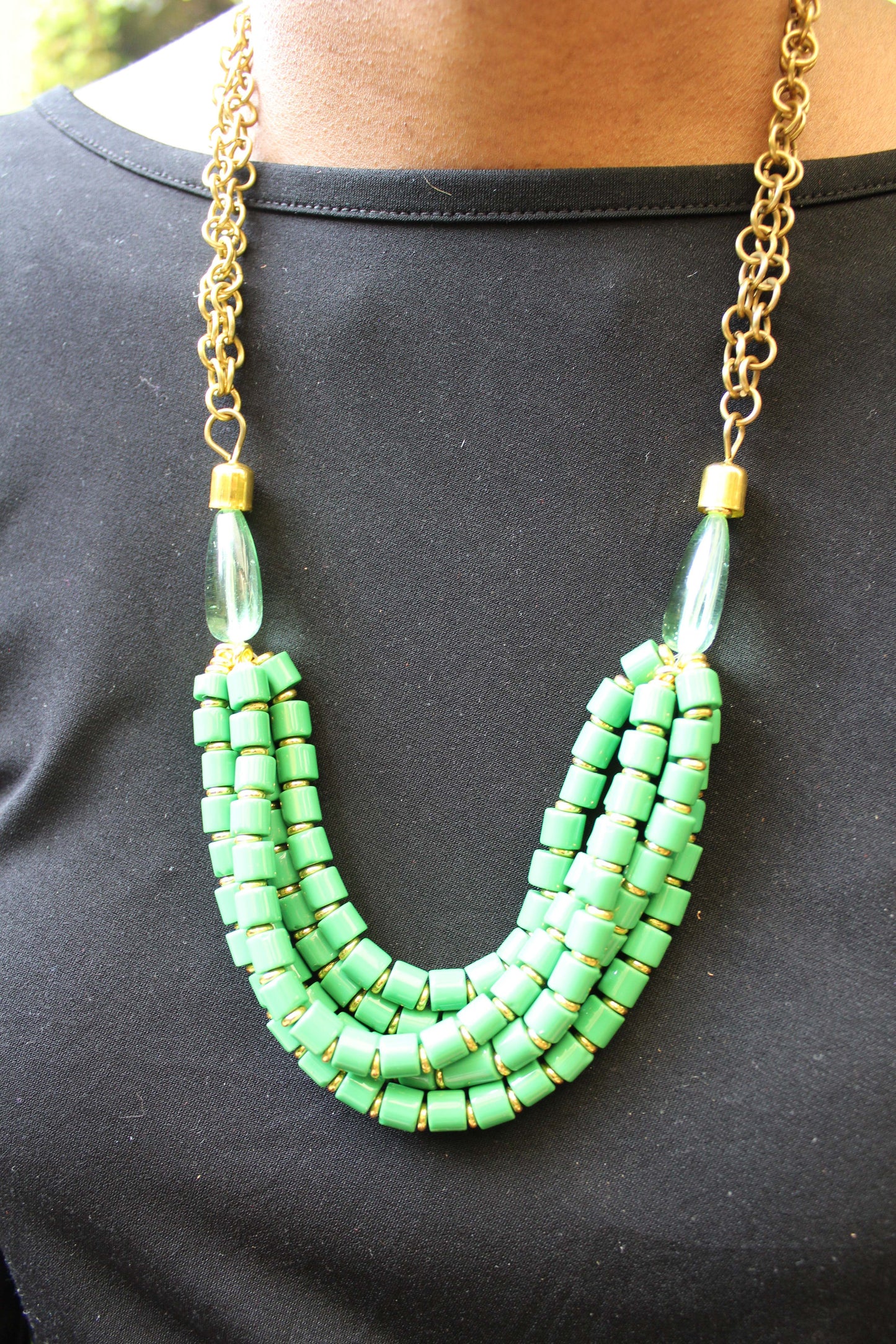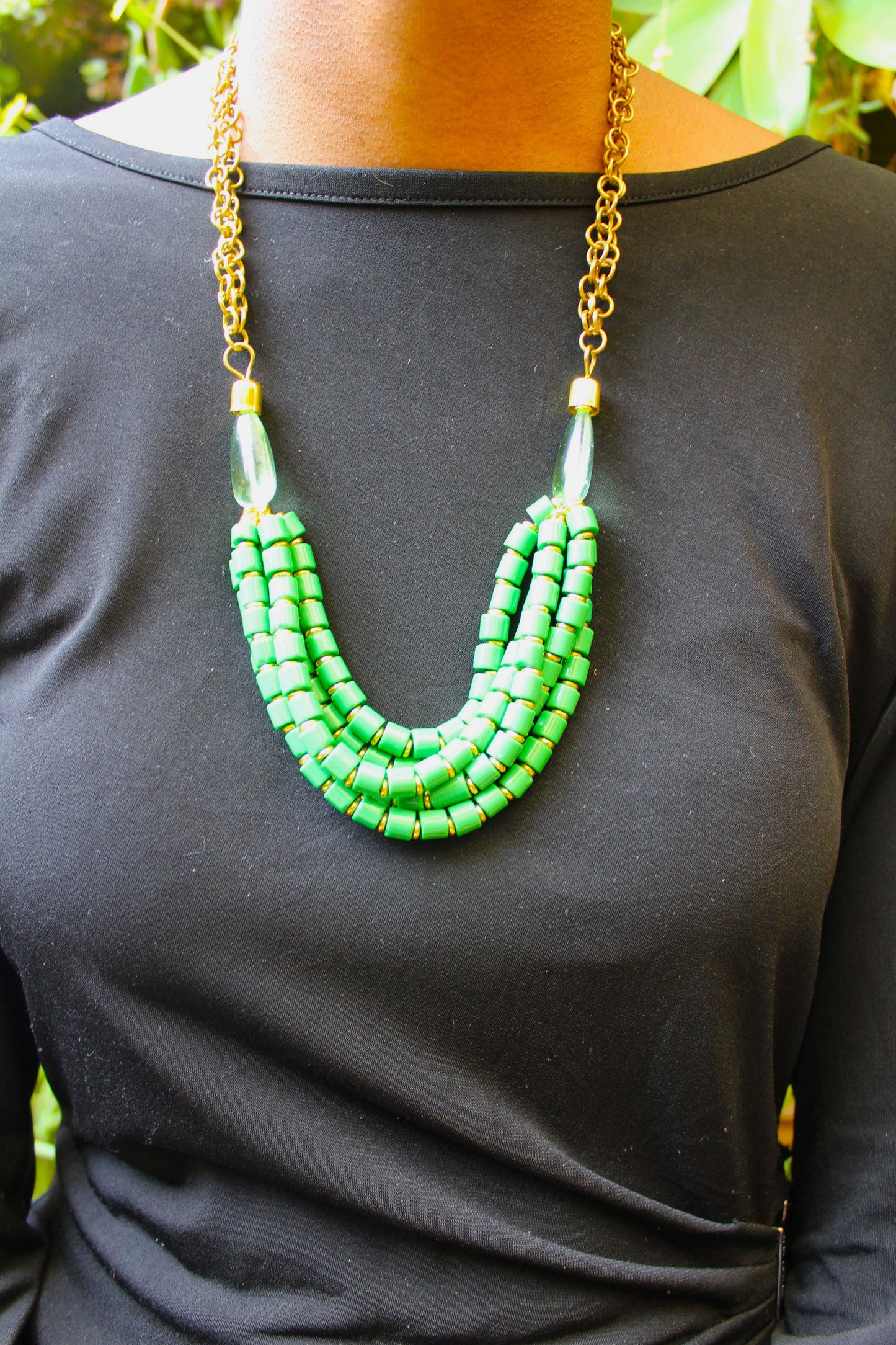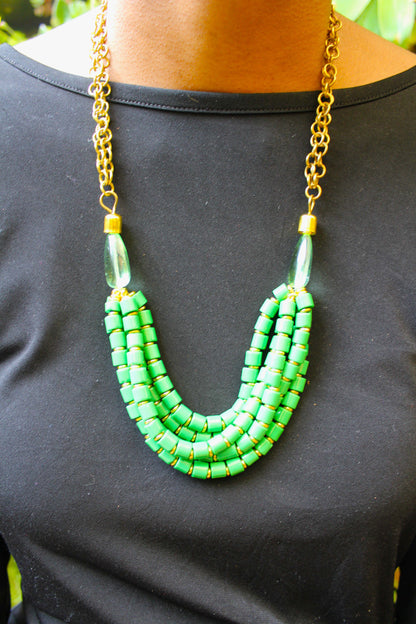 This necklace is unique, eye-catching, and handmade. It includes green beads, brass spacers, and handmade brass chain. The necklace is secured with a brass clasp. This piece would be an excellent gift for a special occasion like a birthday or an anniversary.