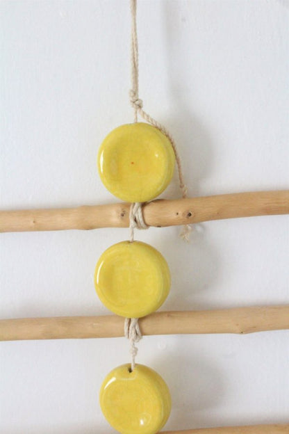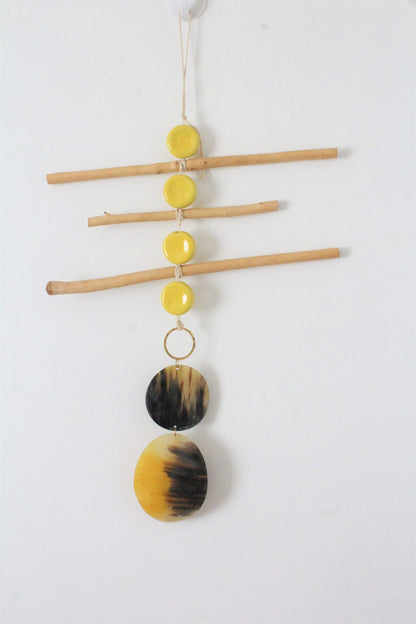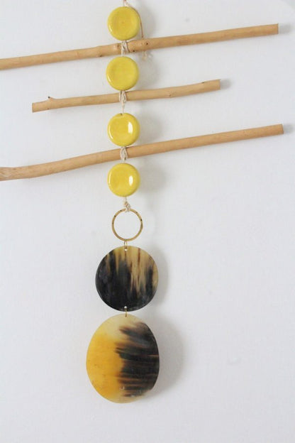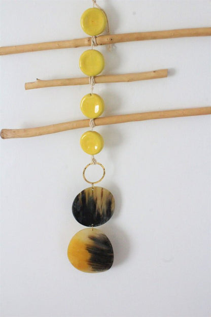 This beaded wall hanging is crafted with wood, yellow beads and horn pendants.