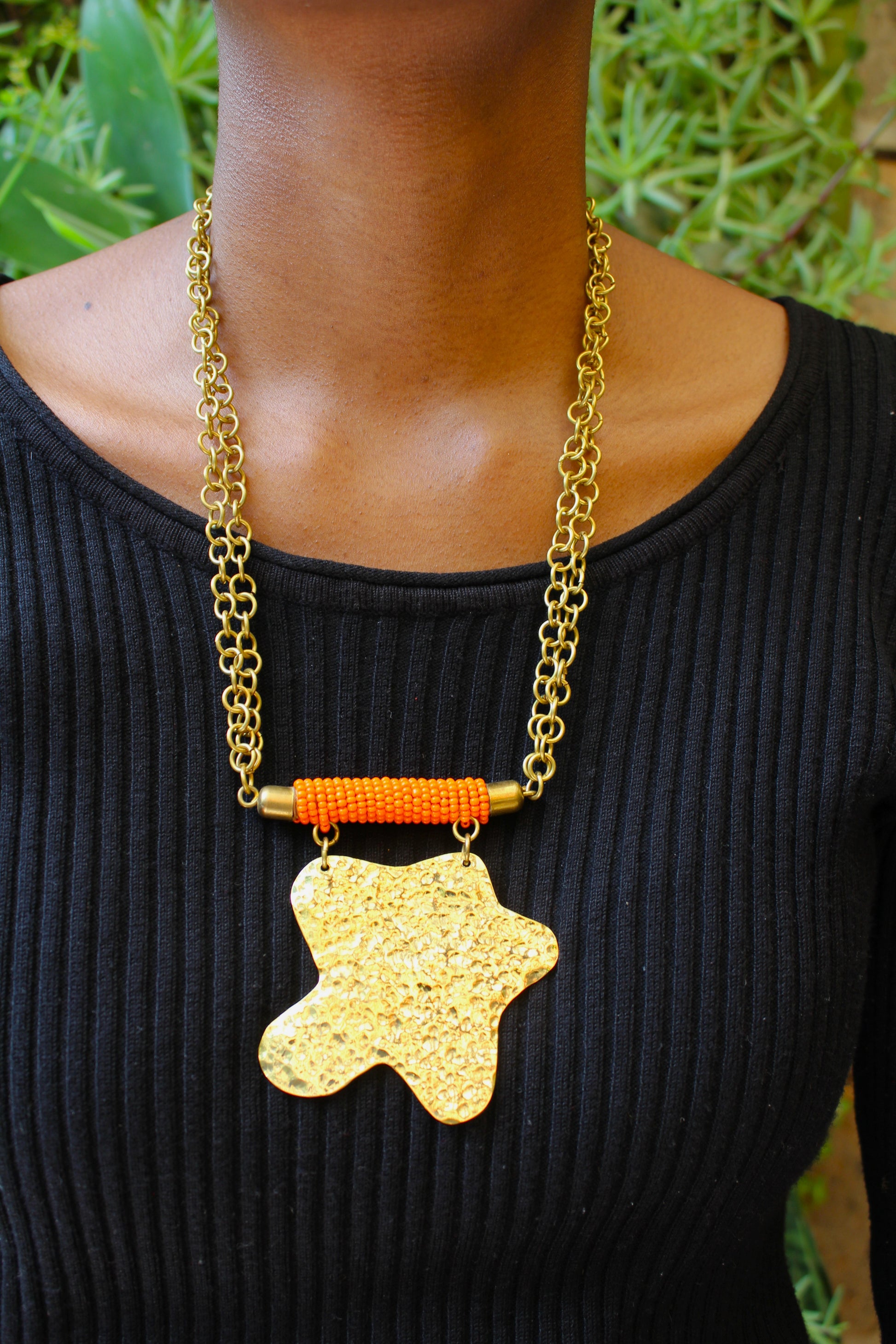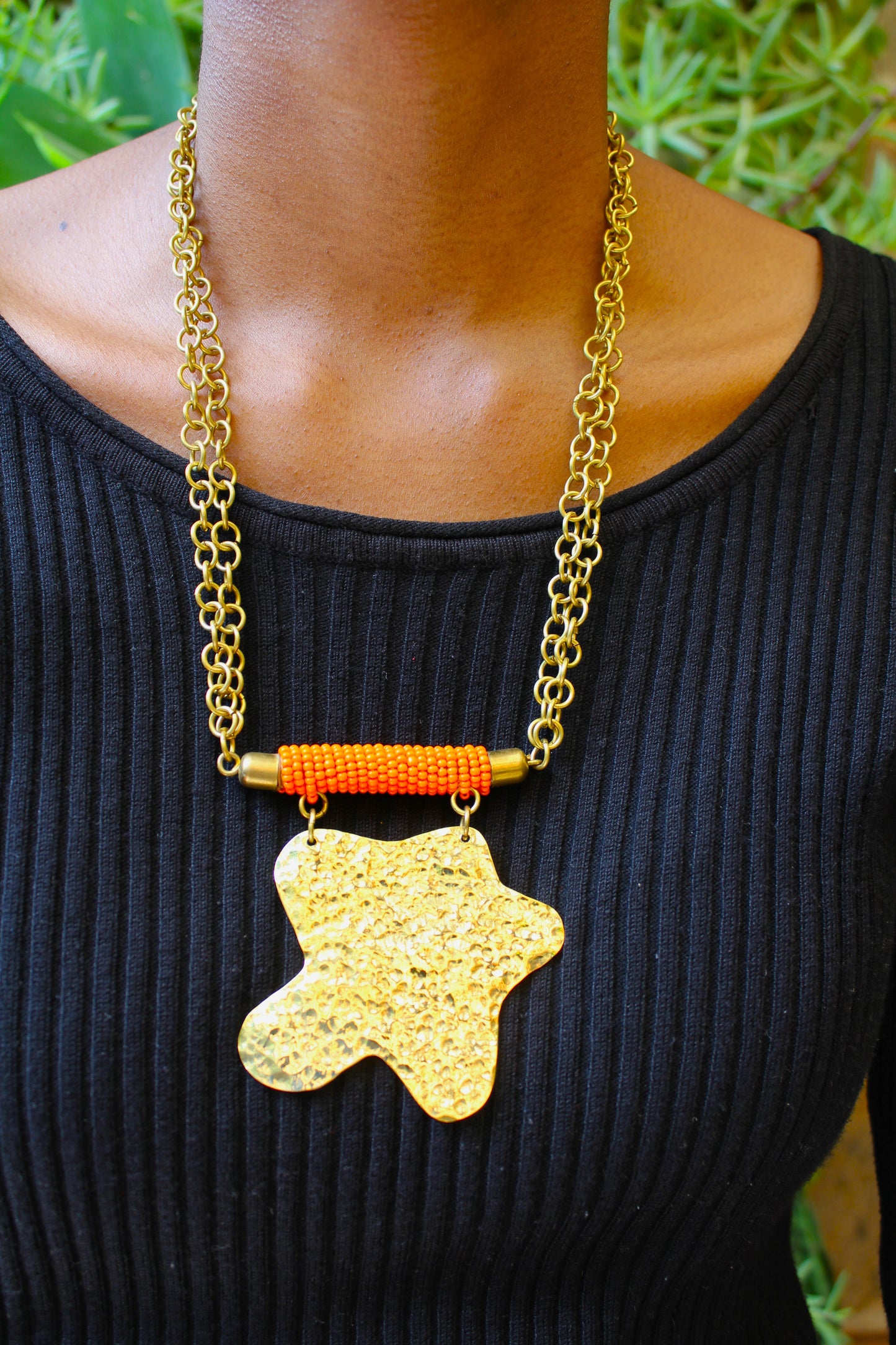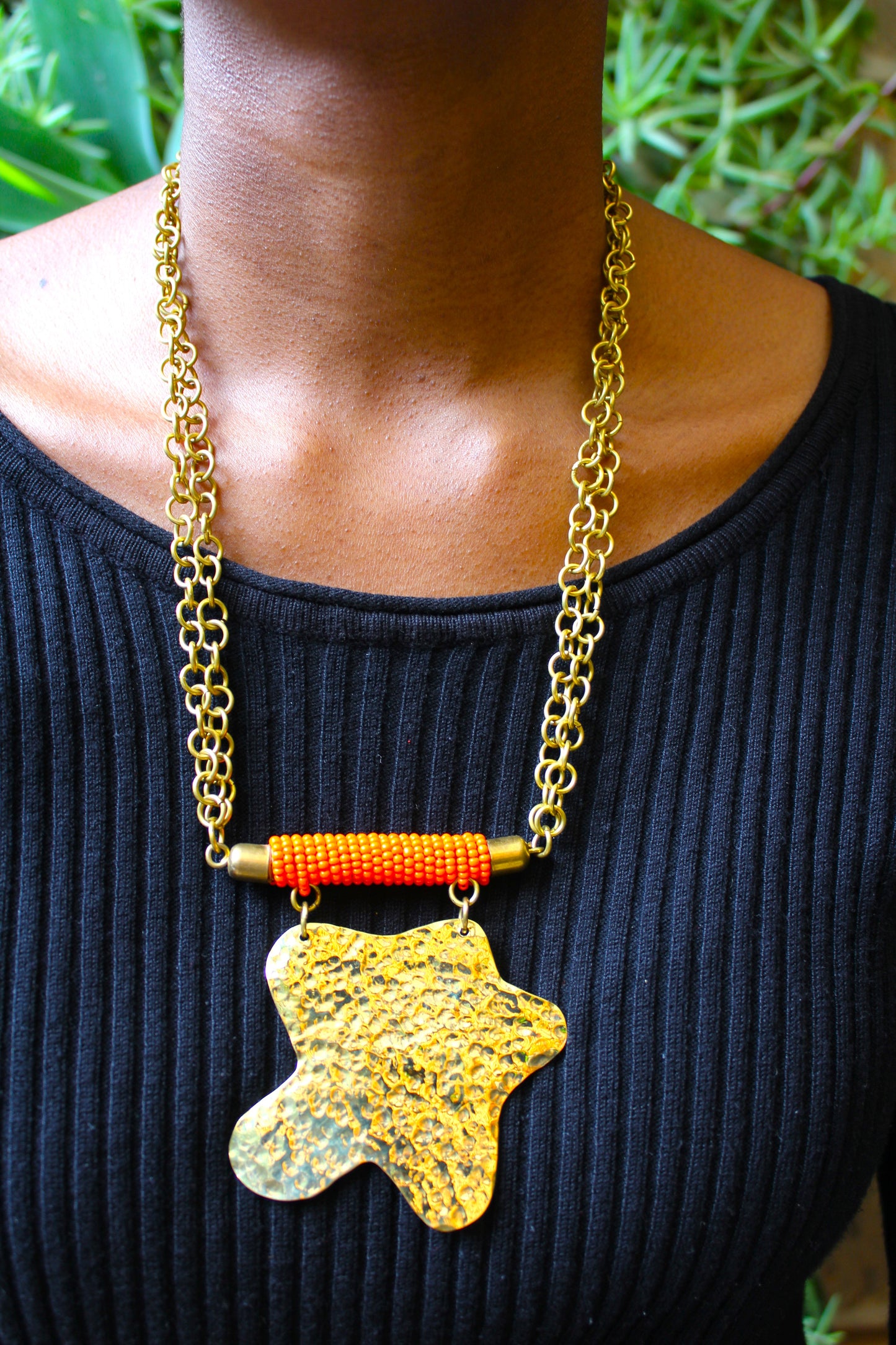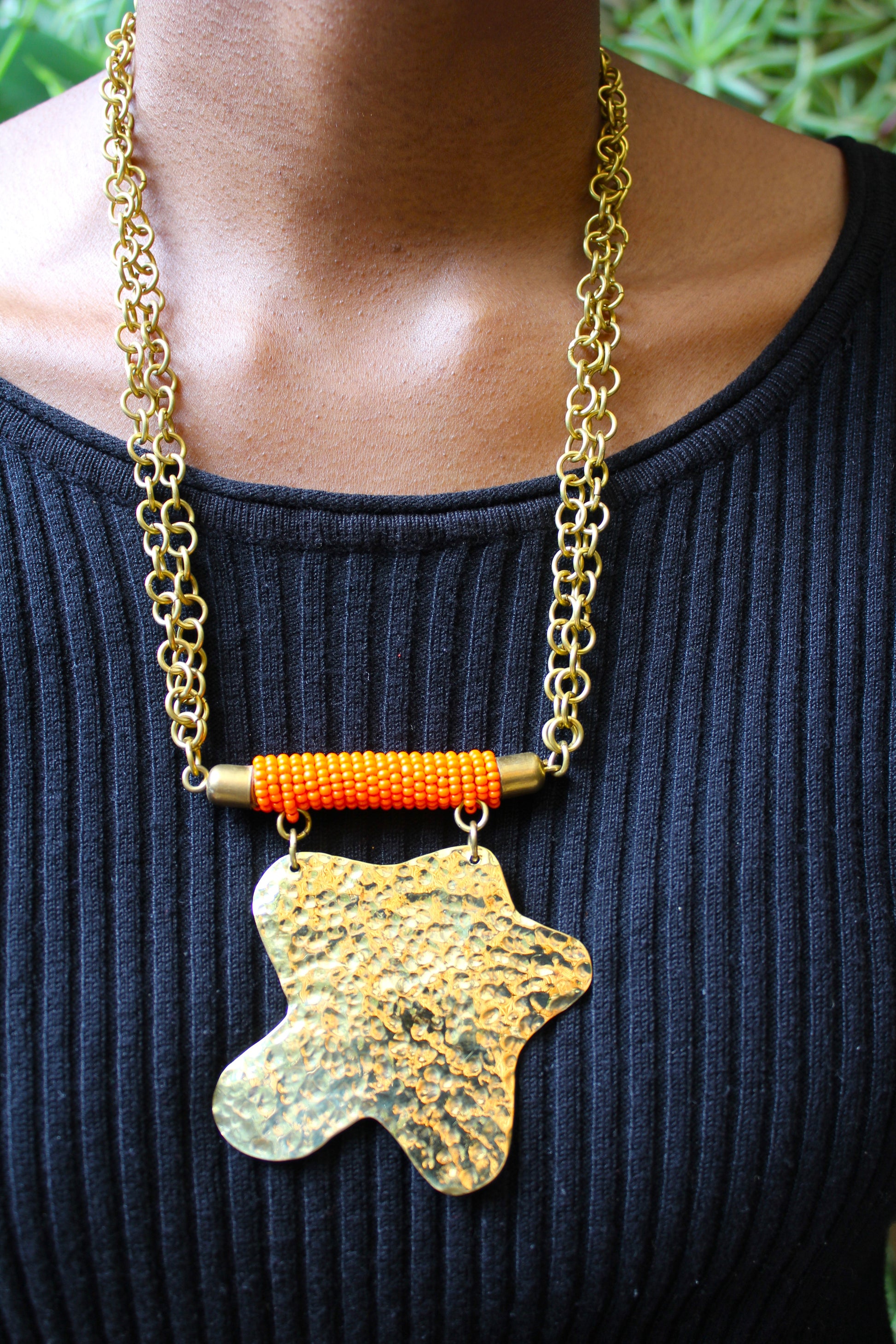 The handmade brass pendant adds a unique touch, while the durable brass chain ensures lasting wear. Complete with a secure brass clasp, this piece is not just jewelry; it's a statement of artistry and elegance that will enhance any outfit.