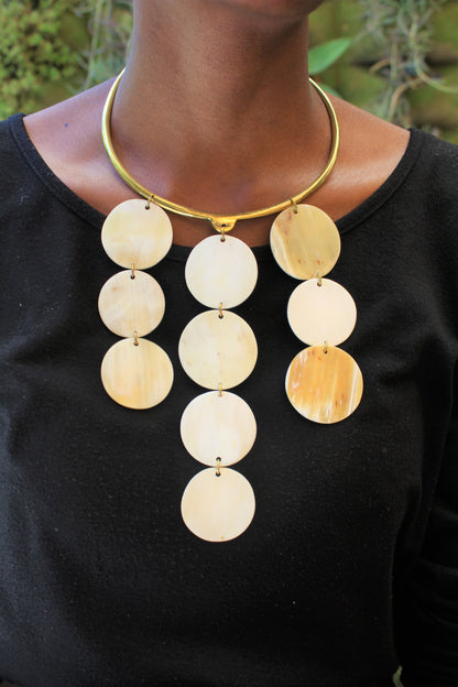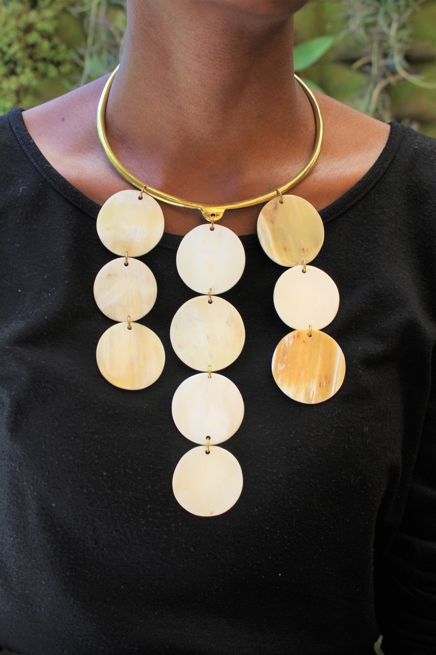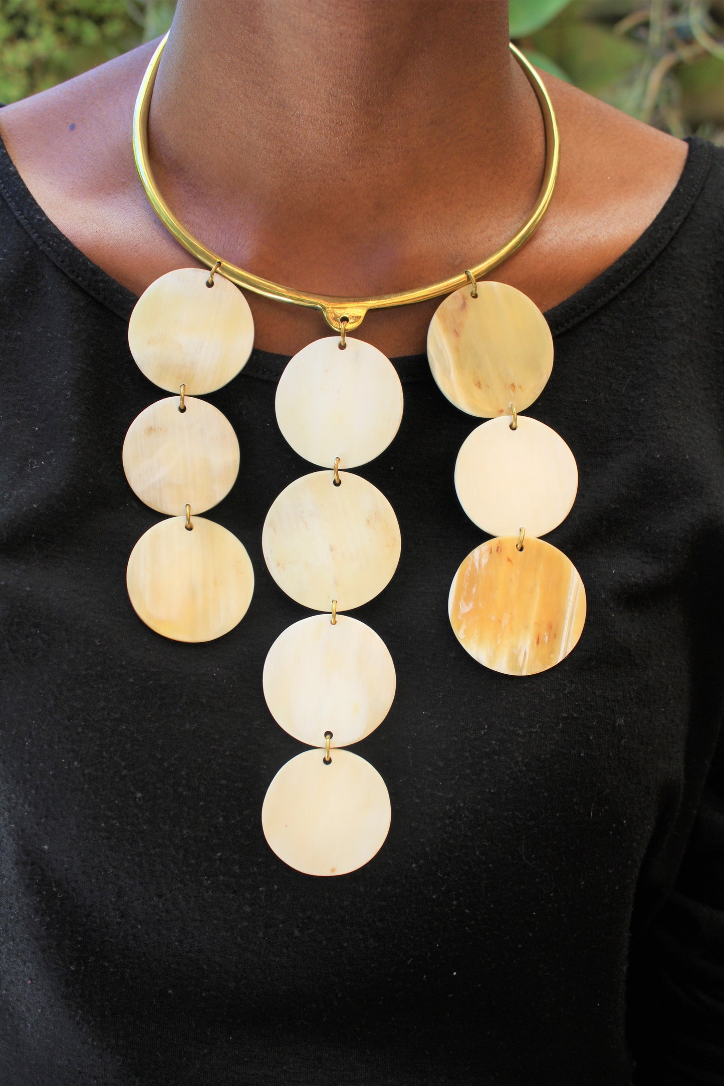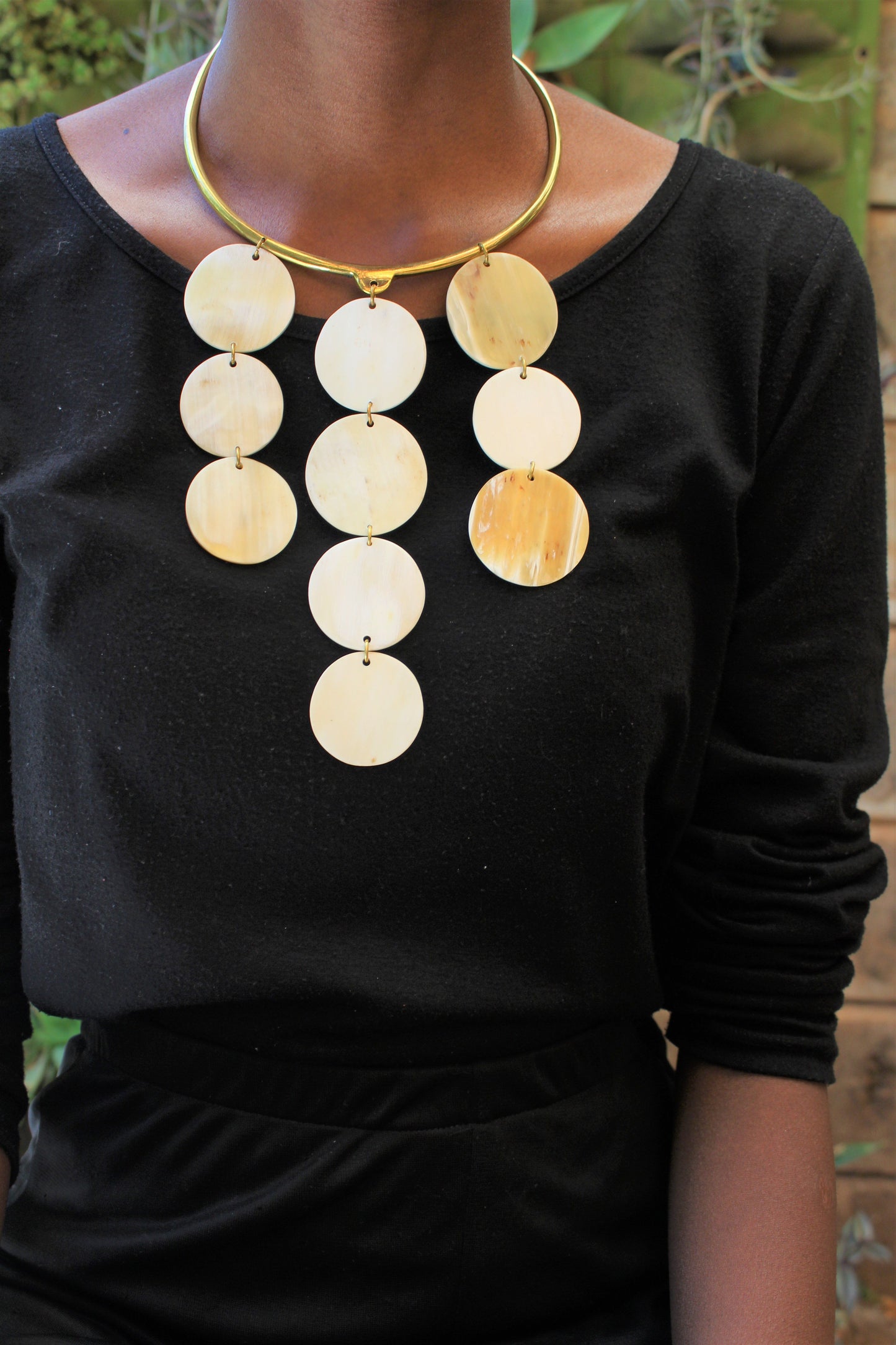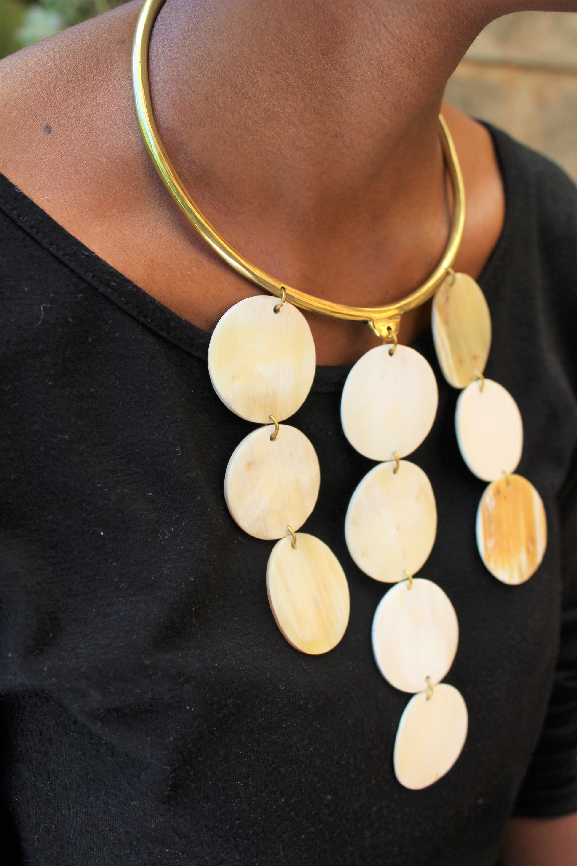 This necklace was carefully crafted by hand in Nairobi, Kenya using brass and horn pendants. It is completed with a stylish brass clasp and has a neck width of 13cm. The necklace itself measures 29.2cm from the clasp to the bottom, and features a unique white horn pendant that measures 3.3cm in length and 3.2cm in width.